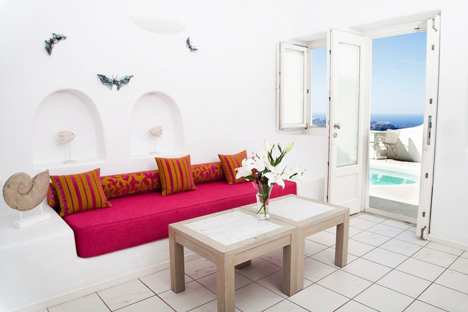 Each accommodation has its own private or semi private terrace or balcony. This means that the space in front of each suite is for you alone to use and is not shared. It does not mean that other people can't see you. As explained our top priority is to preserve the natural beauty of Santorini