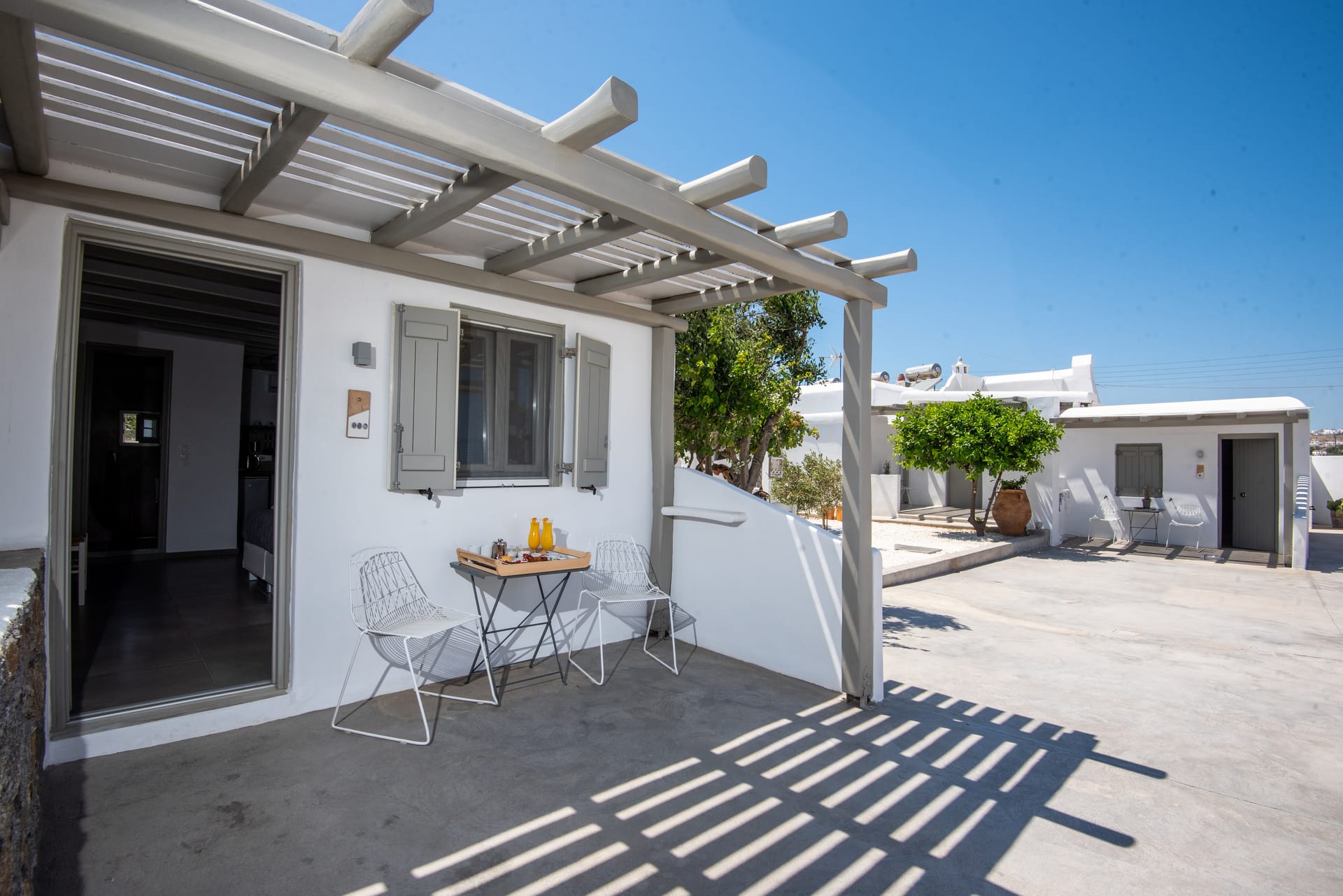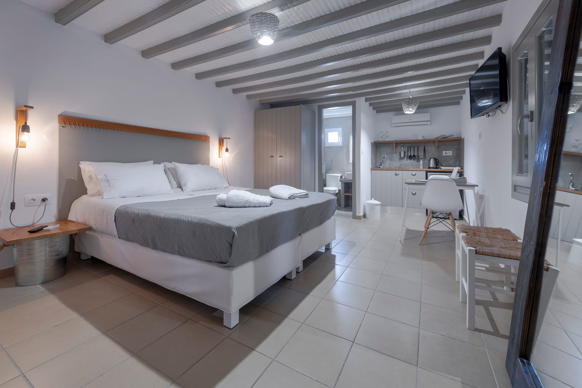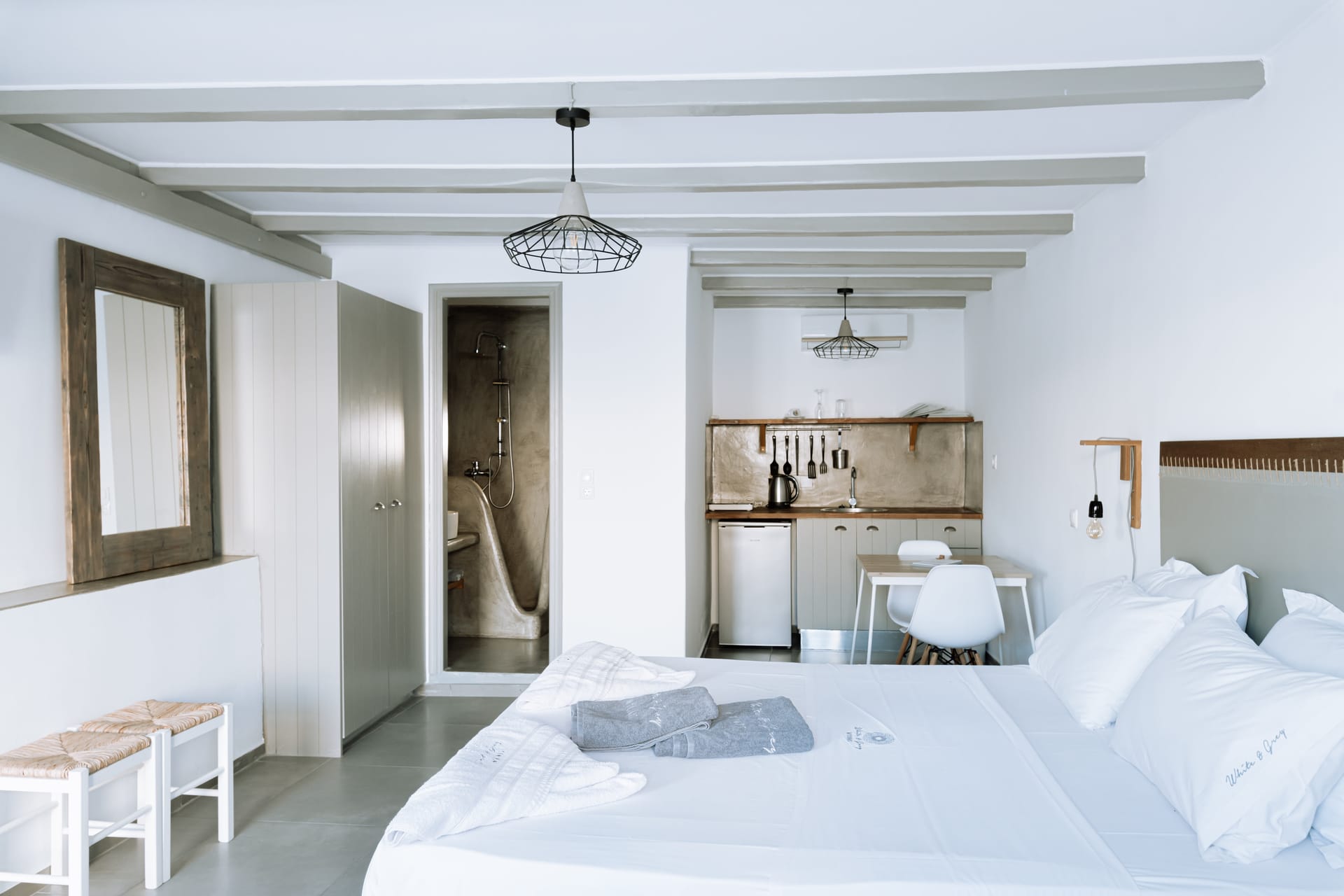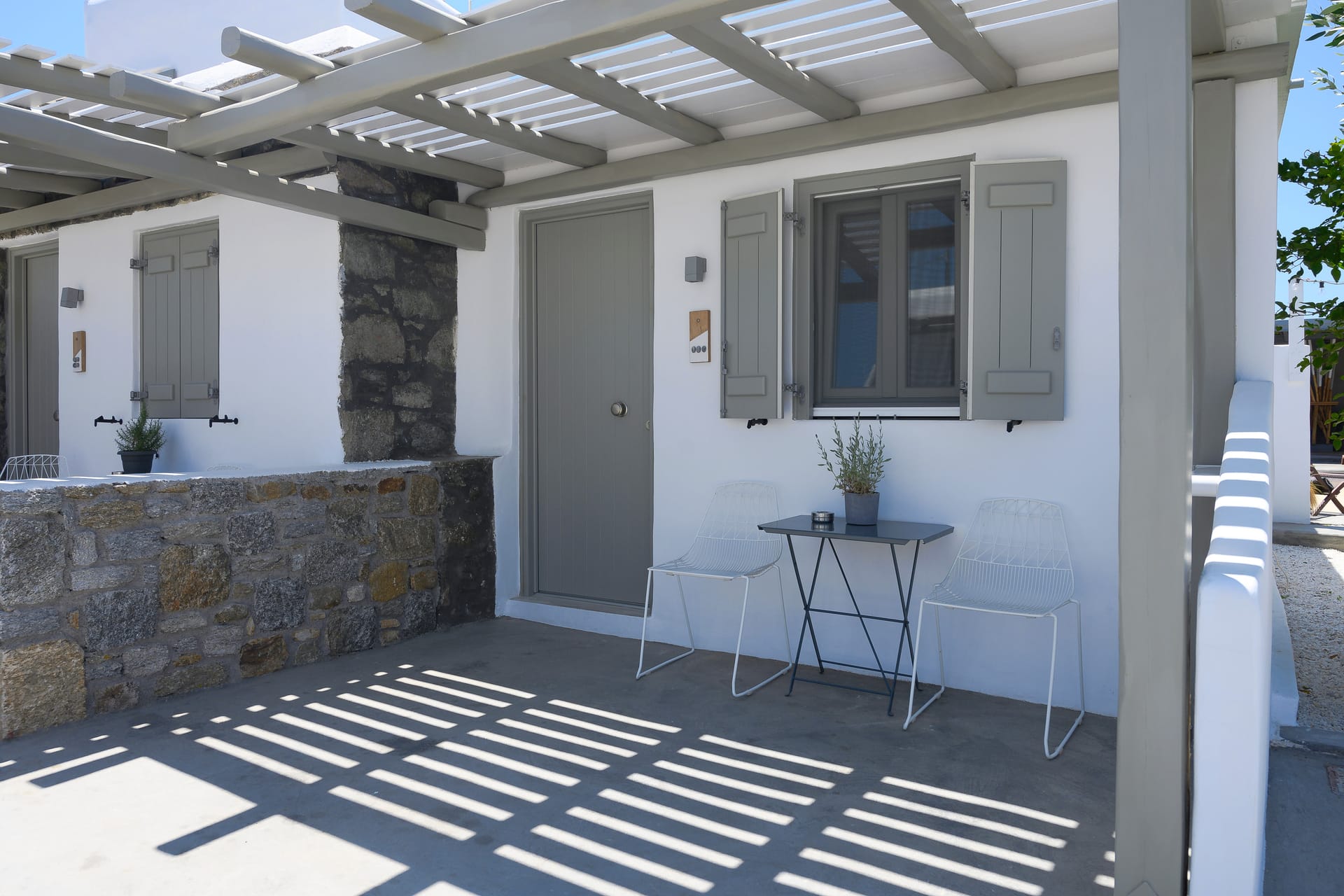 White & Grey is a newly built complex of independent apartments and suites featuring a swimming pool and an outdoor lounge space in Chondros Gkremos area, just 1 km from Mykonos town. Stone, white pebbles and wood are the main materials and decorative elements and the shades of white and grey are dominating, as its name suggests. The stylishly decorated lounge area and the swimming pool with the jacuzzi, will offer you a unique experience of homey feeling and unforgettable moments of relaxation under the Mykonian sky.
