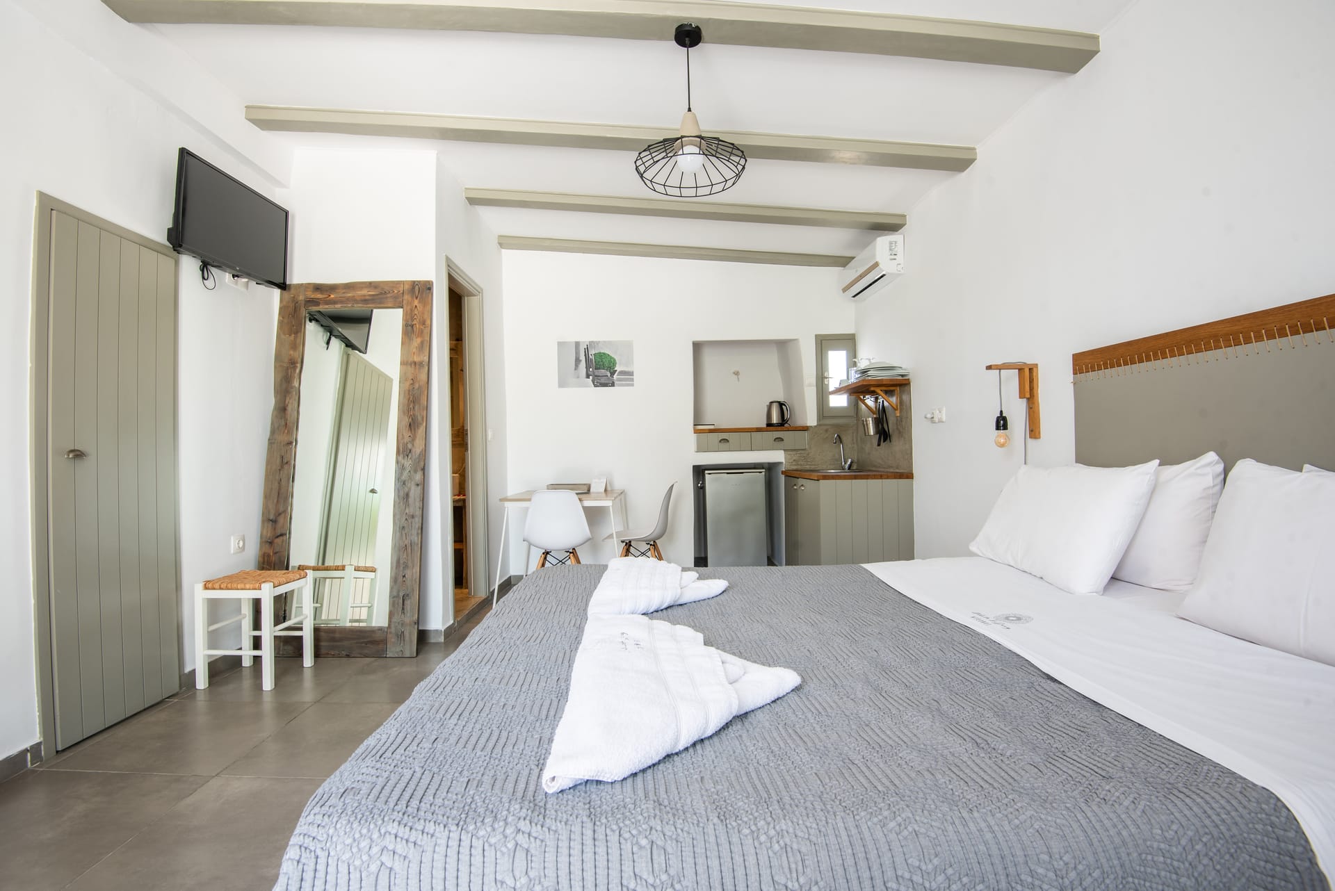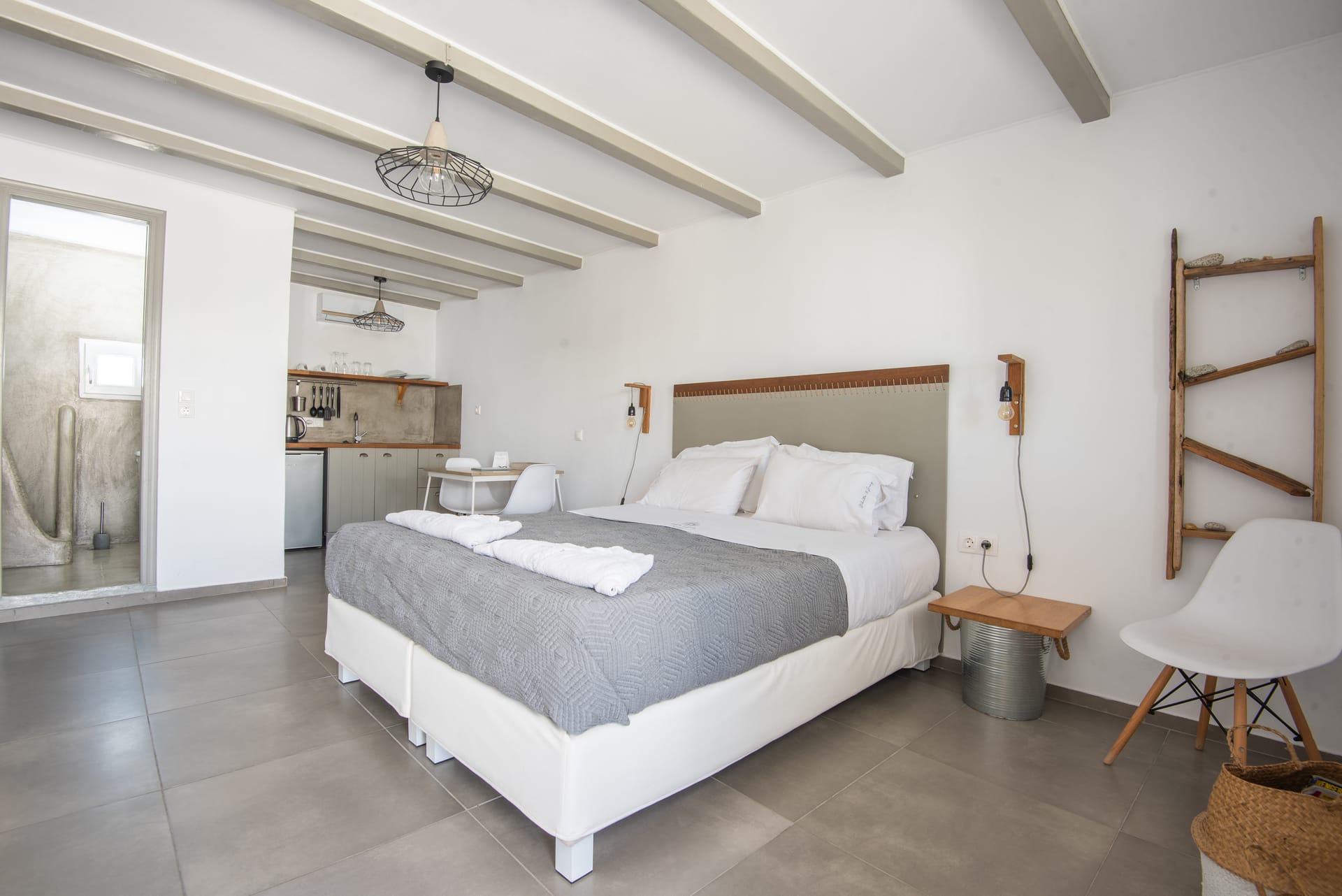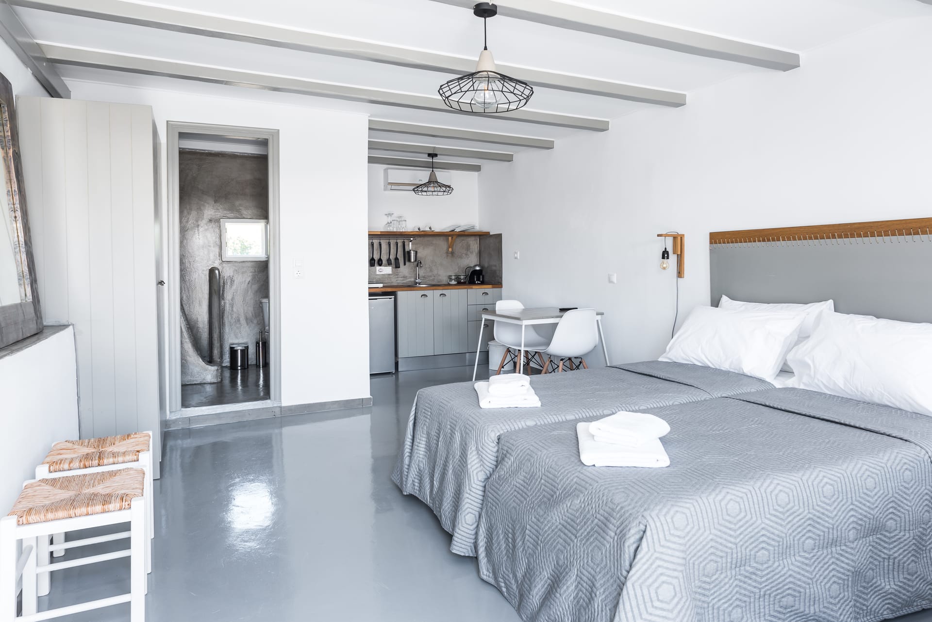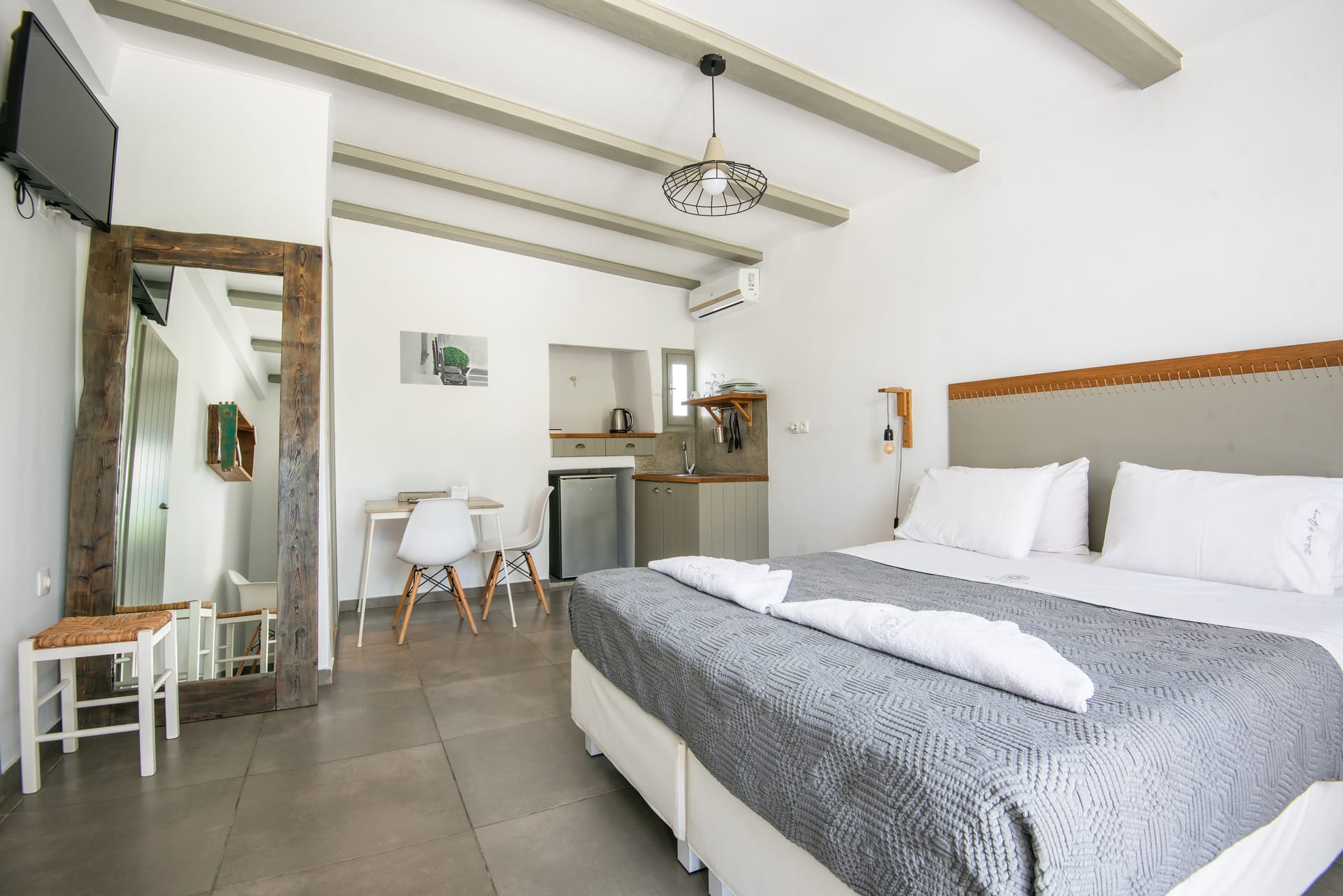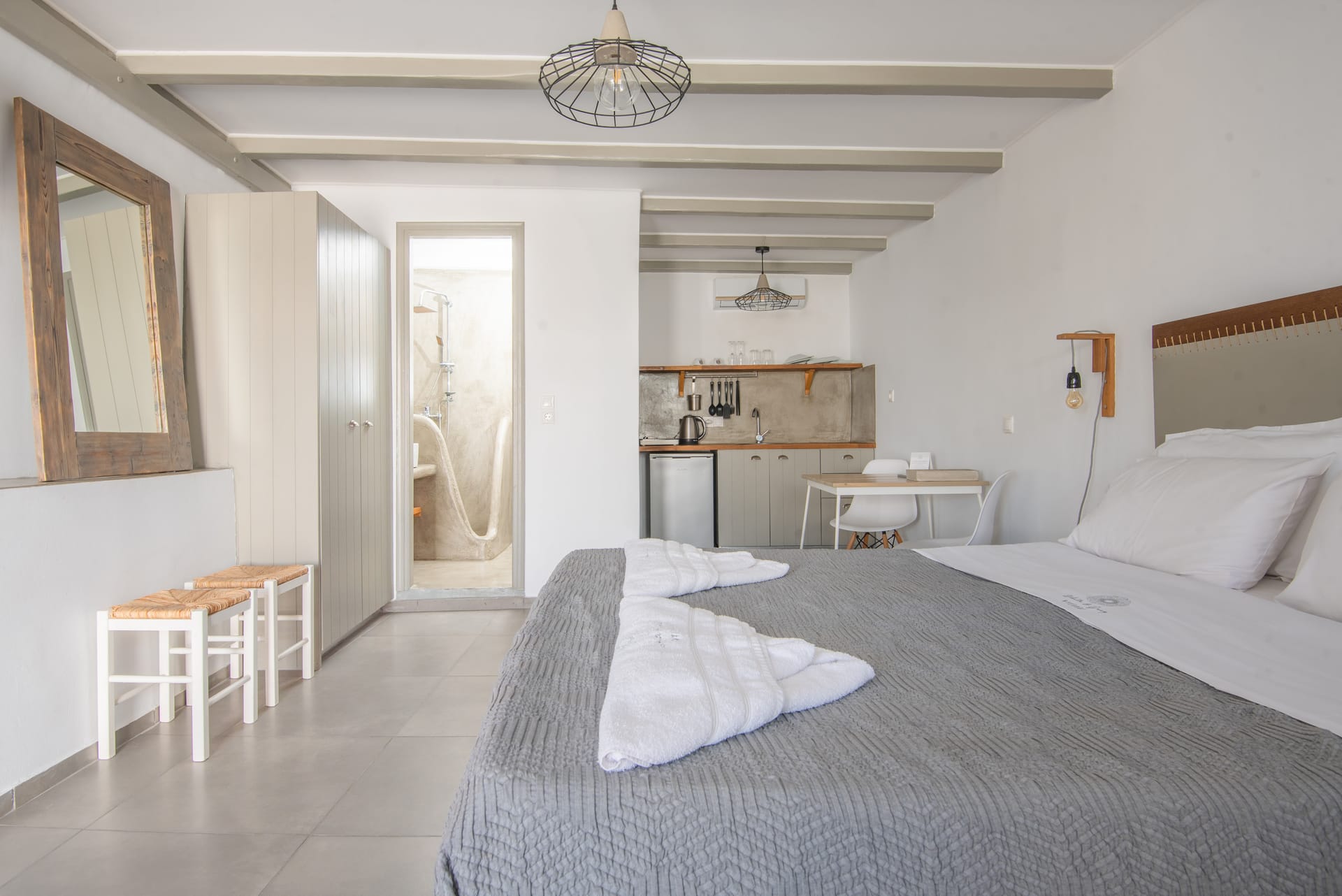 White & Grey is a newly built complex of independent apartments and suites featuring a swimming pool and an outdoor lounge space in Chondros Gkremos area, just 1 km from Mykonos town. Stone, white pebbles and wood are the main materials and decorative elements and the shades of white and grey are dominating, as its name suggests. The stylishly decorated lounge area and the swimming pool with the jacuzzi, will offer you a unique experience of homey feeling and unforgettable moments of relaxation under the Mykonian sky.