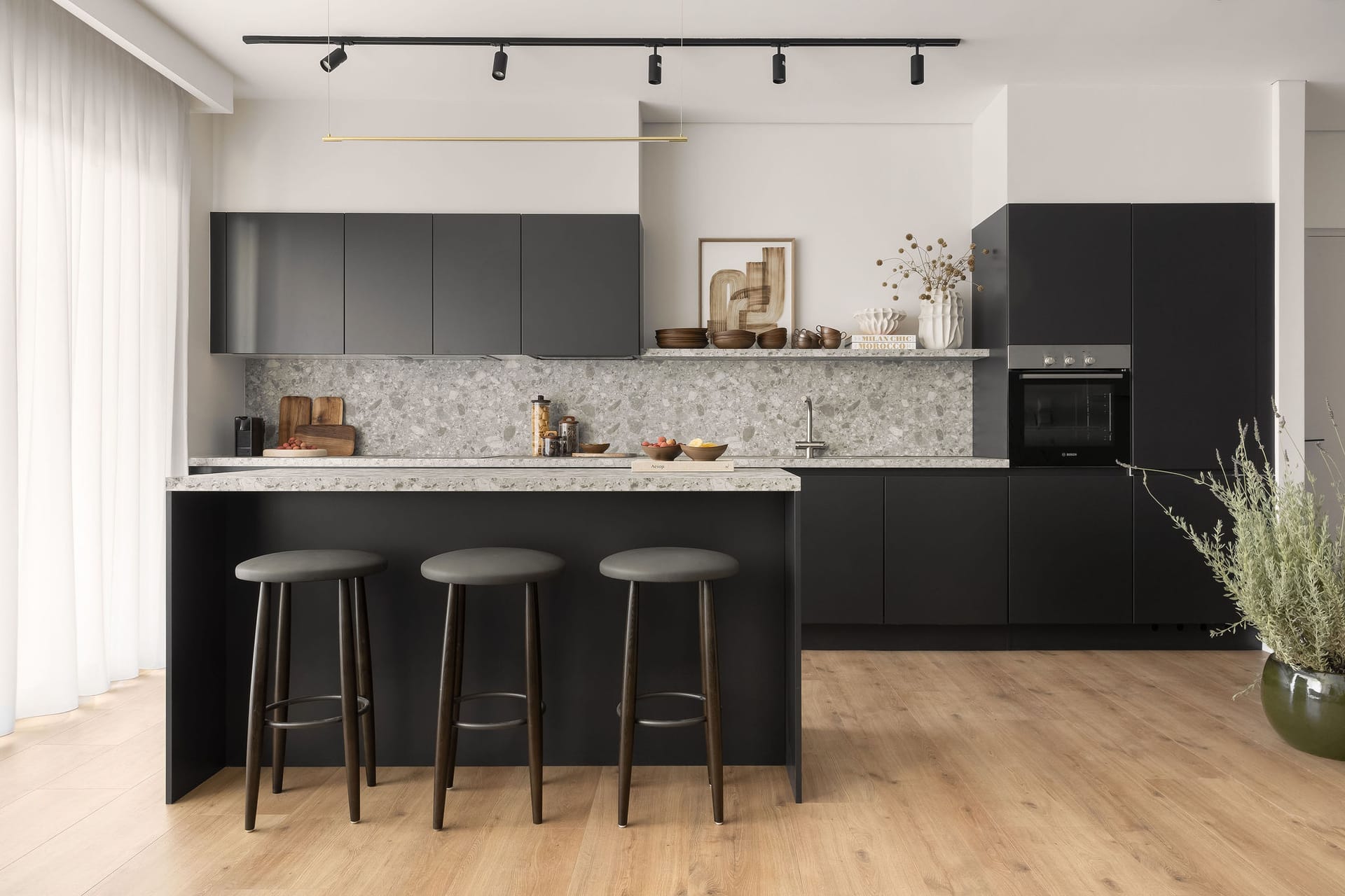 The Skylight Suite is distinguished by its large living room and spacious balcony, The chic and contemporary design enhances the visual appeal and fosters a tranquil vibe perfect for unwinding and entertaining. The suite includes a fully equipped luxurious kitchen with a convenient island, allowing you to prepare your meals and feel at home.