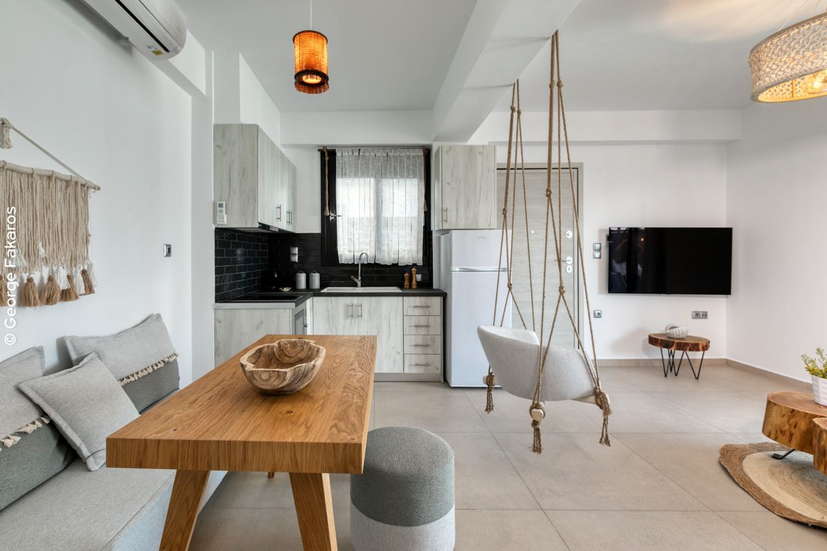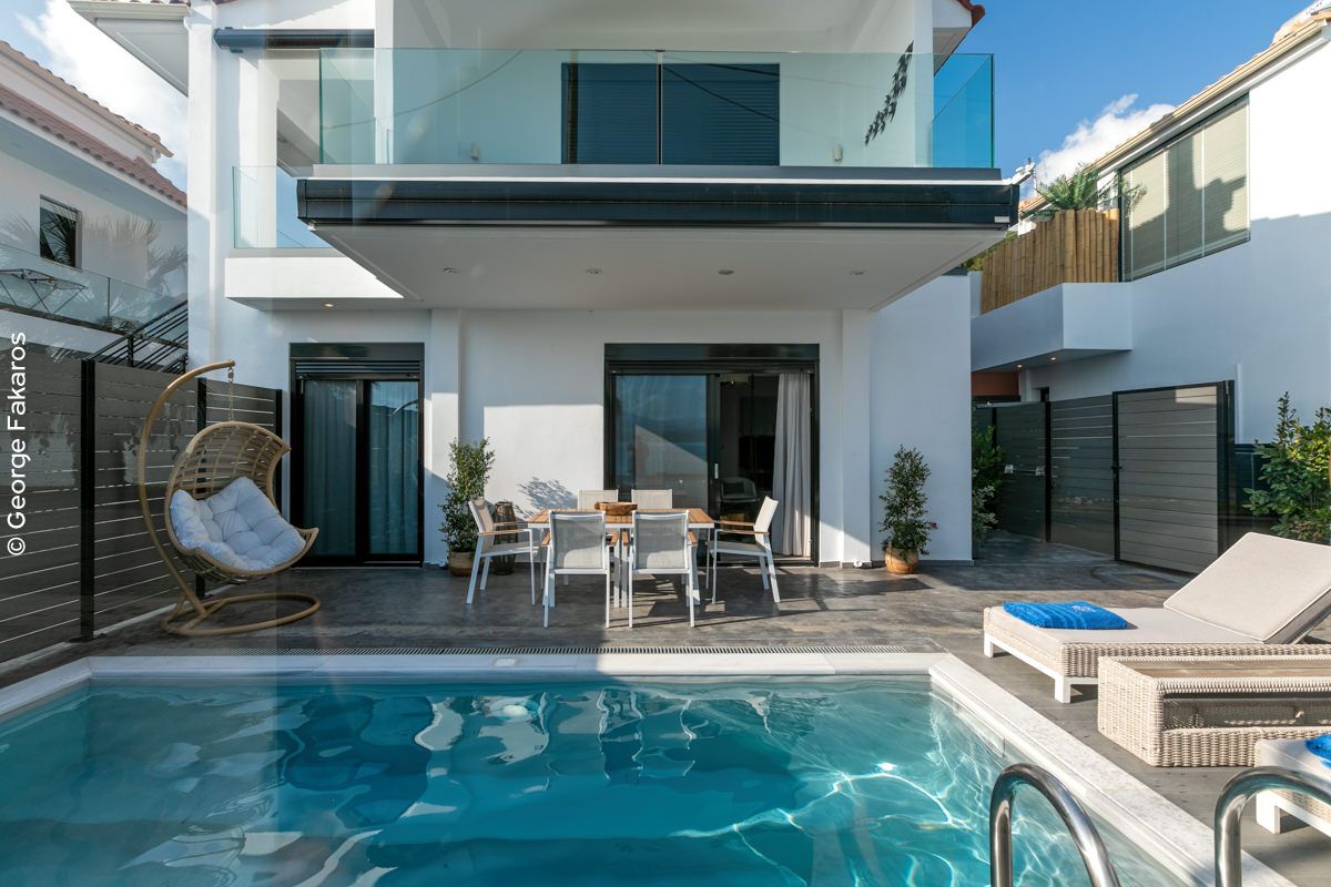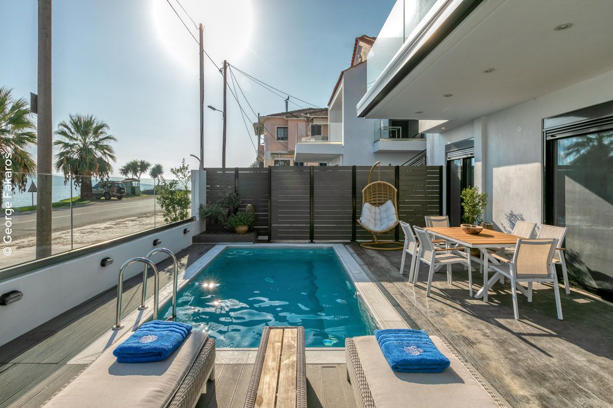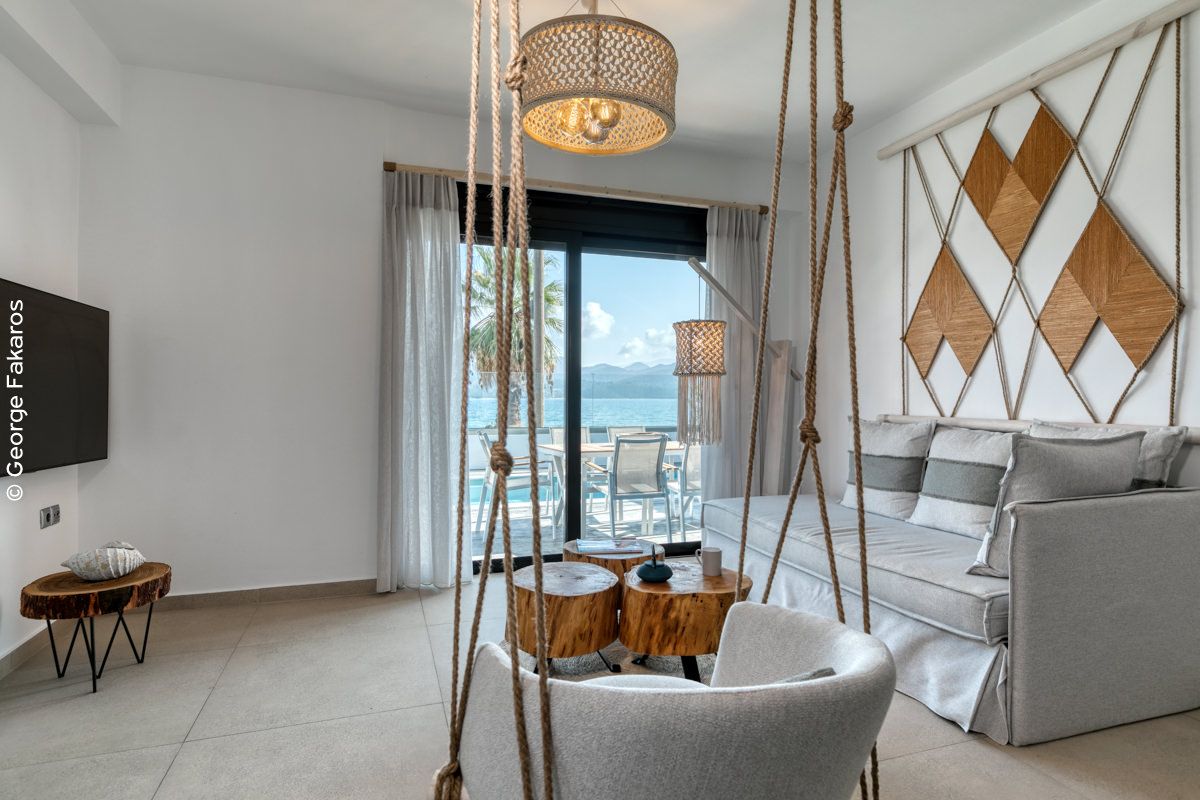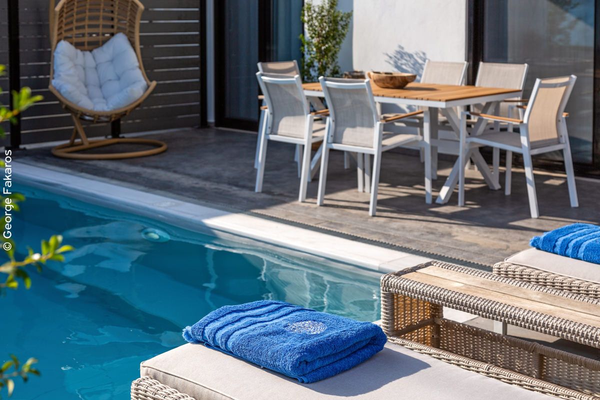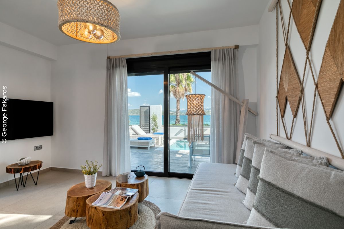 An Elegant Suite with Private Pool, ideal for couples that can accommodate up to 4 guests. Opening the sound-proof windows leads to the terrace with the stunning sea view, a beautifully designed yard and a private pool.