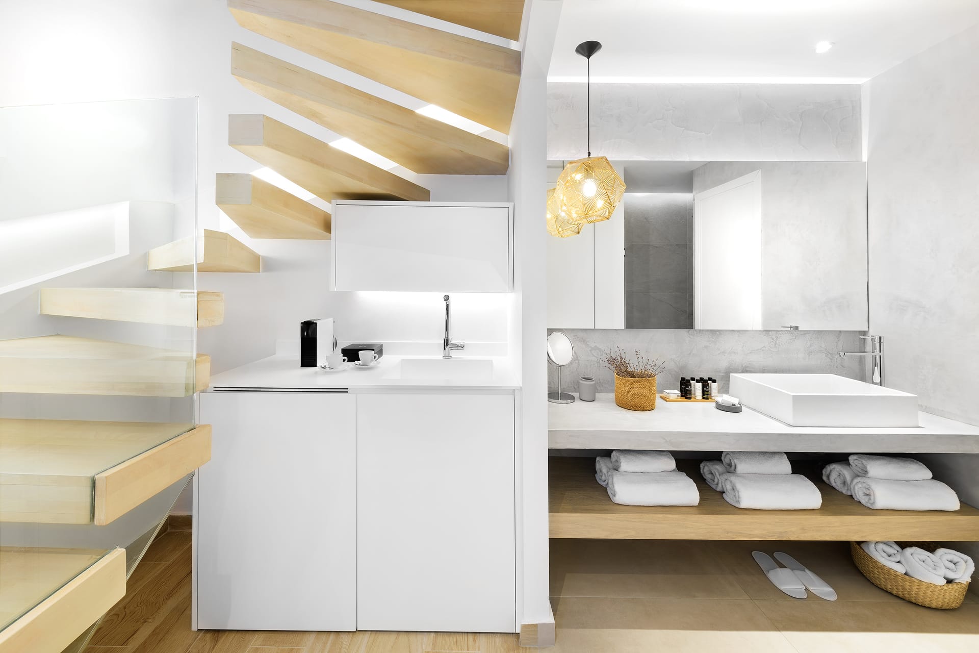 The first floor has a spacious and elegantly furnished hall and living room, filled with light and boasting more of the spectacular view. Art has been specially curated to complement the space, mirroring the natural beauty of Rodia. The second living room opens to a spacious balcony, where you can enjoy a meal or drink while overlooking the countryside. Space here is inviting, and the perfect place for creating memories that will last a lifetime. There is also a master bedroom with an en-suite bathroom on this floor, furnished for guests’ ultimate comfort.