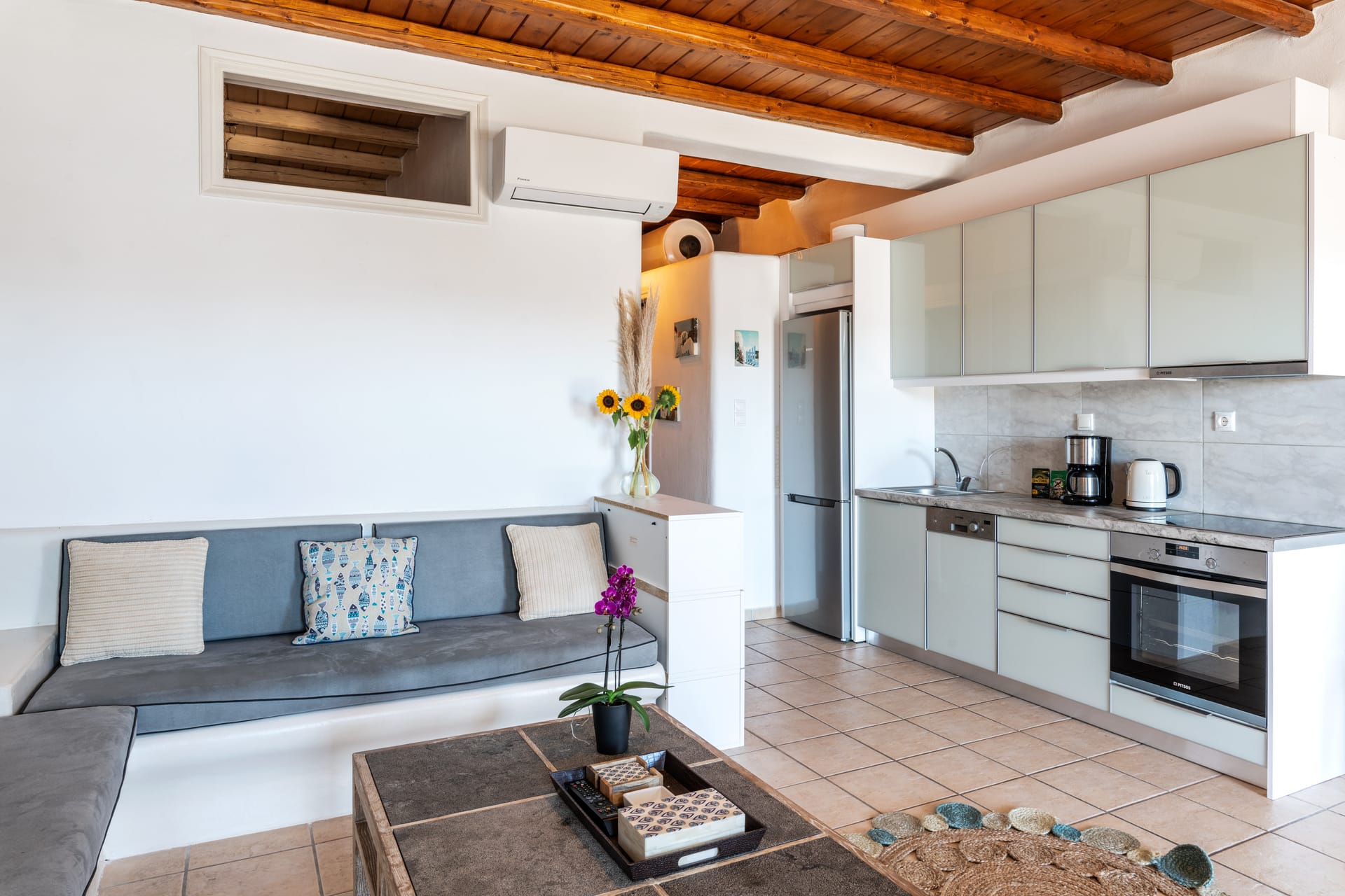 Includes a hudge living room/kitchen area with built in sofas to enjoy family meals or chill overlooking the sea and the shared pool.