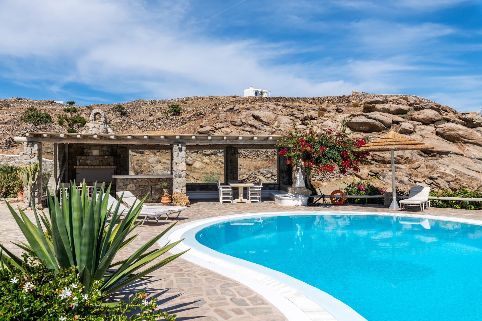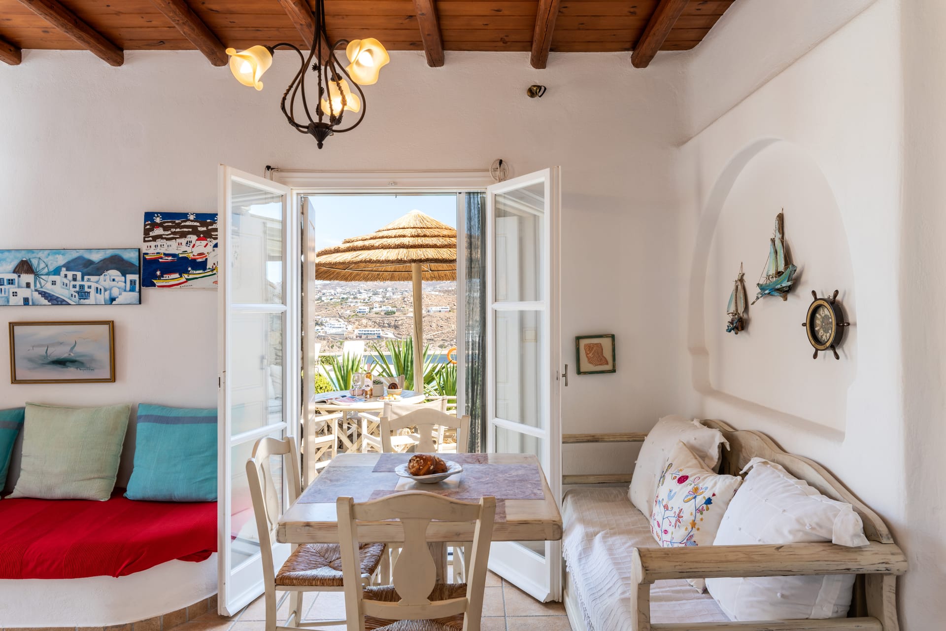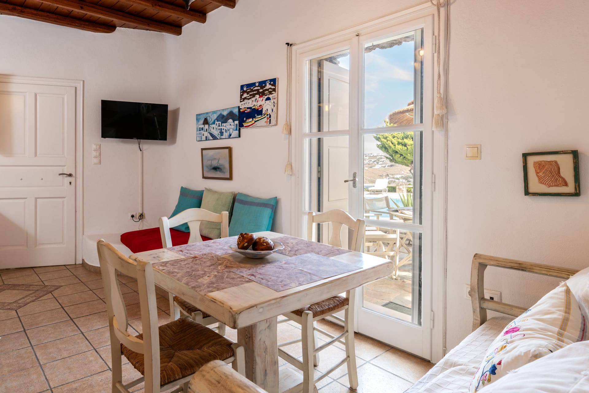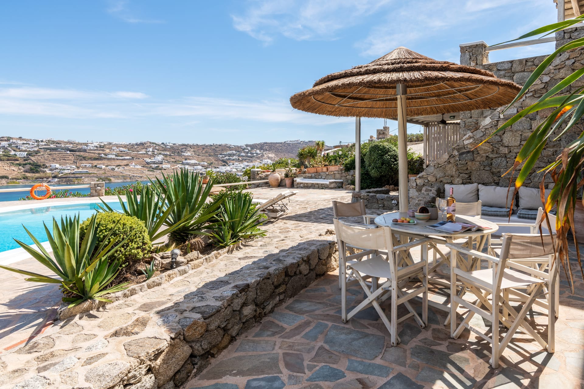 There is a private outdoor area you can dine or relax overlooking the Aegean see and Mýkonos town and the swimming pool