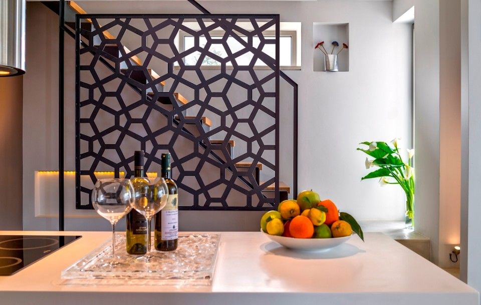 The ground-floor access opens to a spacious living room, with an eco-friendly fireplace at its heart. The open-plan kitchen features practical Corian work surfaces and the latest appliances and incorporates an informal dining area.