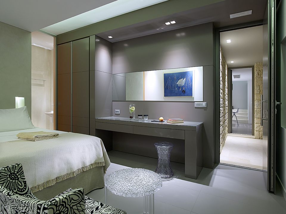 Structured over two distinct floors, with large windows maximizing the natural light, a free-standing metal staircase leads to the master bedroom anden-suite bathroom with bath. Wall-to-wall windows offer uninterrupted views of the Aegean Sea along with the additional feature of a large balcony and outdoor seating space.