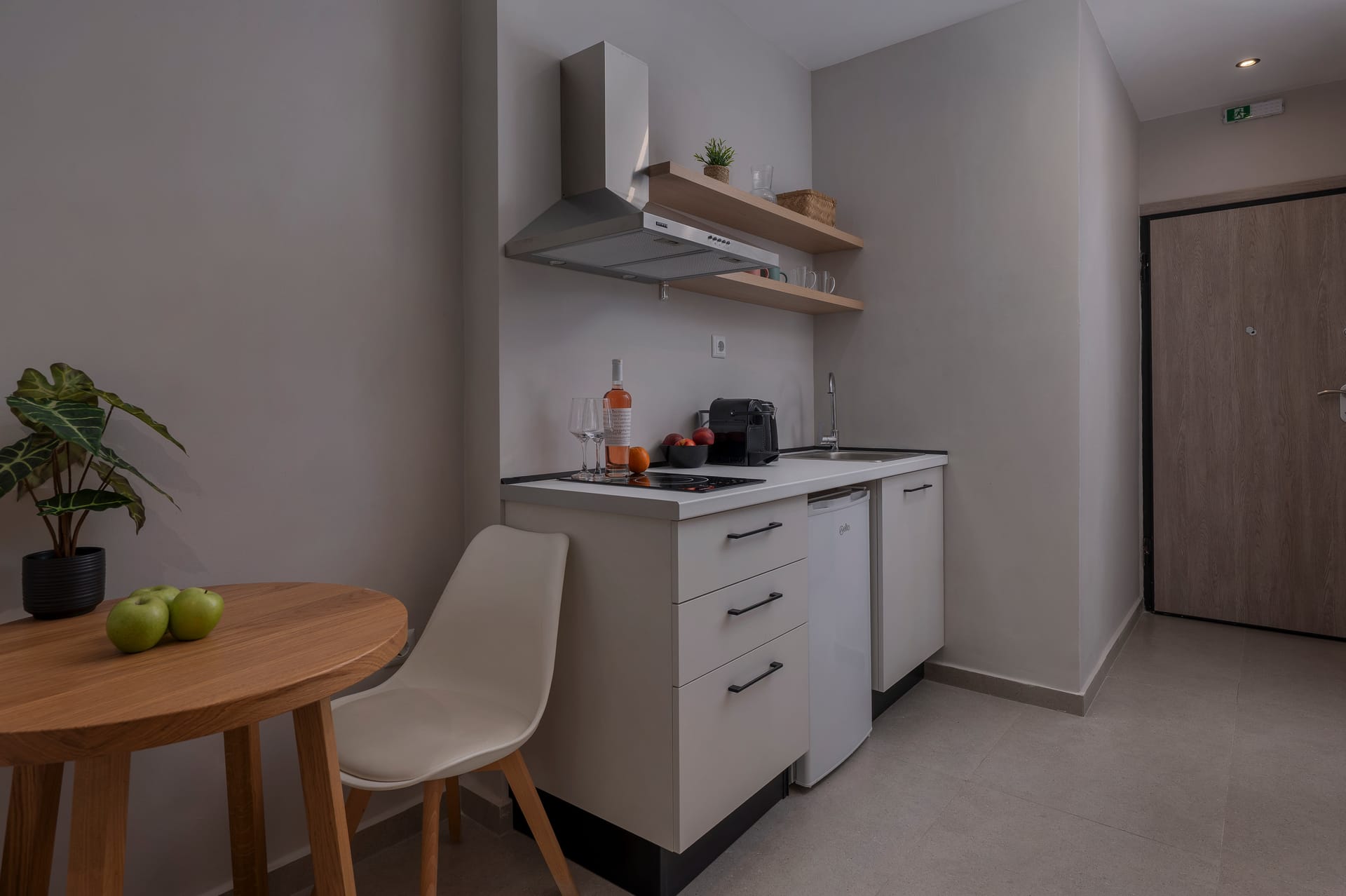 Kitchen equipped with refrigerator, radiator, coffee maker, household utensils (glasses, dishes, loft, pot, cutlery)