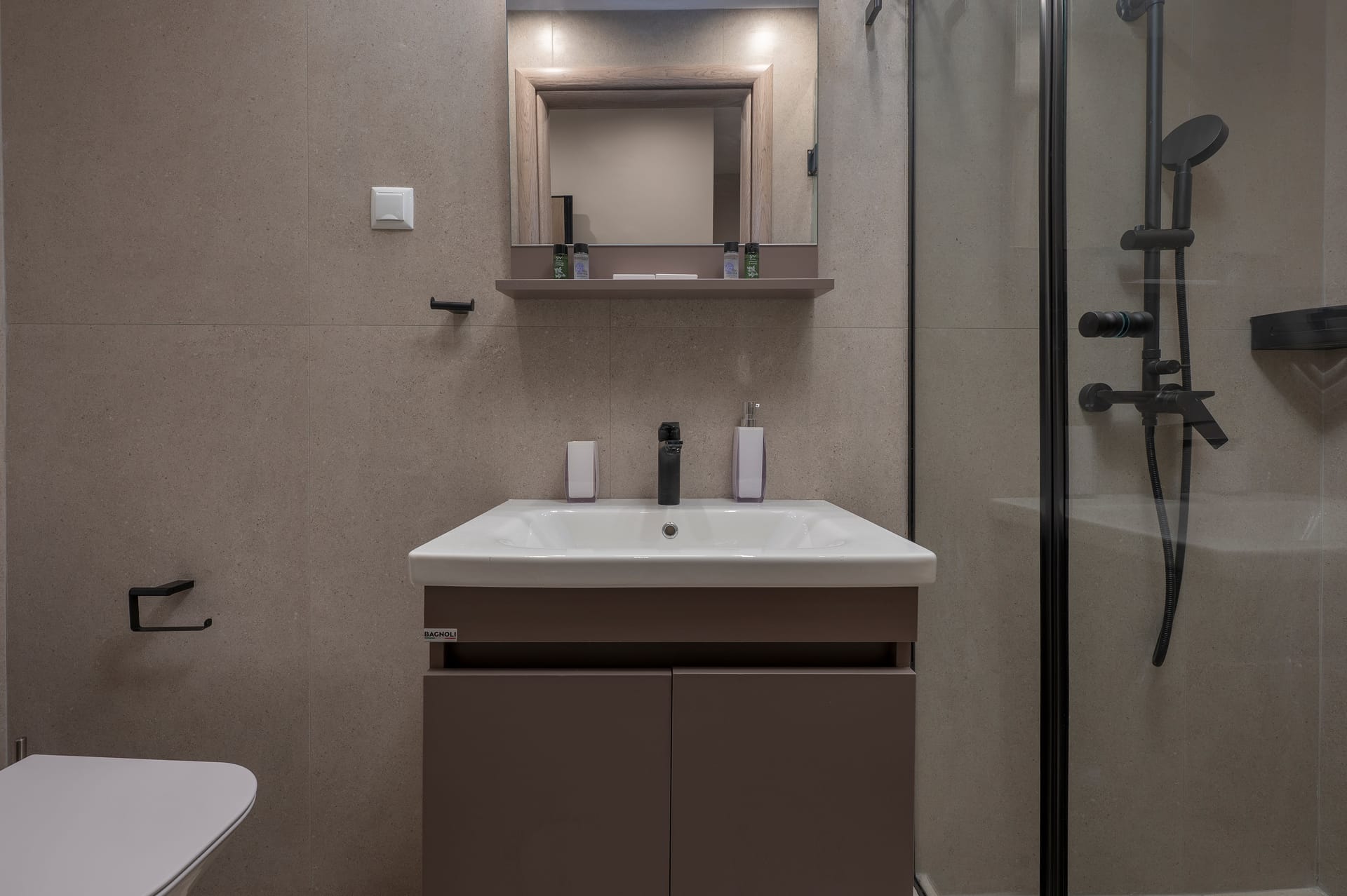 - Bathroom with cabin, hangers, hand soap, shower gel and shampoo