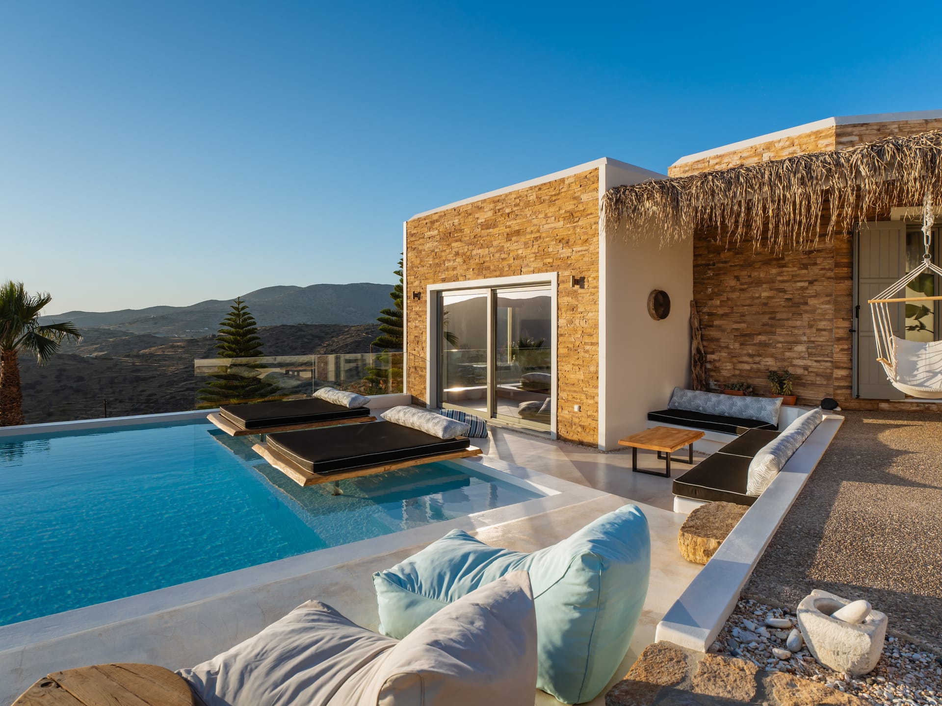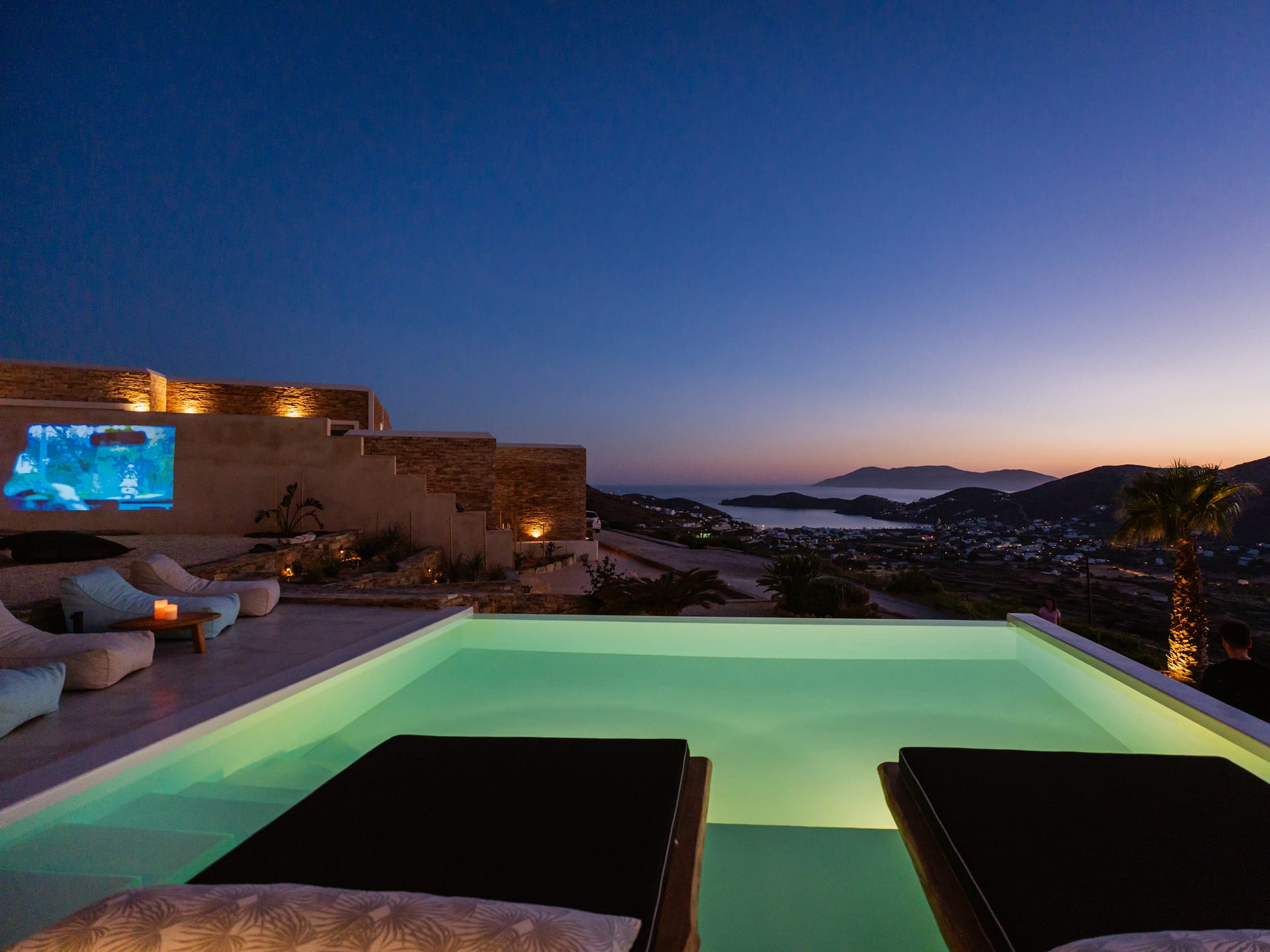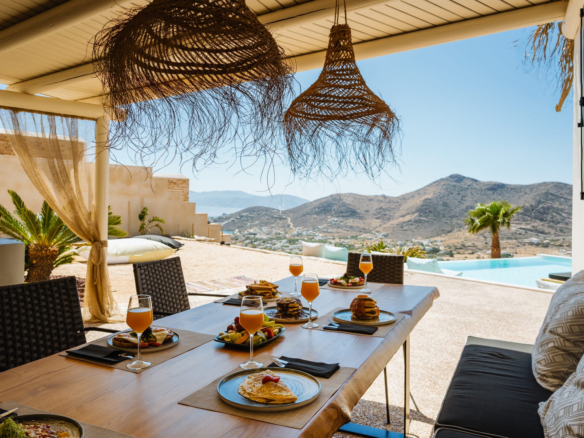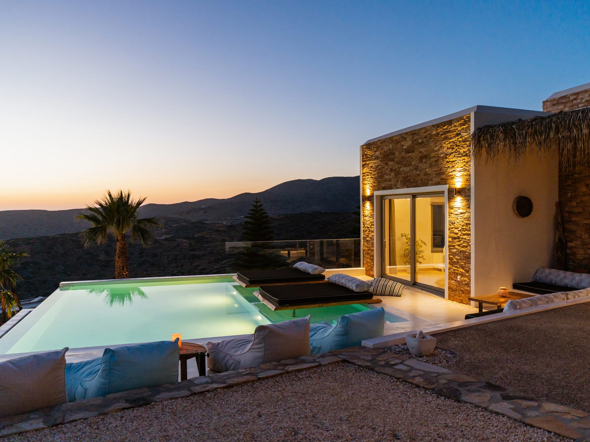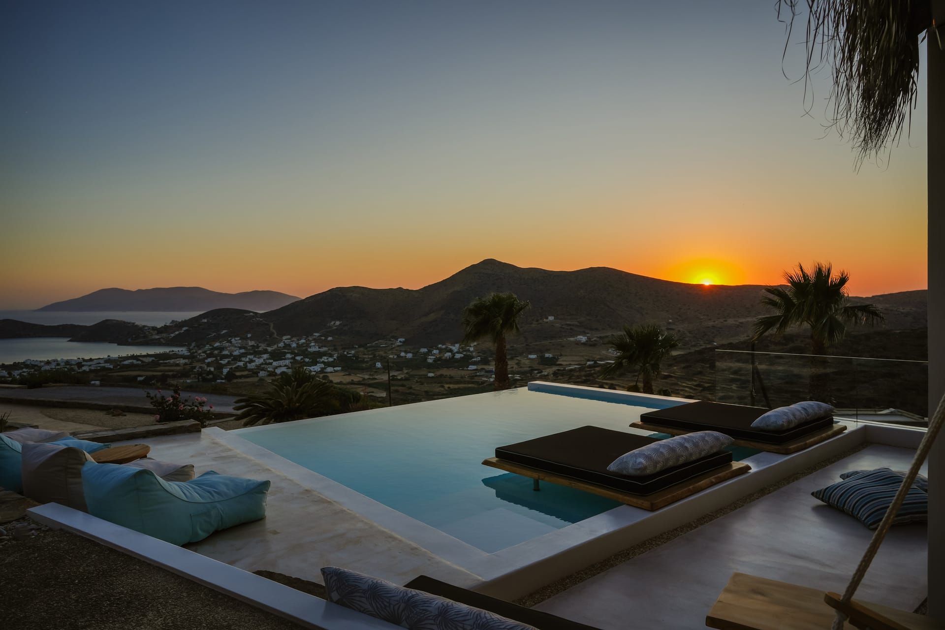 Independent Villa with great views and beautiful sunset. The villa is located in a quiet part of Ios Bouris.Can accommodate up to 8 adults as there are 4 bedrooms and 4 bathrooms , a big kitchen area ,dining table and a living room that looks the outside pool area and the sunset !The outside area has a private pool overlooking the sunset,sitting area ,dining table and barbecue facilities.