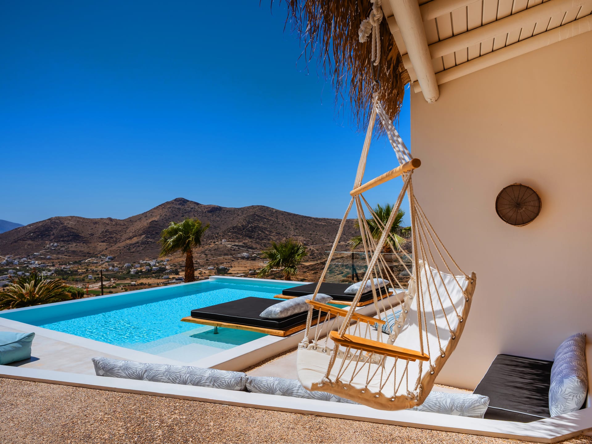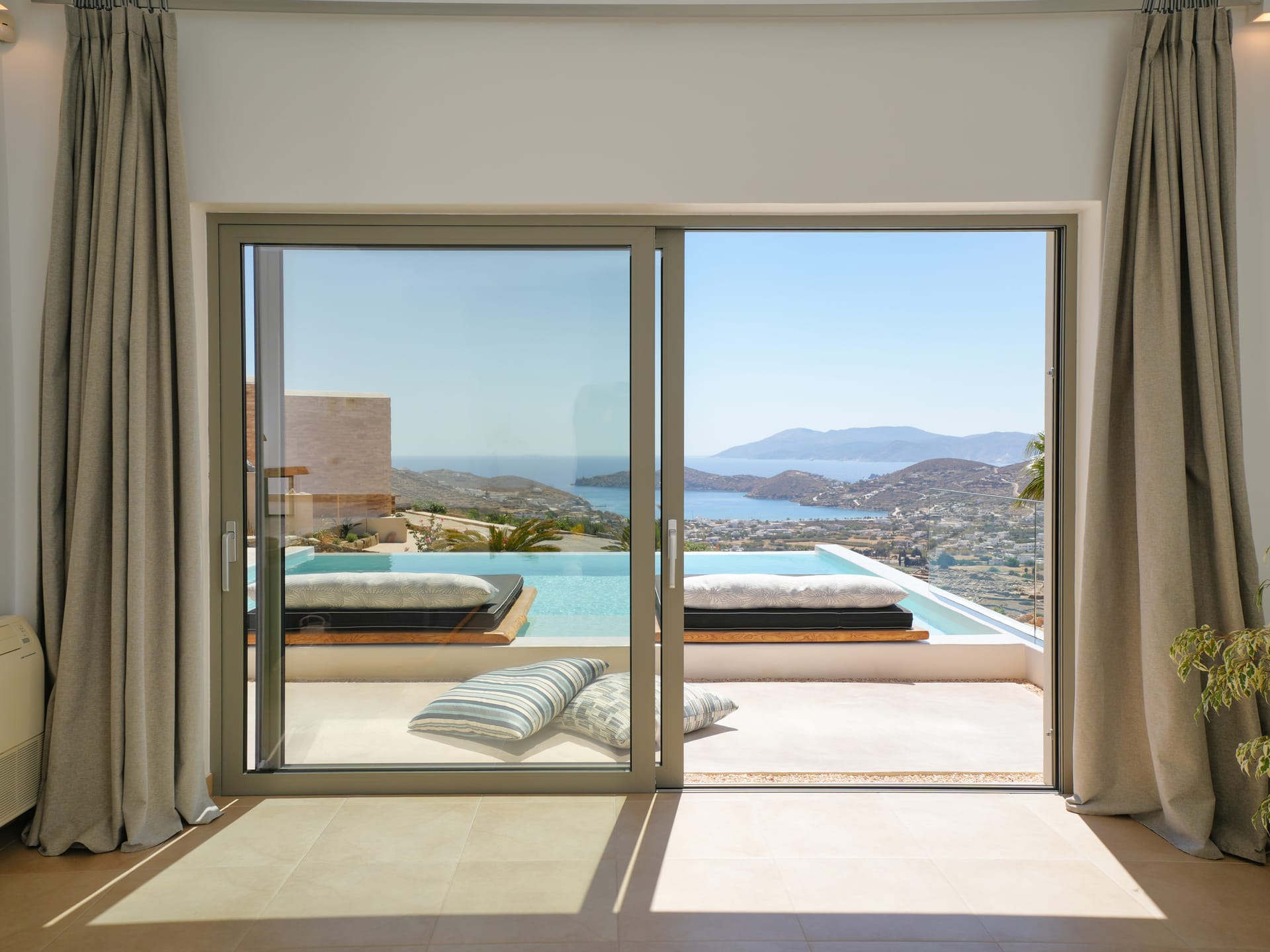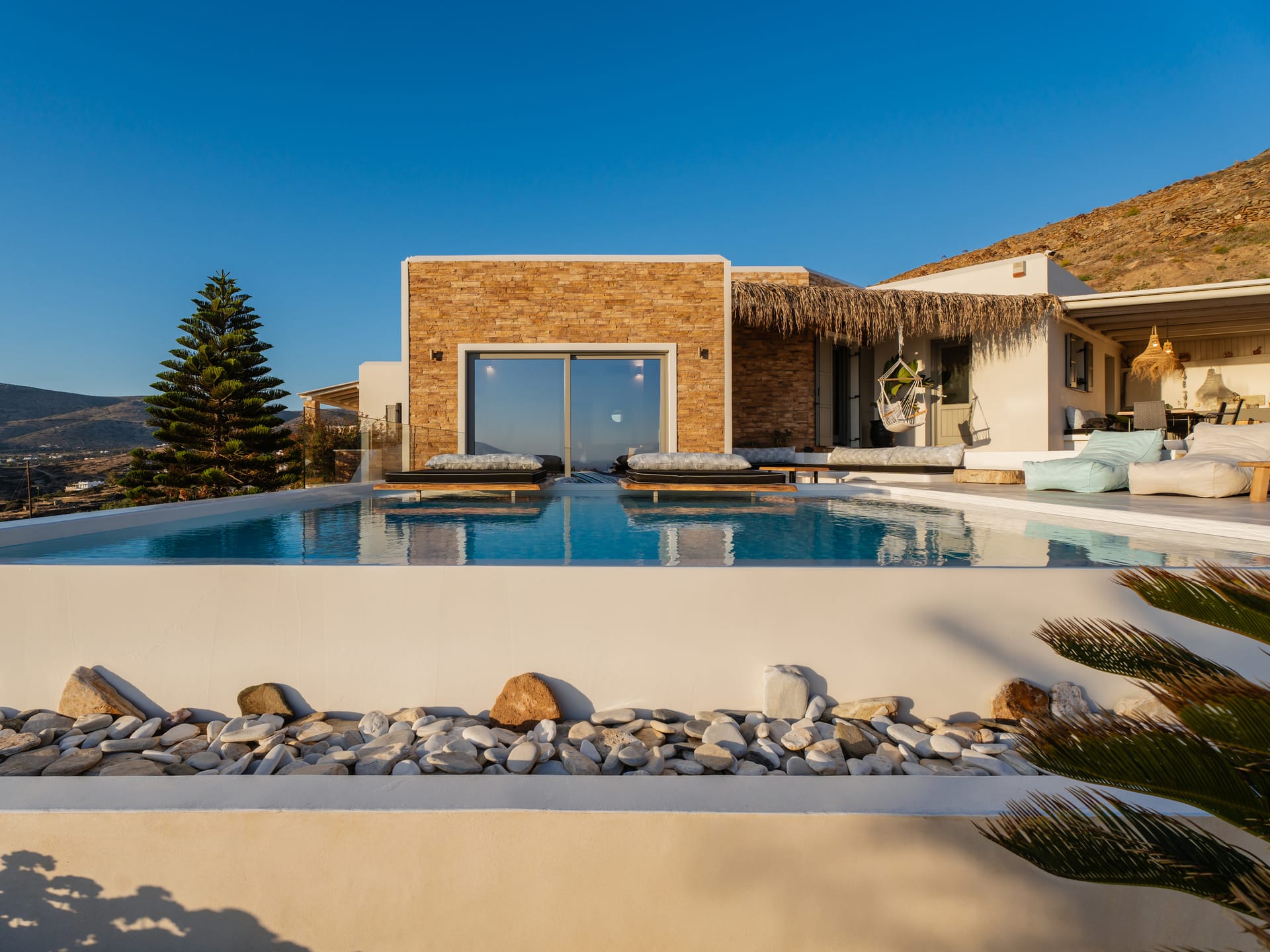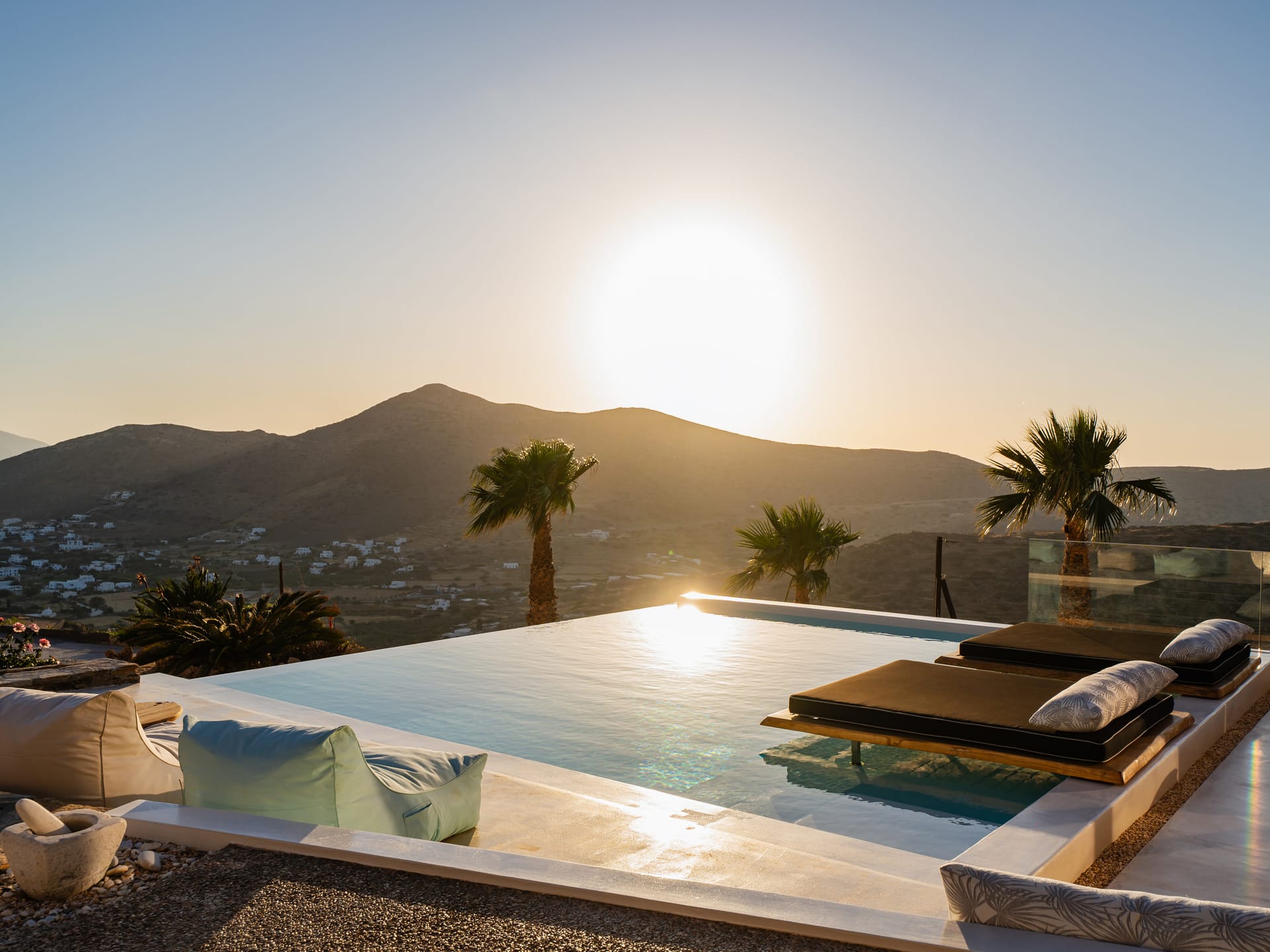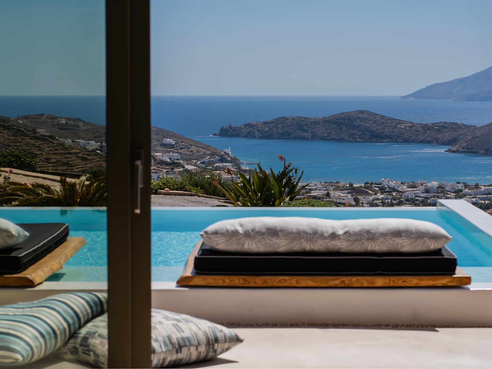 Independent Villa with great views and beautiful sunset. The villa is located in a quiet part of Ios Bouris.Can accommodate up to 8 adults as there are 4 bedrooms and 4 bathrooms , a big kitchen area ,dining table and a living room that looks the outside pool area and the sunset !The outside area has a private pool overlooking the sunset,sitting area ,dining table and barbecue facilities.