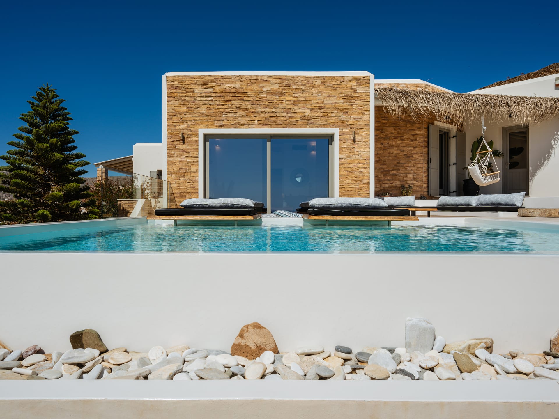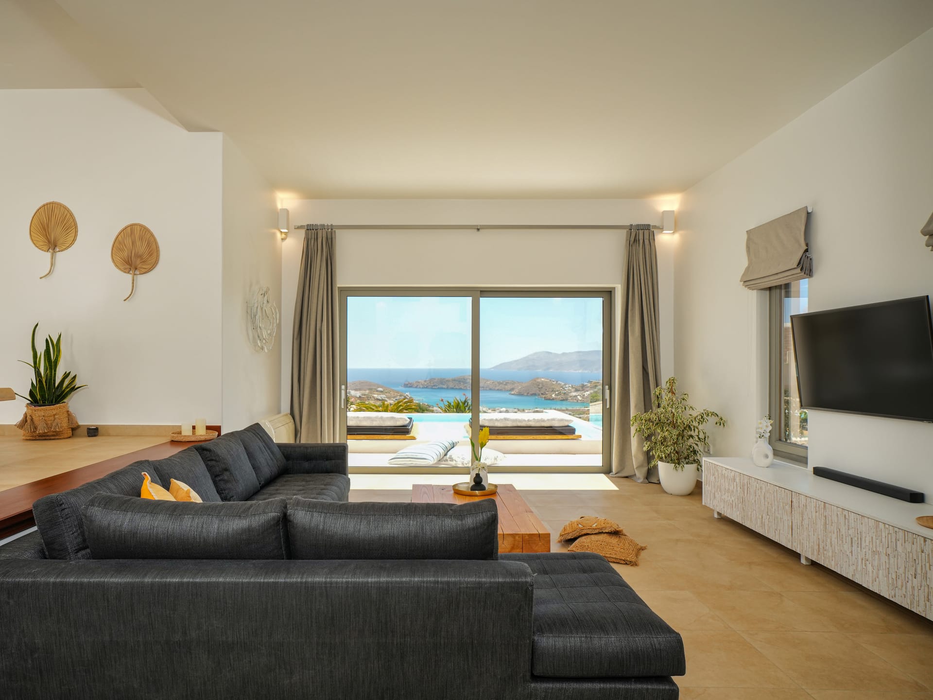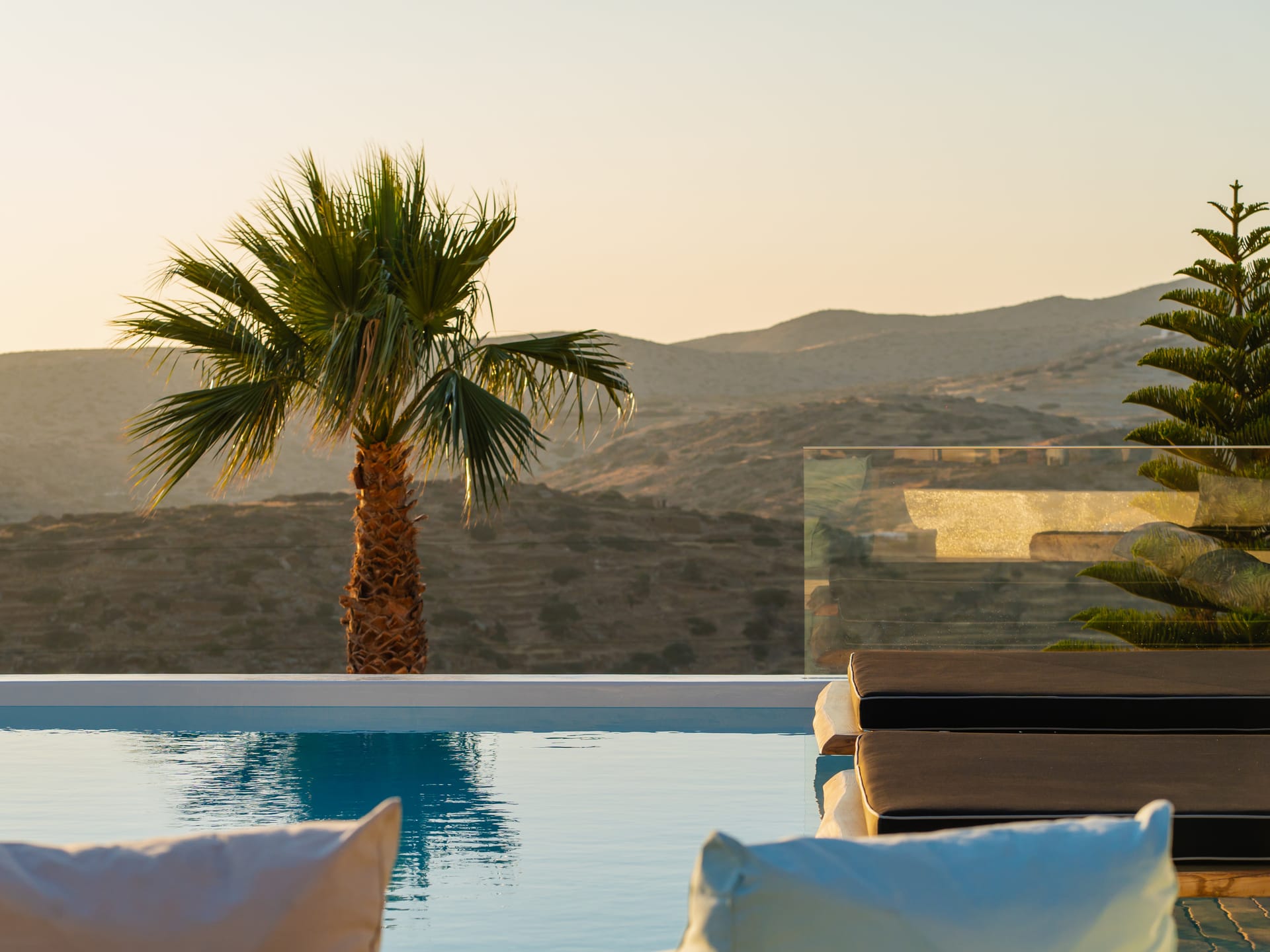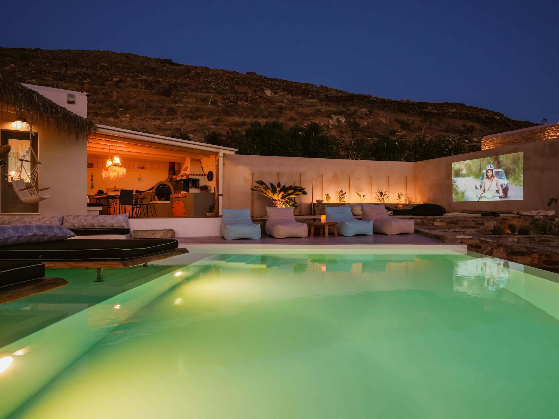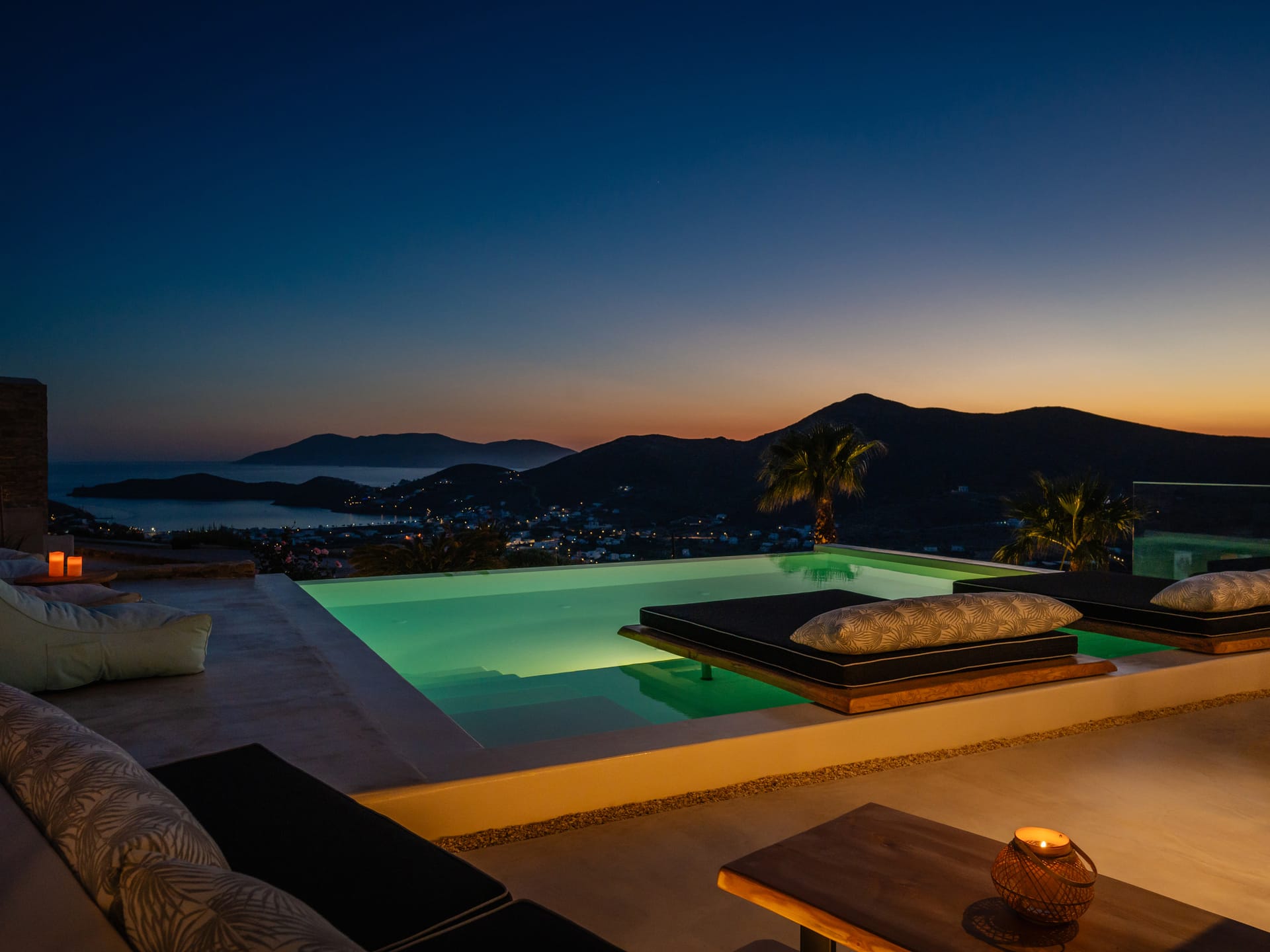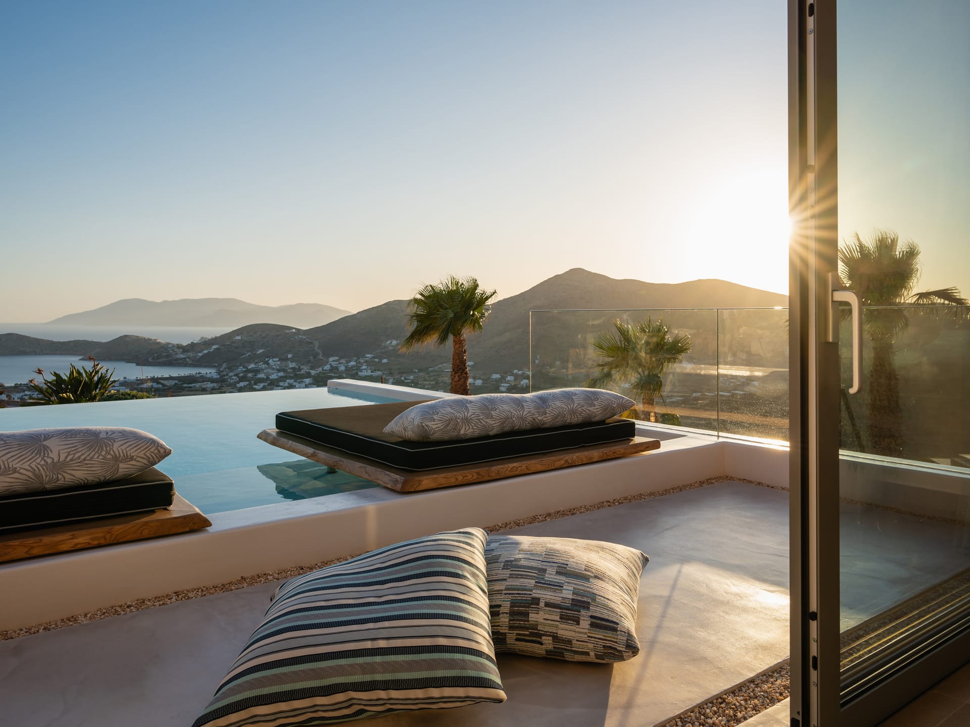 Independent Villa with great views and beautiful sunset. The villa is located in a quiet part of Ios Bouris.Can accommodate up to 8 adults as there are 4 bedrooms and 4 bathrooms , a big kitchen area ,dining table and a living room that looks the outside pool area and the sunset !The outside area has a private pool overlooking the sunset,sitting area ,dining table and barbecue facilities.