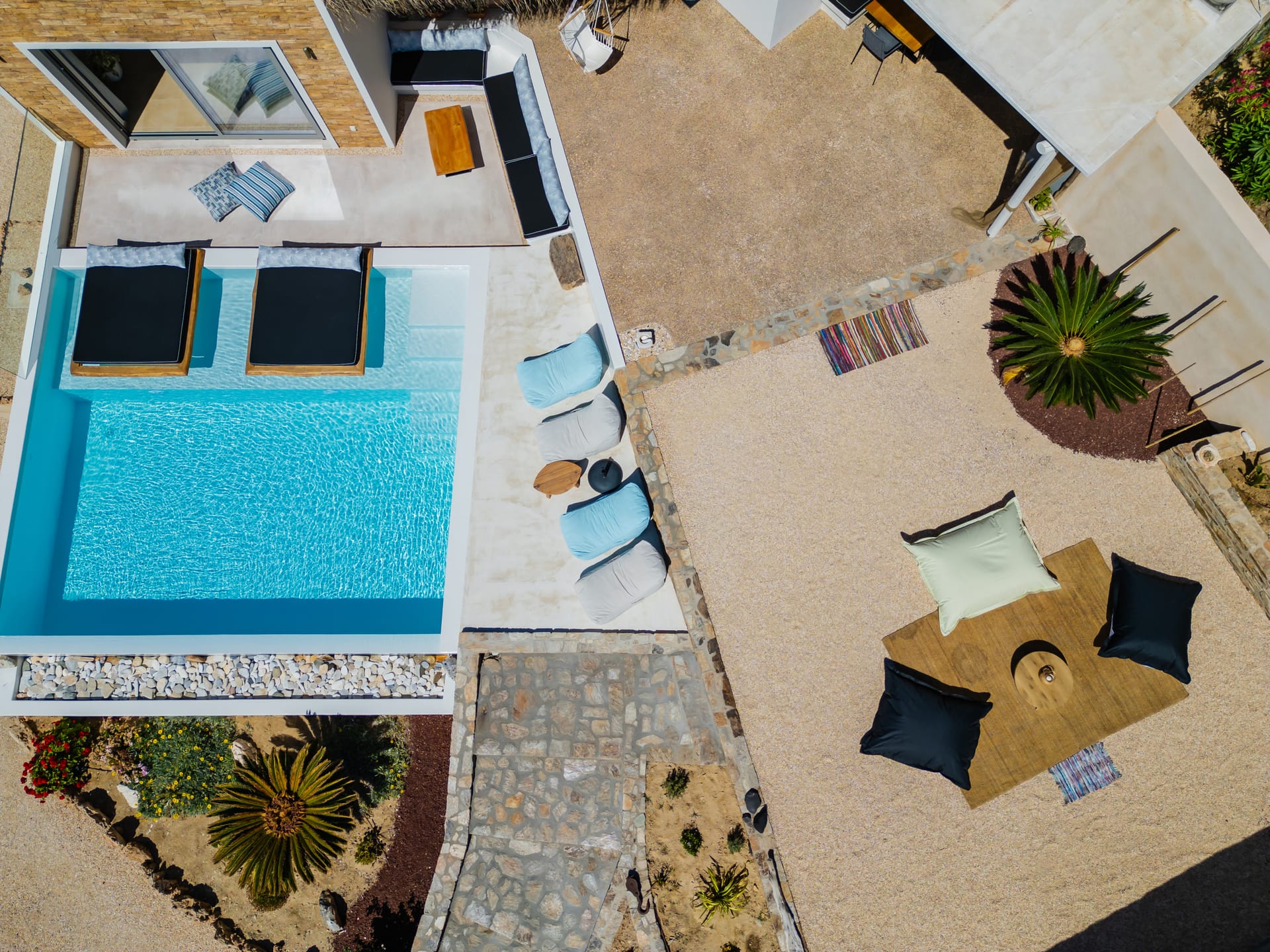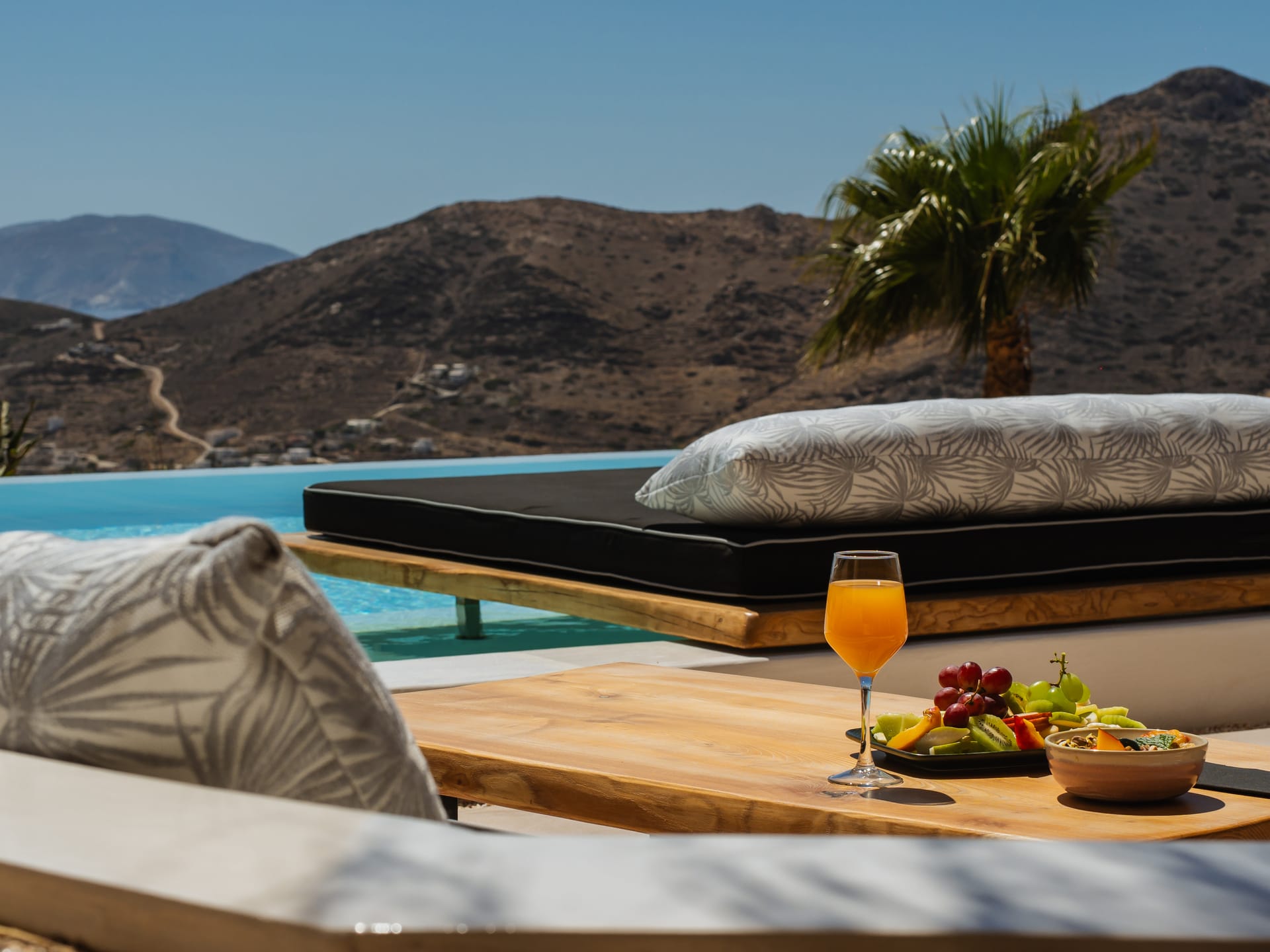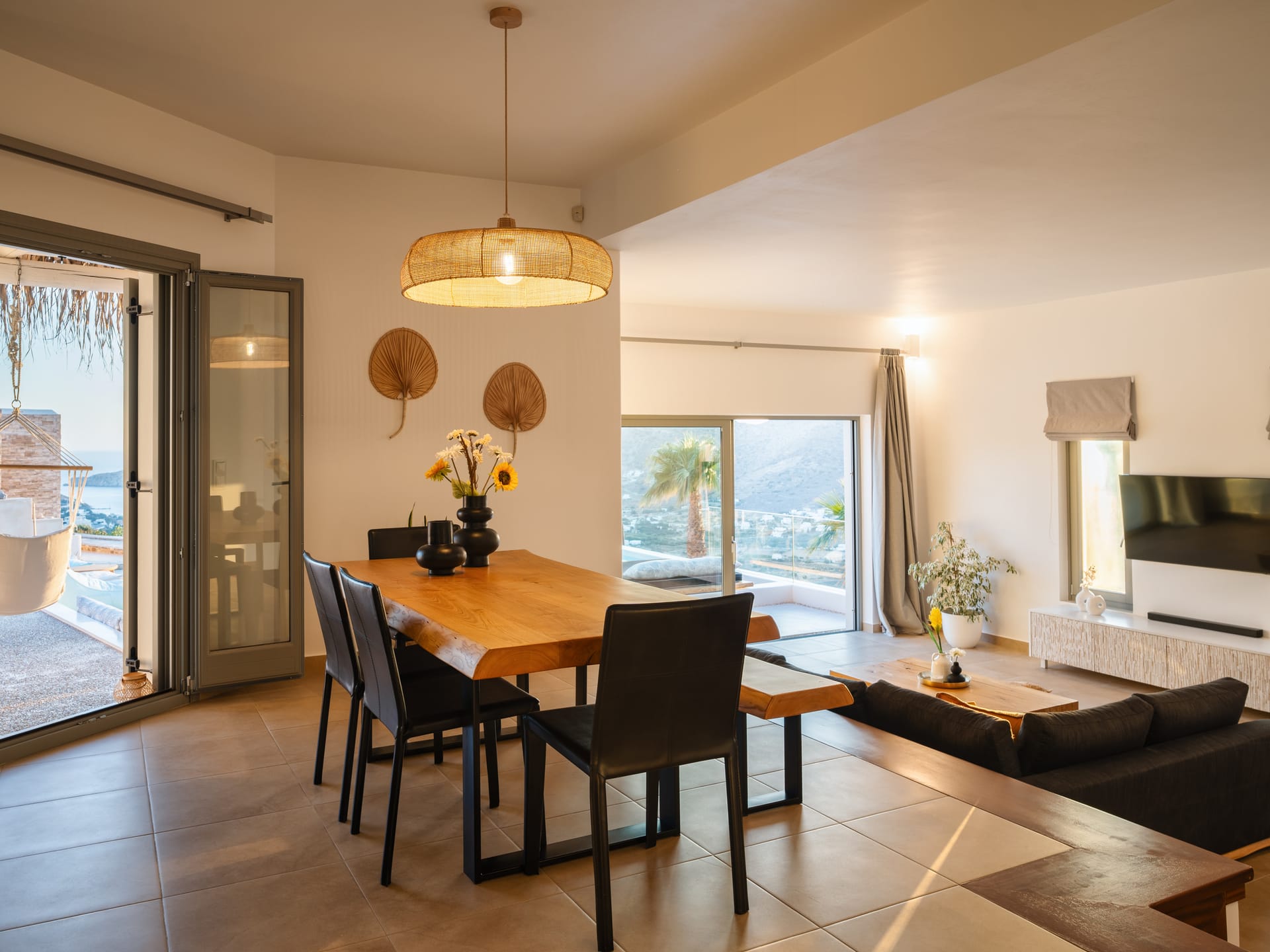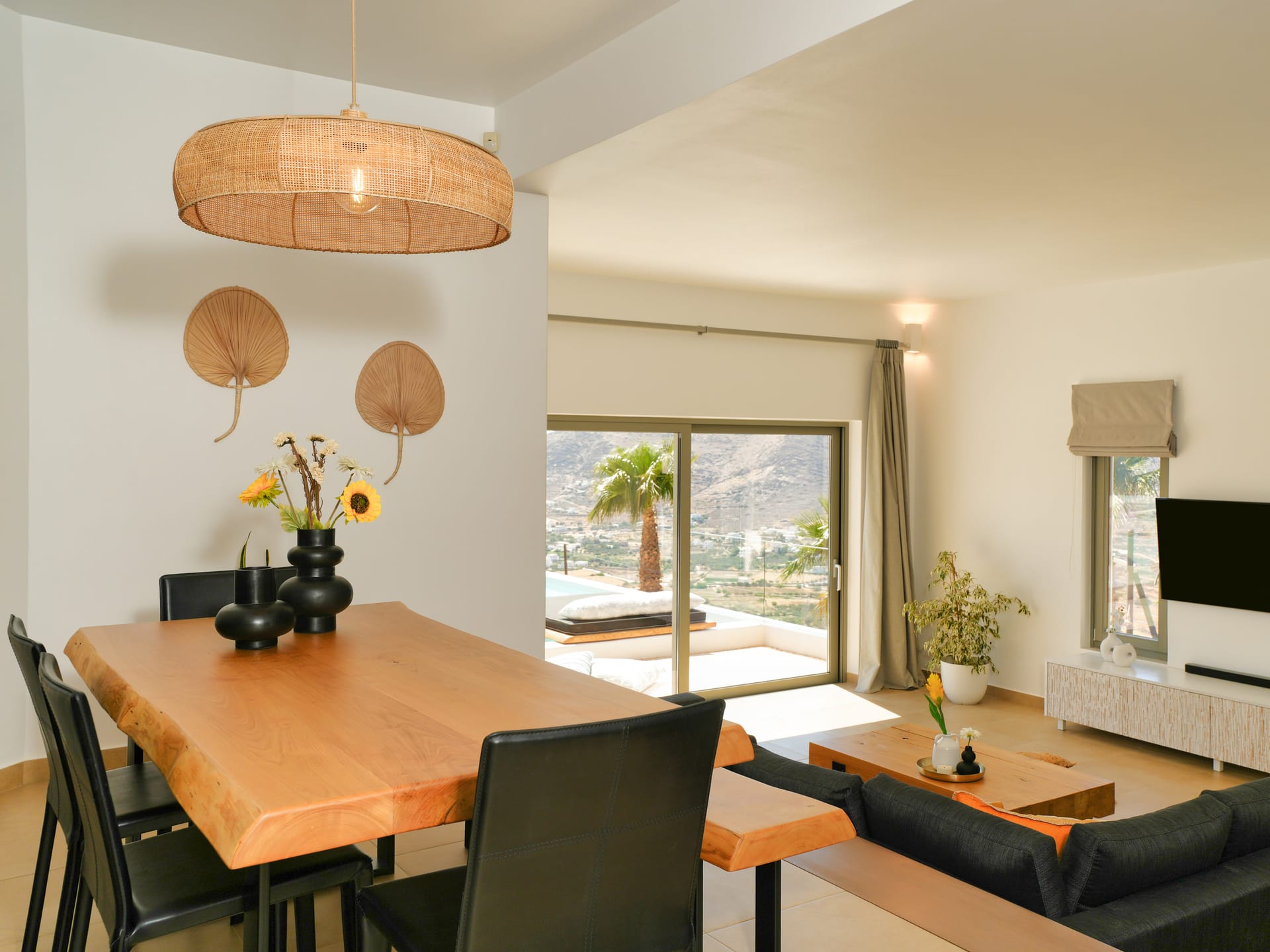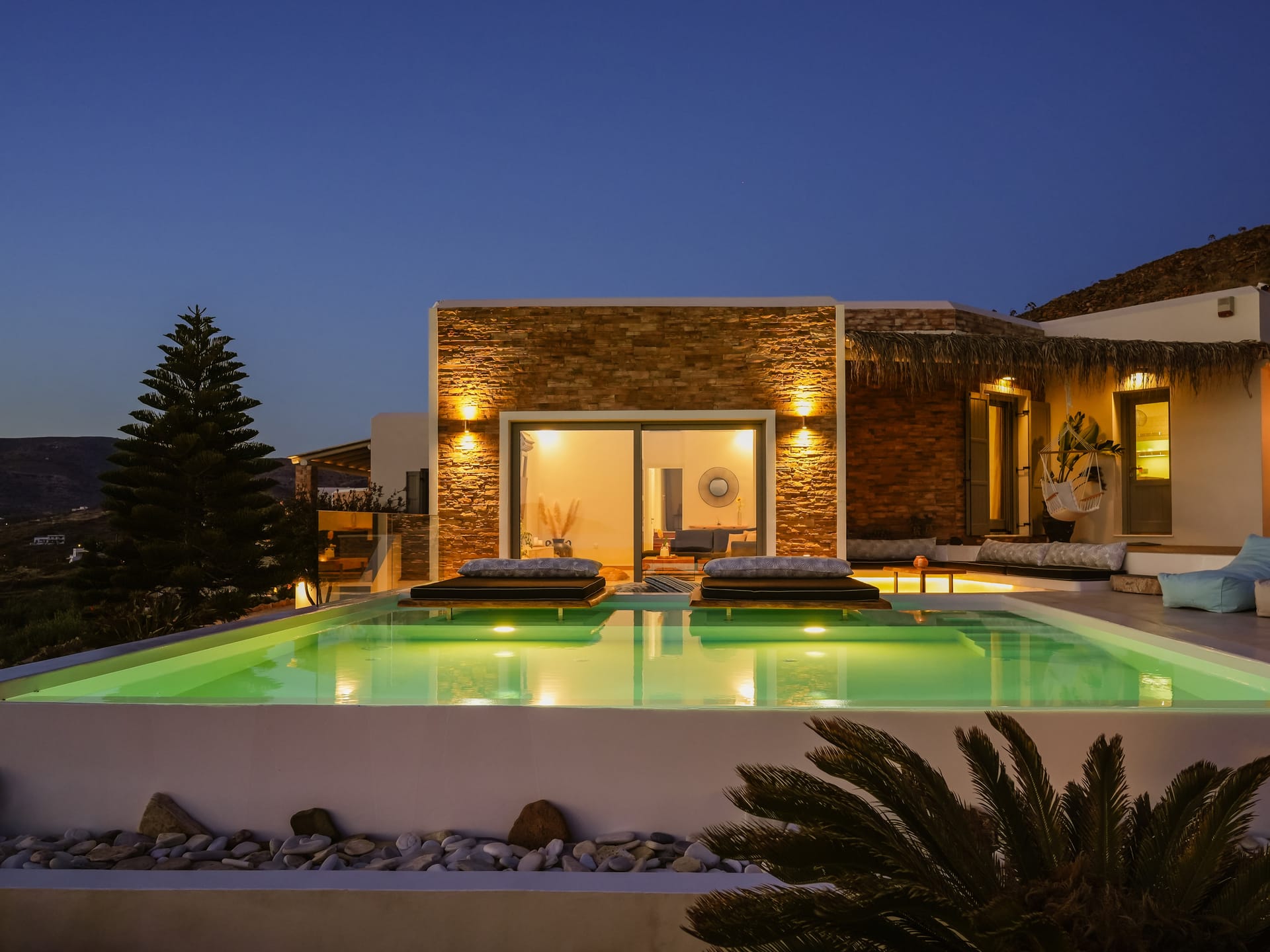 Independent Villa with great views and beautiful sunset. The villa is located in a quiet part of Ios Bouris.Can accommodate up to 8 adults as there are 4 bedrooms and 4 bathrooms , a big kitchen area ,dining table and a living room that looks the outside pool area and the sunset !The outside area has a private pool overlooking the sunset,sitting area ,dining table and barbecue facilities.
