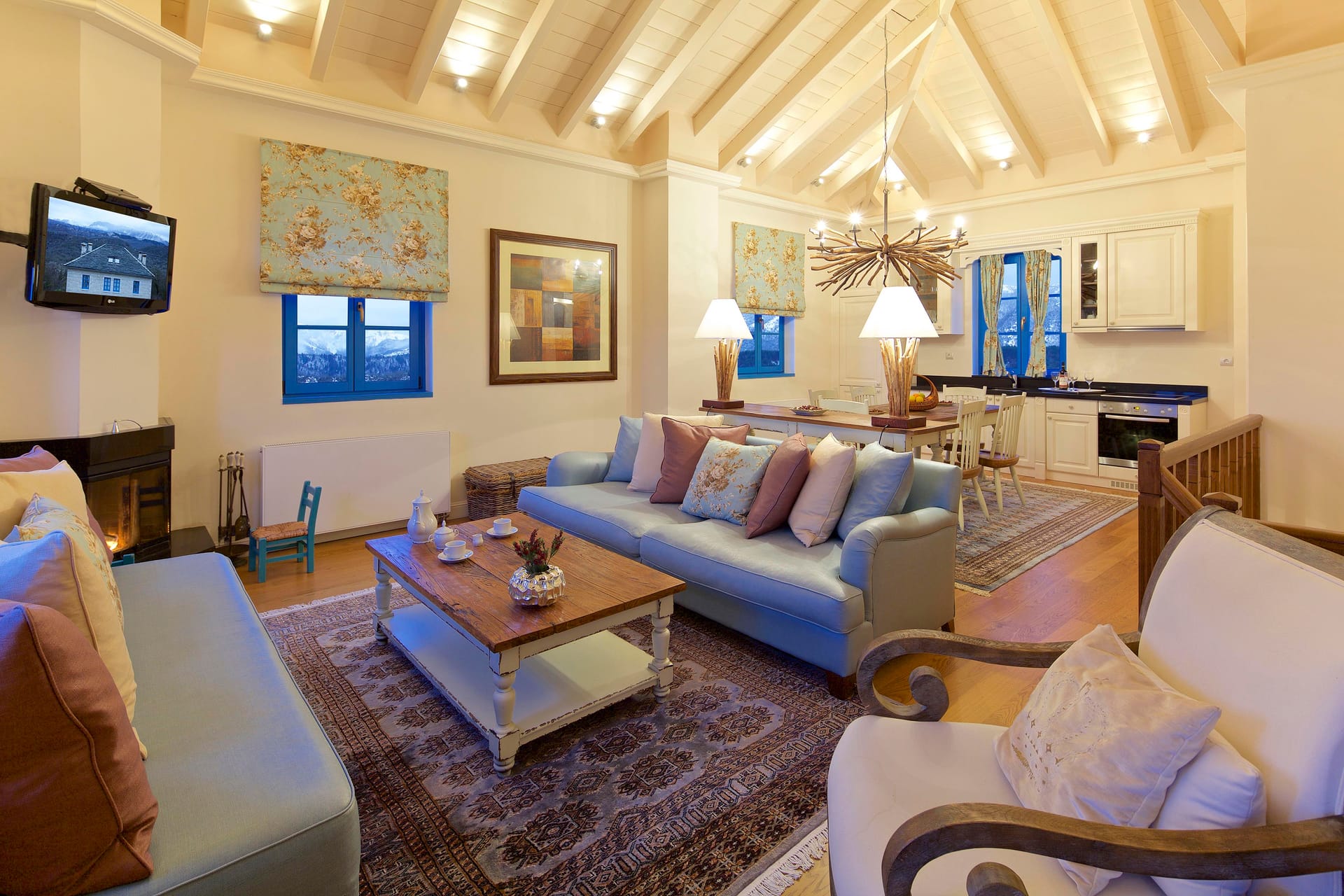 The air-conditioned Grand Chalets are considered as a luxurious, yet homey accommodation. They consist of 2 bedrooms with king size beds on the ground floor with an individual bathroom. The wooden stairs lead to the spacious and cozy living room with the fire place, the dining area and the fully equipped kitchen. There is an extra WC on this floor. The room features include also working desk, a Jacuzzi shower in one bathroom, satellite and cable TV, 2 LCD screens, free wireless internet connection, mini bar, coffee machine, FRETTE linen, eco mattresses, exclusive cotton Towels, Bathrobes & Slippers, exclusive bathroom amenities and a hairdryer.