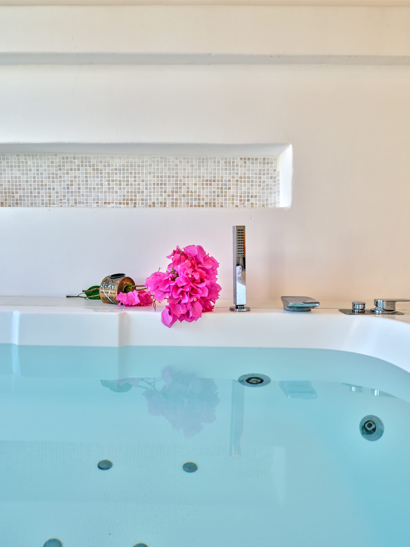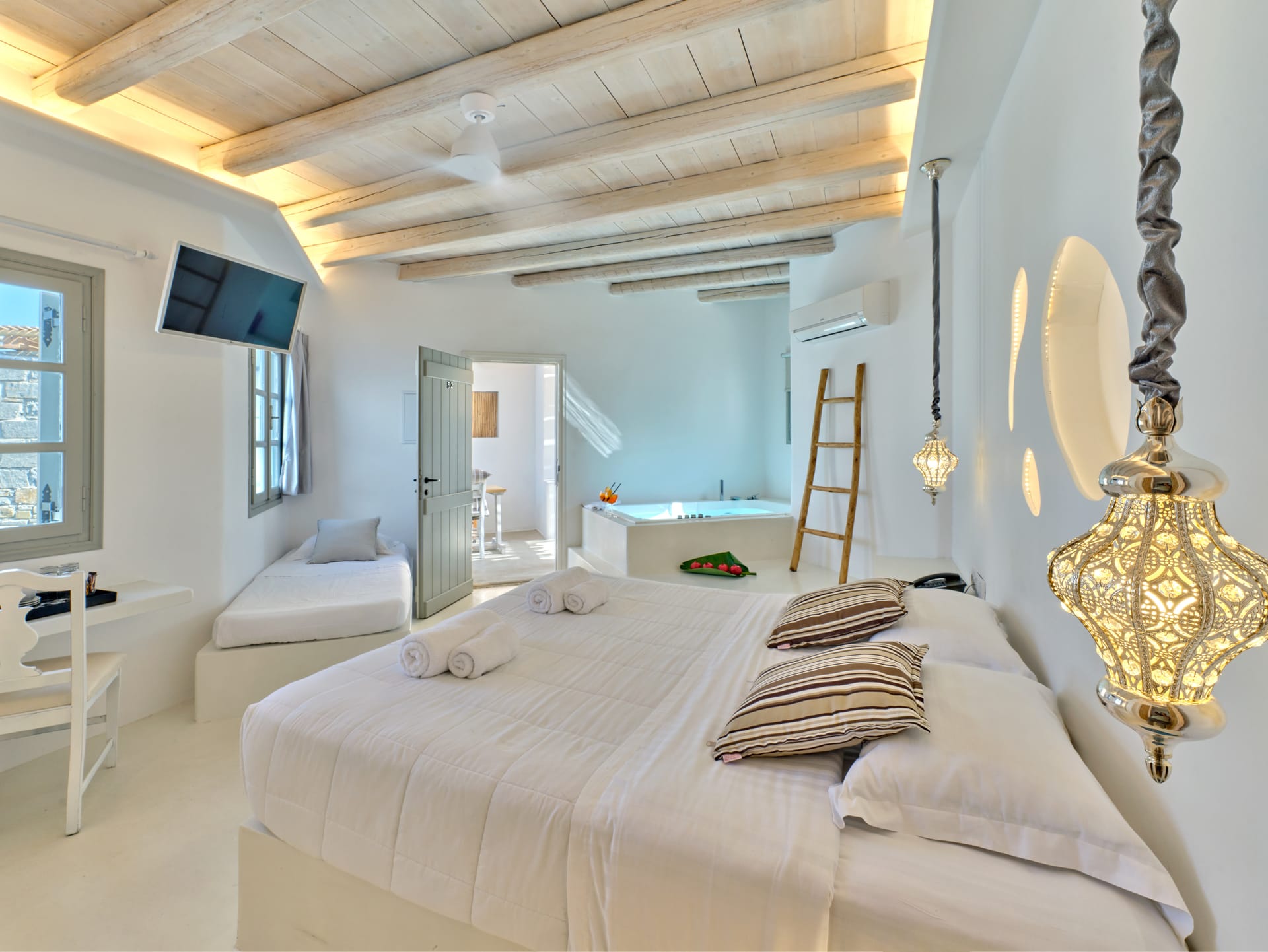 Open plan spacious luxury double/twin room coming with a built type Jacuzzi or a hot tab Jacuzzi. This Room features a balcony overlooking the pool. Modern esthetic for the bathroom featuring the Parian built type design. This room has queen sized beds. Room Space: 25 - 28 m2