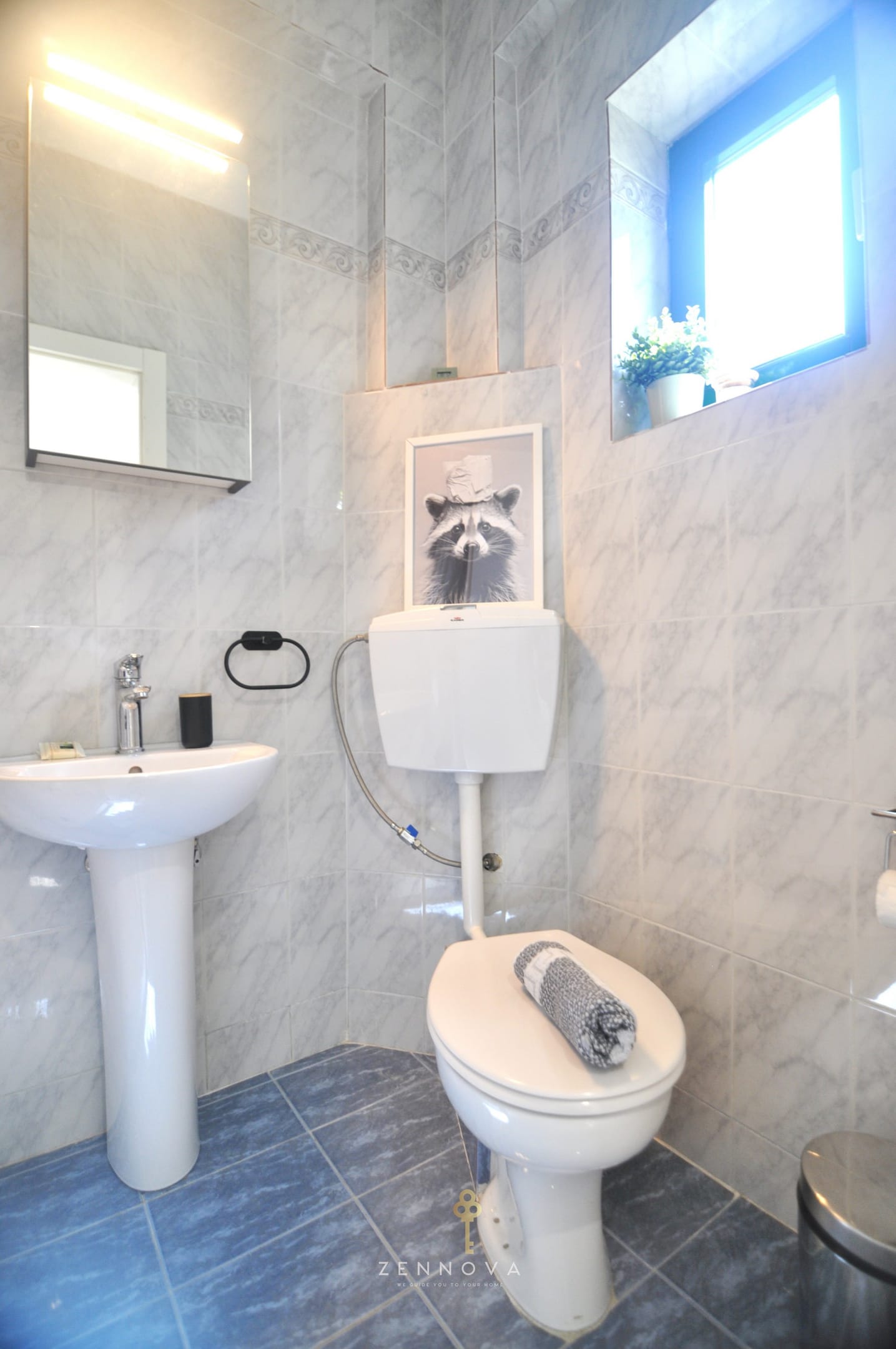 2. On the ground floor there is a bright living room with sofas, a fully equipped kitchen for meal preparation and a WC.