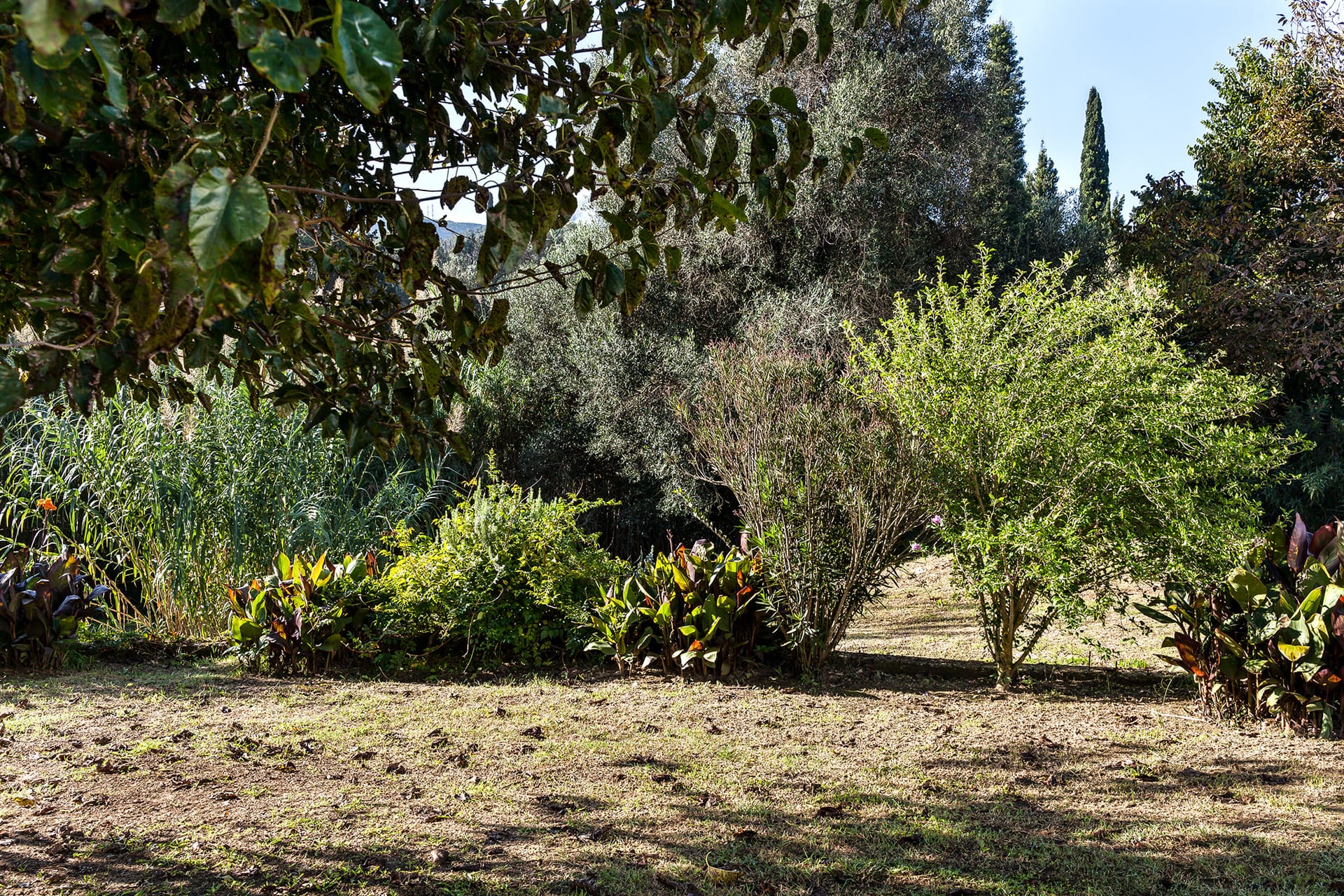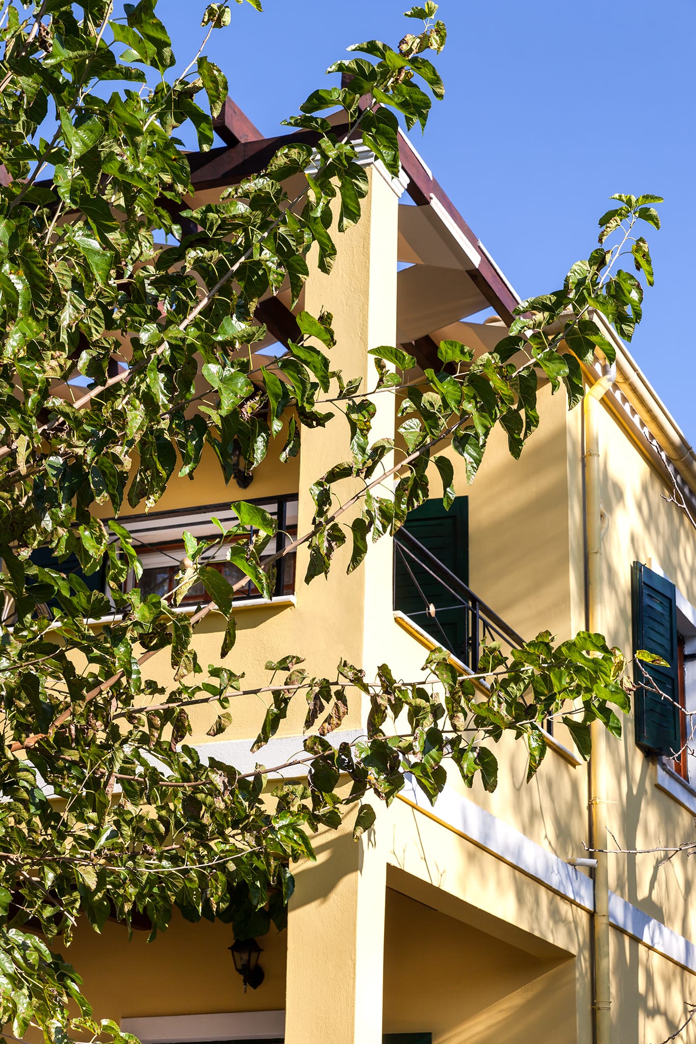 A double bedroom (matrimonial bed) and another twin bedroom (2 single beds)downstairs, which share the main bathroom. Both bedrooms open to their own verandas with a shaded pergola facing the garden, the riverside and the open Ionian sky. Minimal modern furniture and utilities offer a relaxing decoration. Ceiling fans in both bedrooms are there to ensure a good night sleep. Both bedrooms have large doors out to the veranda and have sunlight bursting in throughout the day.