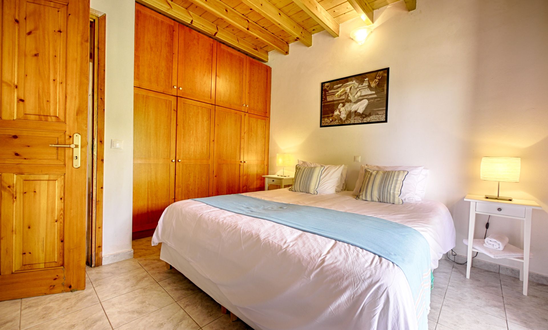 Walking up the wooden staircase will lead you to a cozy open plan sitting room/dining area opening through French doors onto wide veranda with panoramic view of the wonderful surroundings and the stunning colors of the horizon when the sun sets behind the Afionas Peninsula. Minimal modern furniture and decoration indoors and outdoors, create a relaxing environment. There is a ceiling fan at the sitting room.