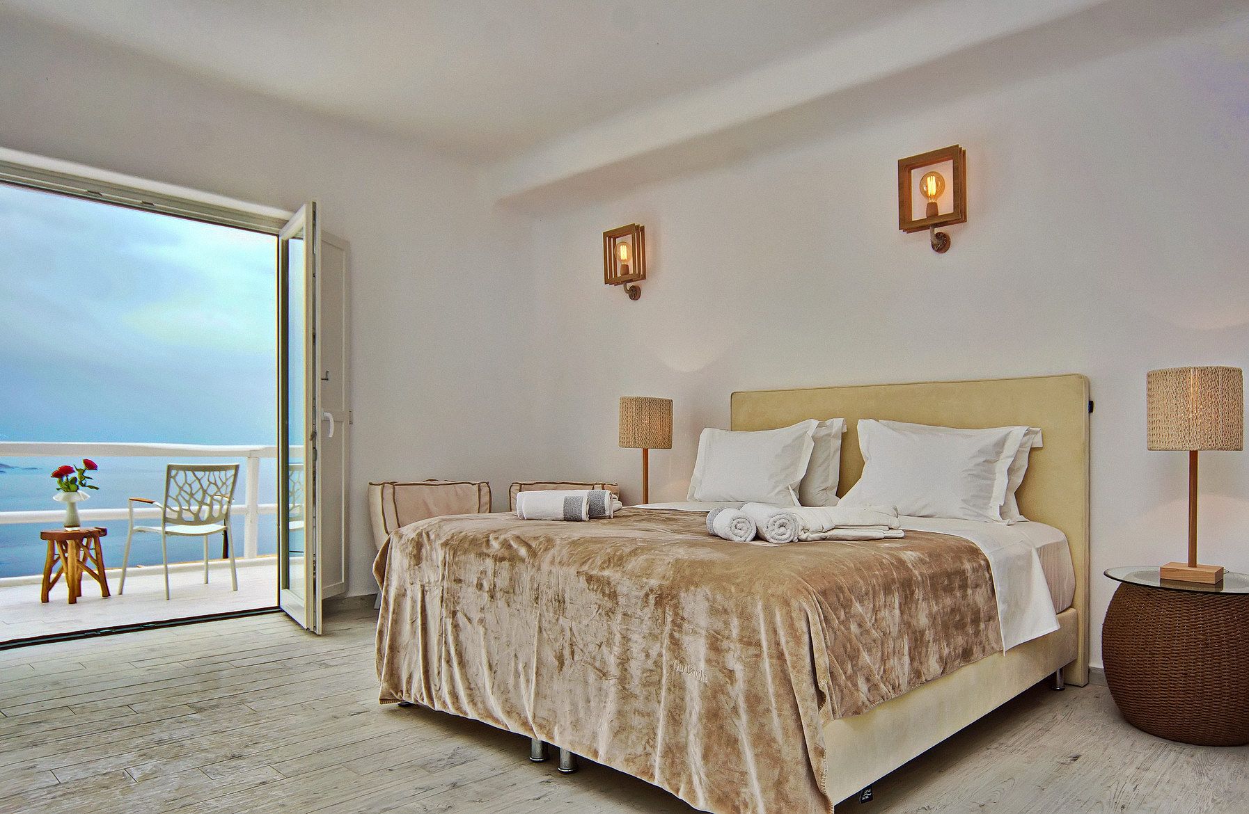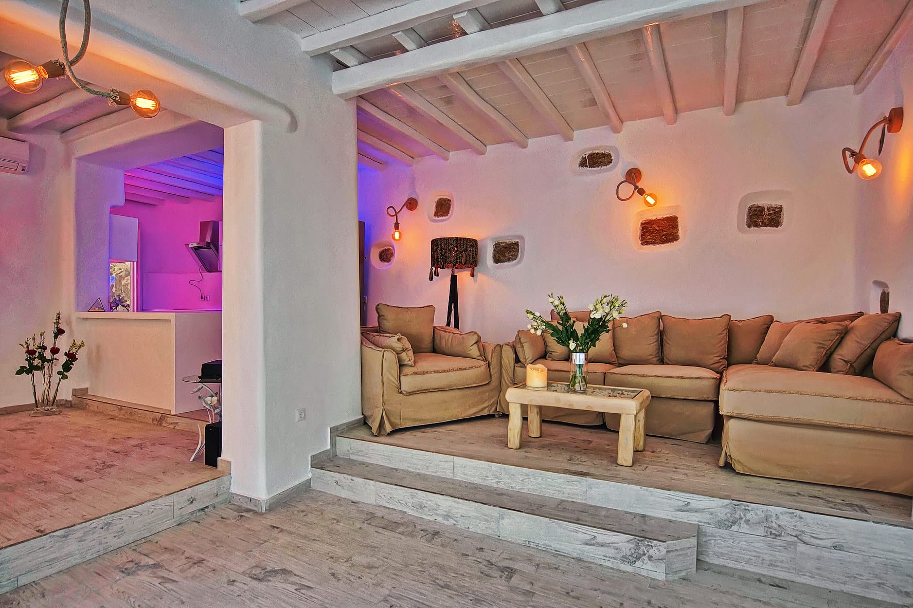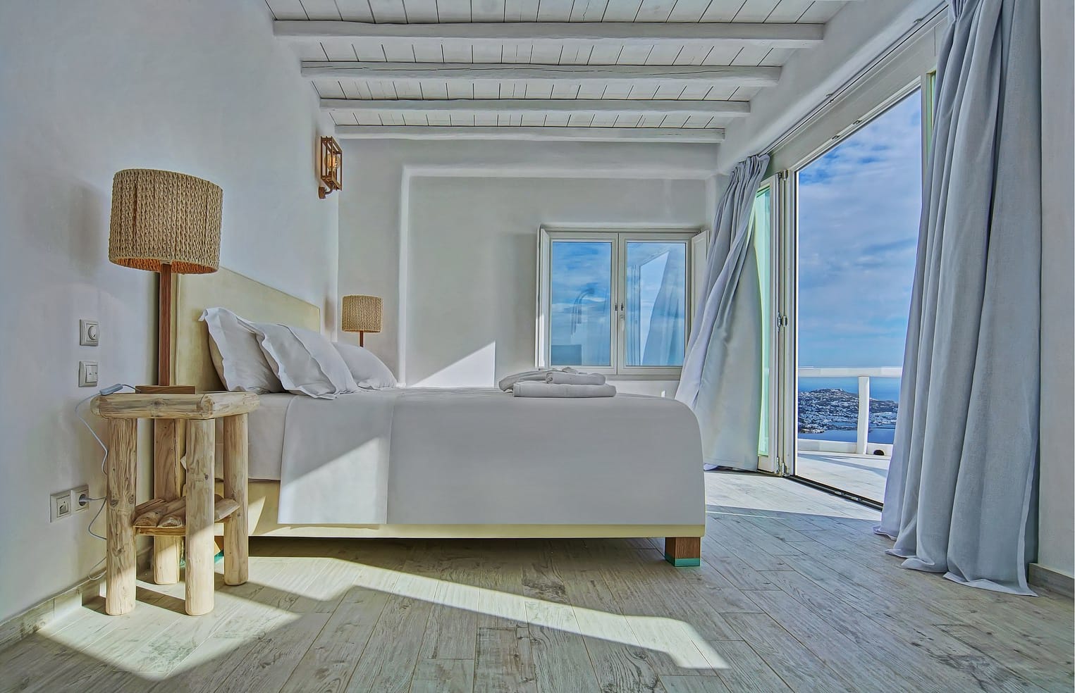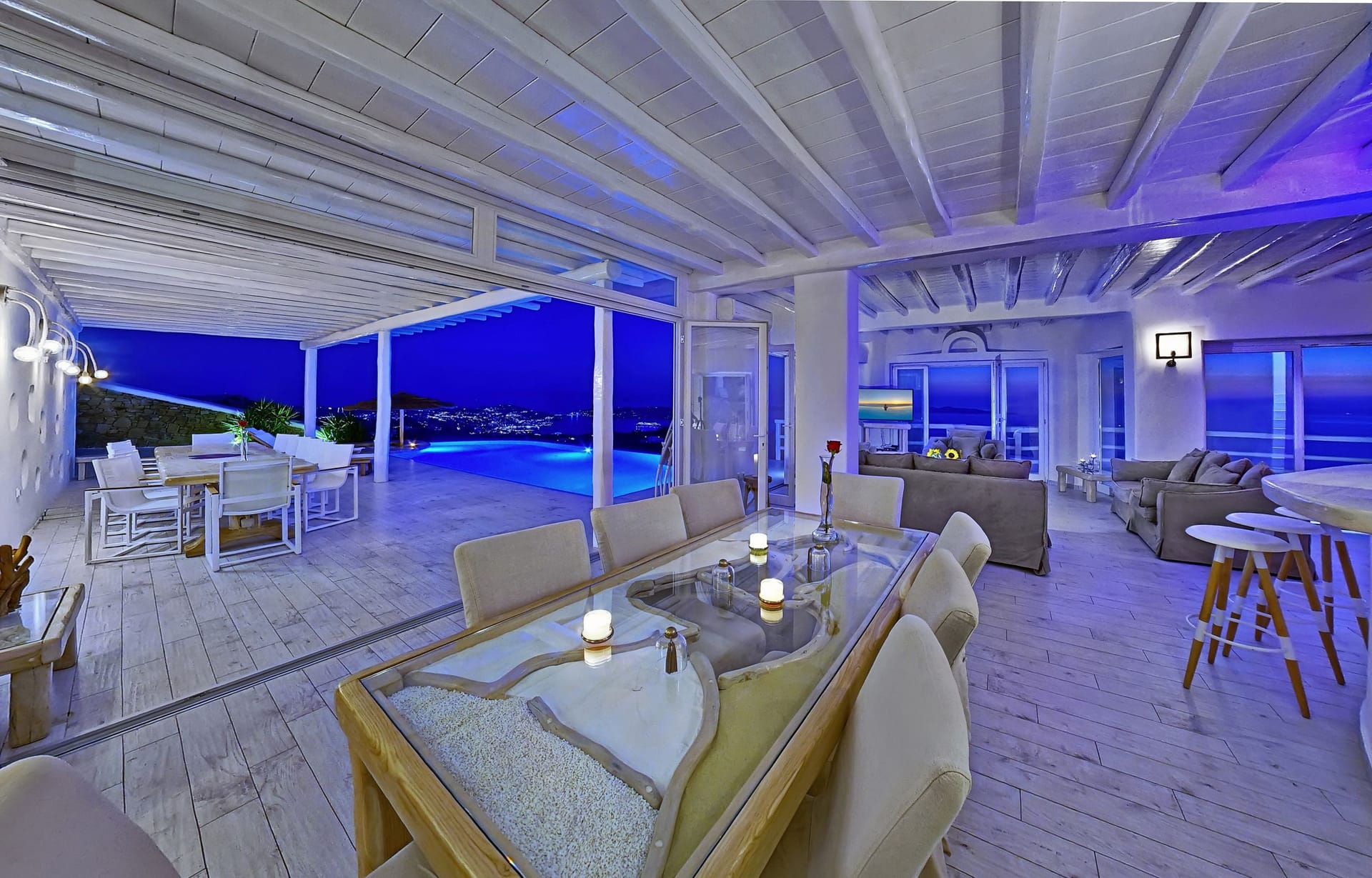 Facilities like a wooden jungle bar in the pool area, offer the guests the ability of sharing amazing moments just in front of the big blue, enjoying parties, gatherings and unforgettable wedding experiences. The Villa is totally covered from the wind-which is extremely important for an island like Mykonos and it offers you an amazing View not only during the day, but during the night as well, as you can relax just in front of the city lights in a totally romantic and peaceful atmosphere.