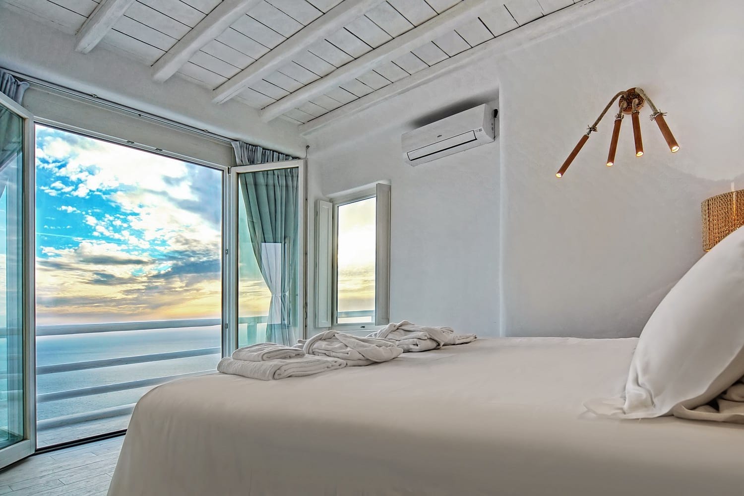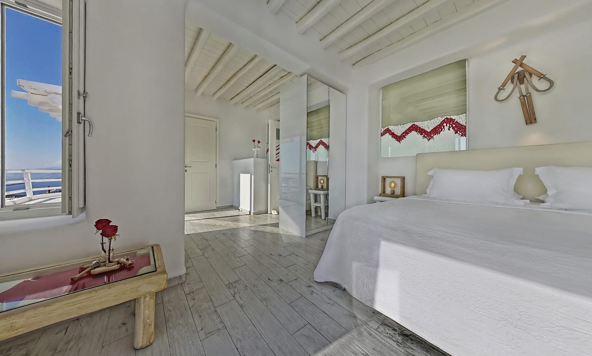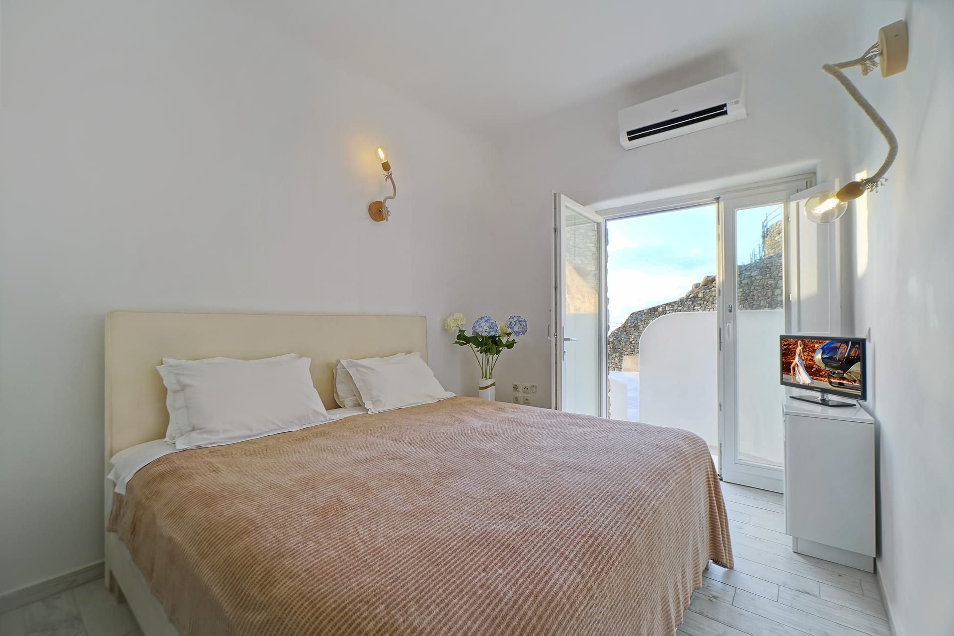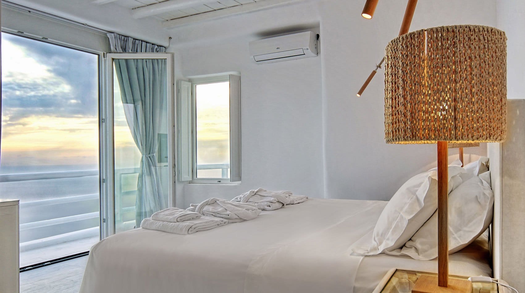 Facilities like a wooden jungle bar in the pool area, offer the guests the ability of sharing amazing moments just in front of the big blue, enjoying parties, gatherings and unforgettable wedding experiences. The Villa is totally covered from the wind-which is extremely important for an island like Mykonos and it offers you an amazing View not only during the day, but during the night as well, as you can relax just in front of the city lights in a totally romantic and peaceful atmosphere.