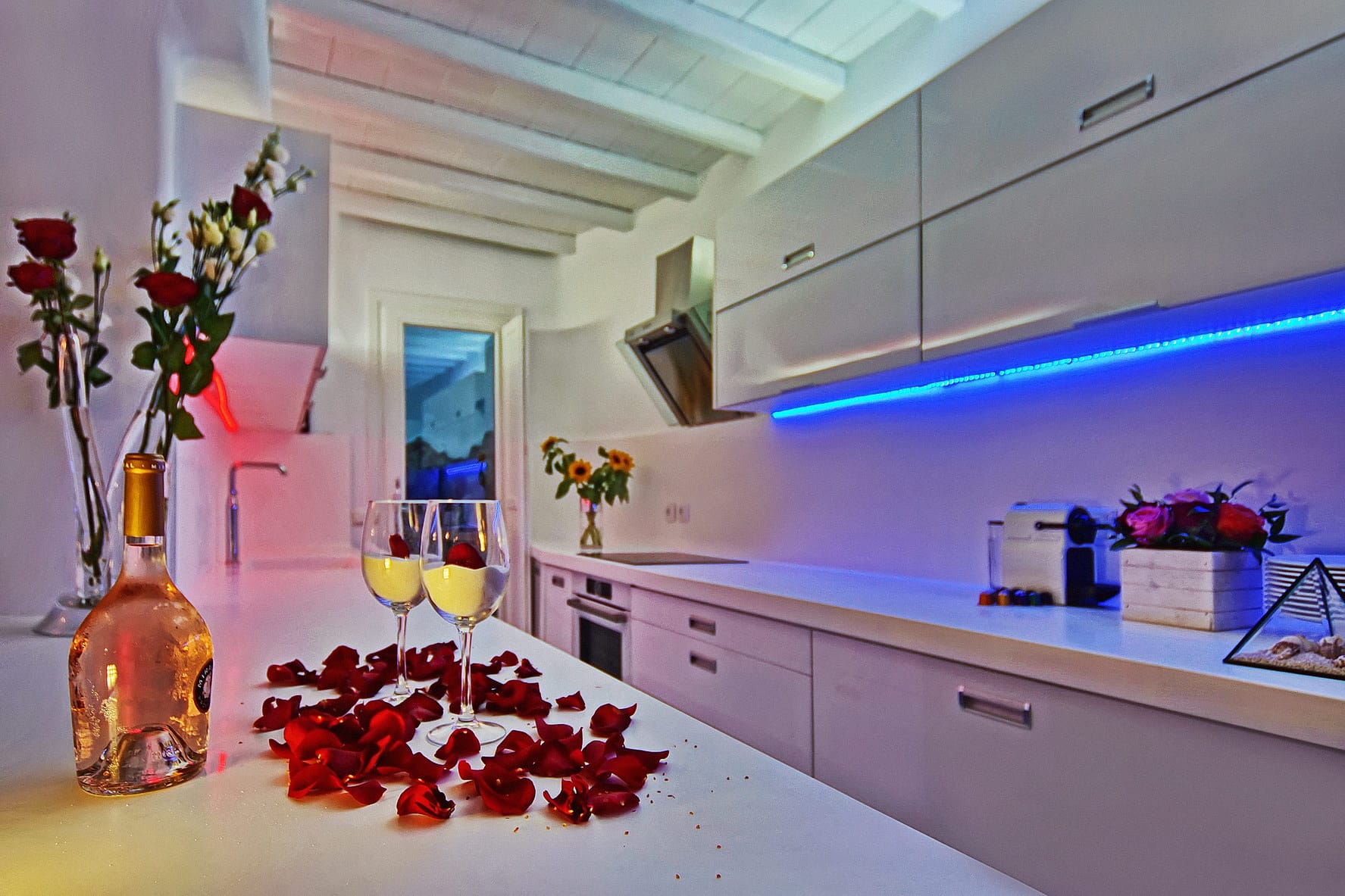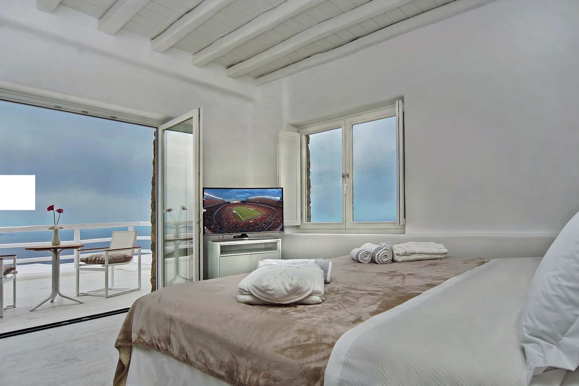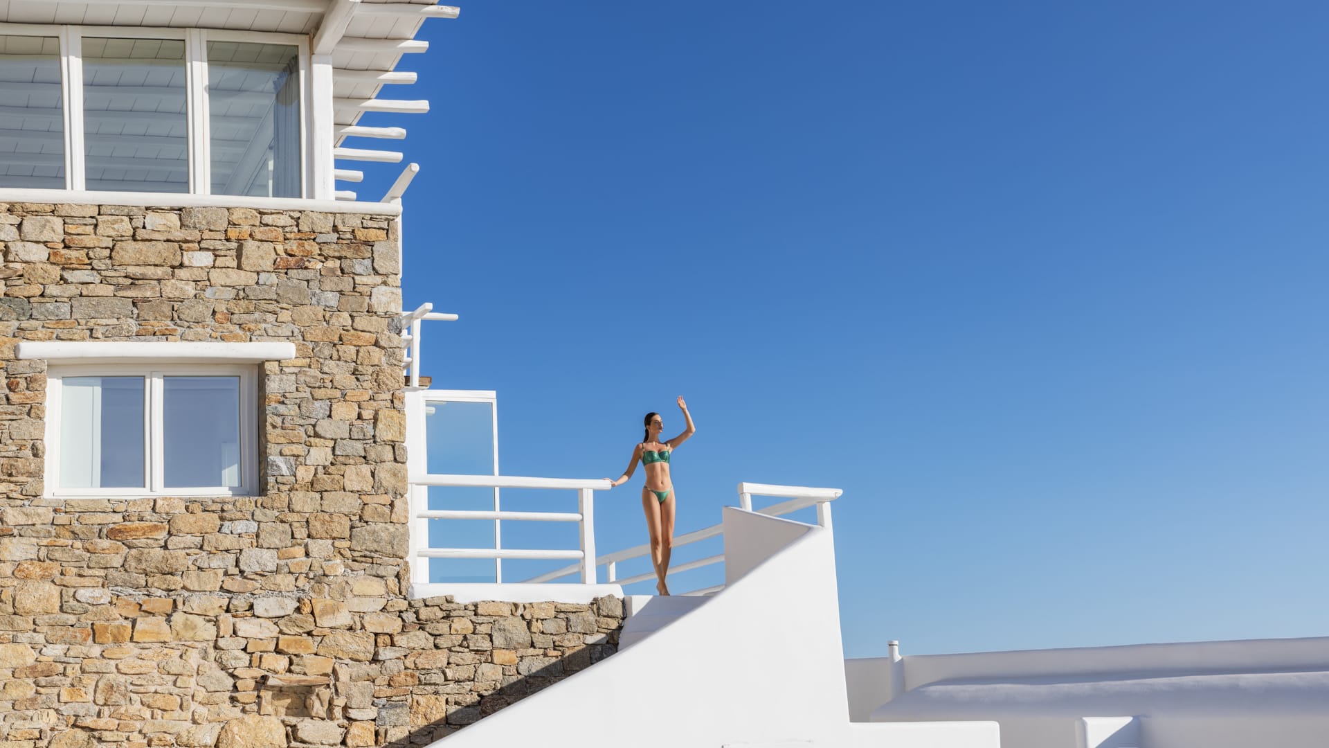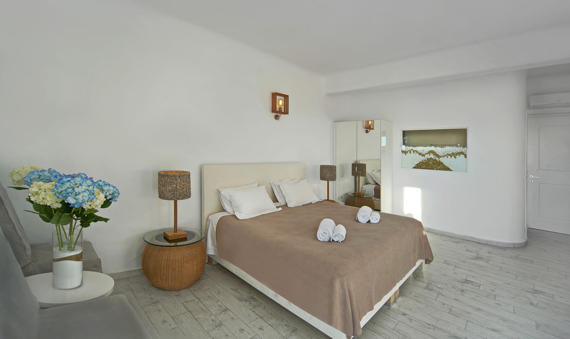 Facilities like a wooden jungle bar in the pool area, offer the guests the ability of sharing amazing moments just in front of the big blue, enjoying parties, gatherings and unforgettable wedding experiences. The Villa is totally covered from the wind-which is extremely important for an island like Mykonos and it offers you an amazing View not only during the day, but during the night as well, as you can relax just in front of the city lights in a totally romantic and peaceful atmosphere.