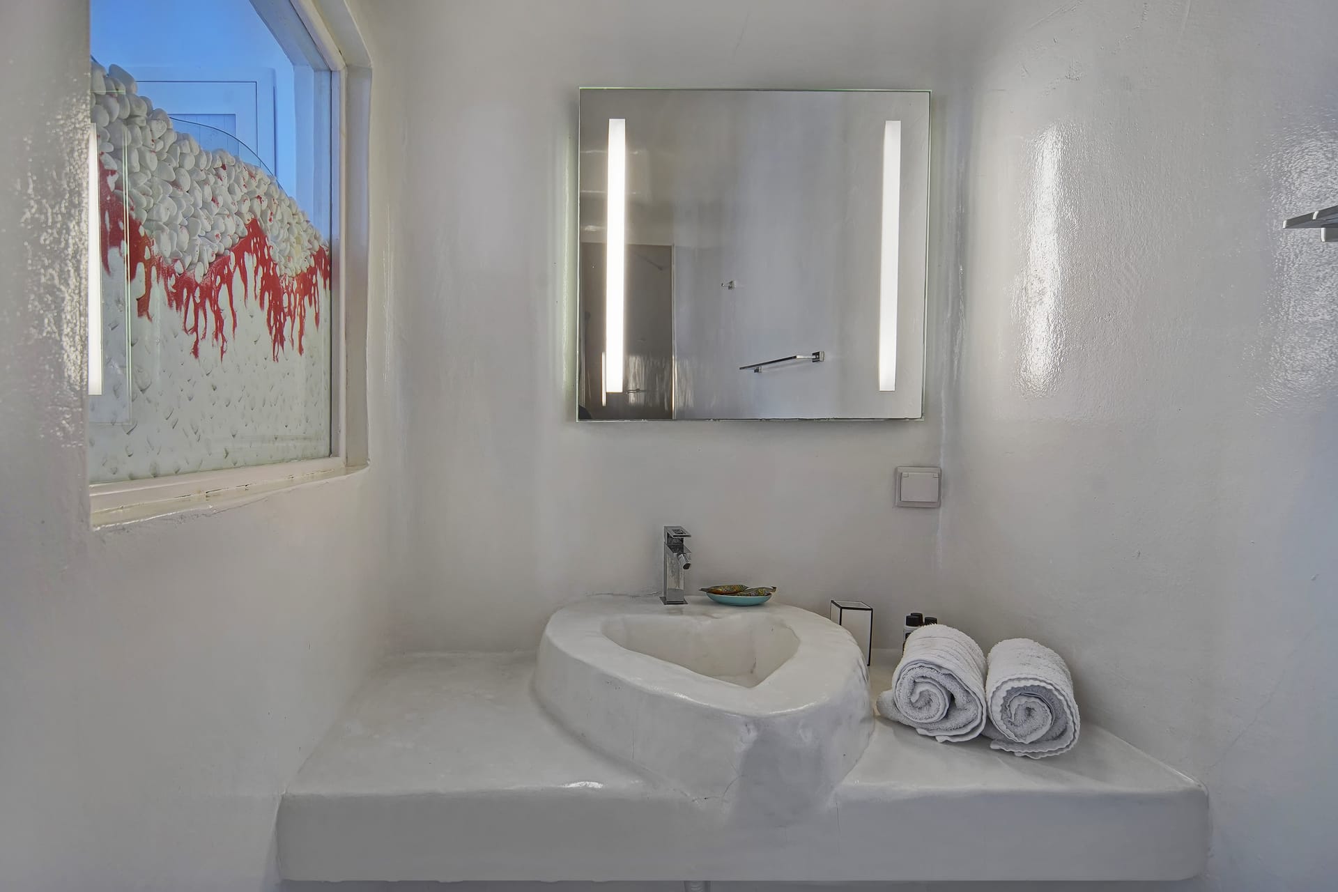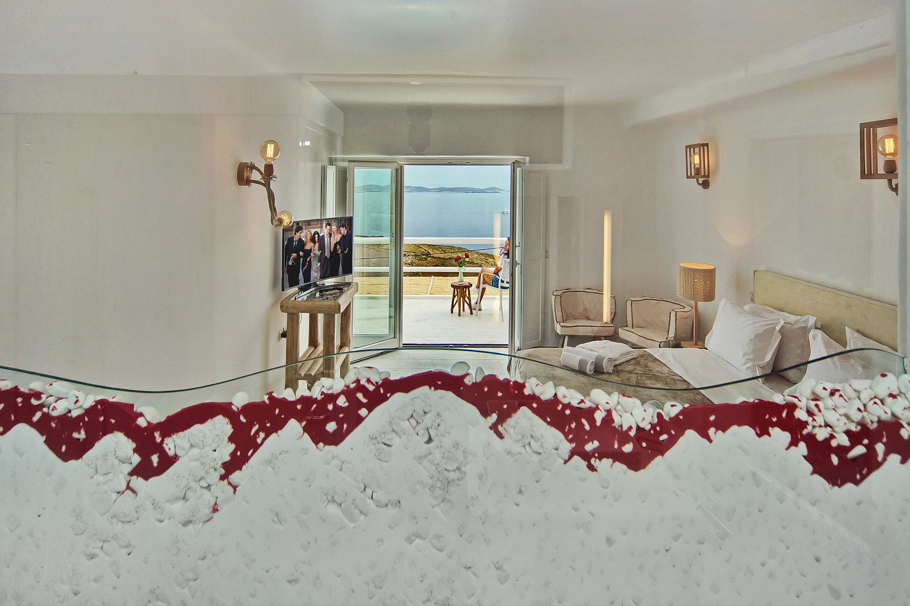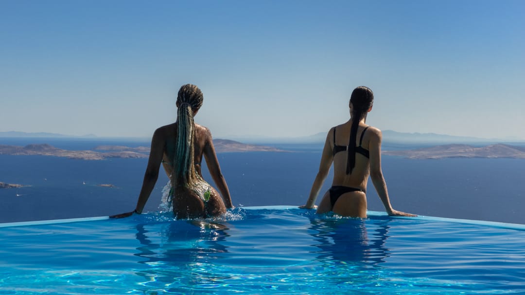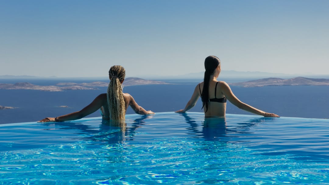 The infinity pool is located on the main level, offering a beach - like shape giving the extraordinary feelling of a tropical retreat in the most cosmopolitan island of Greece, just infrond of the holy spiritual island of Delos.