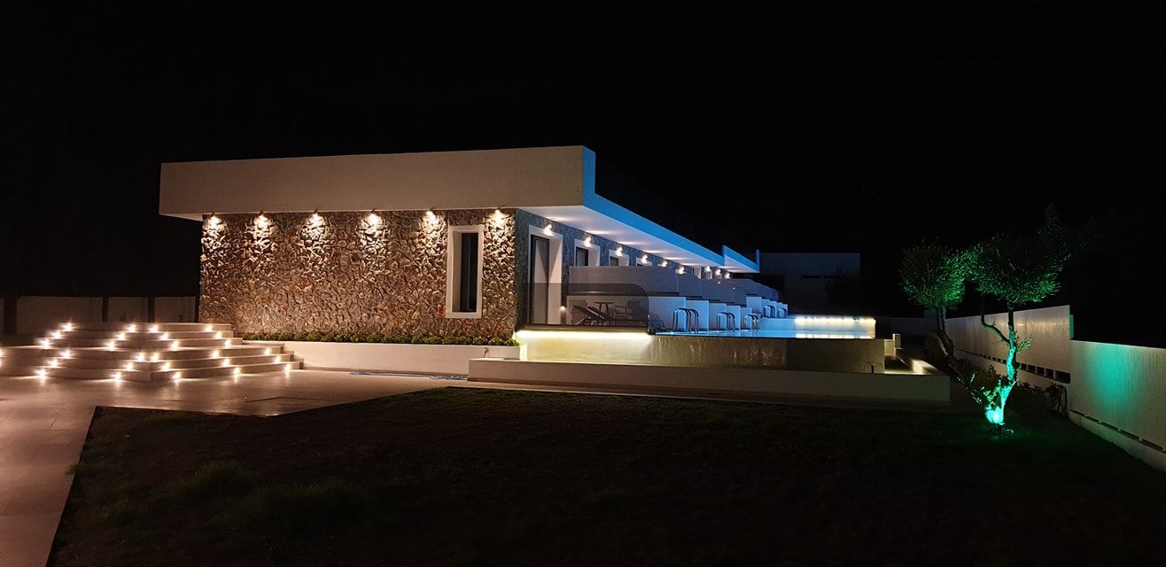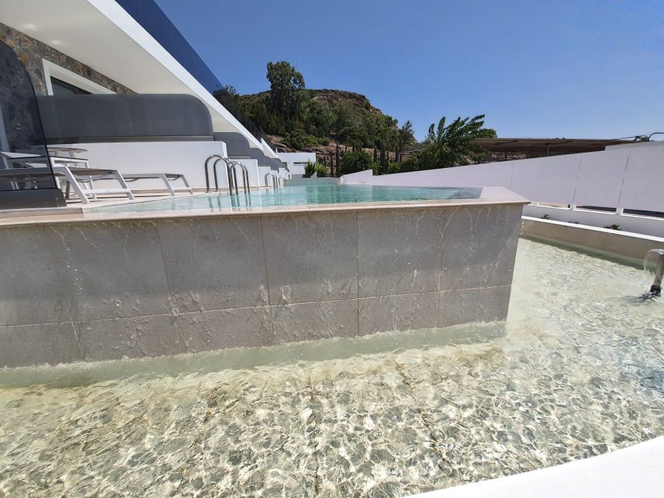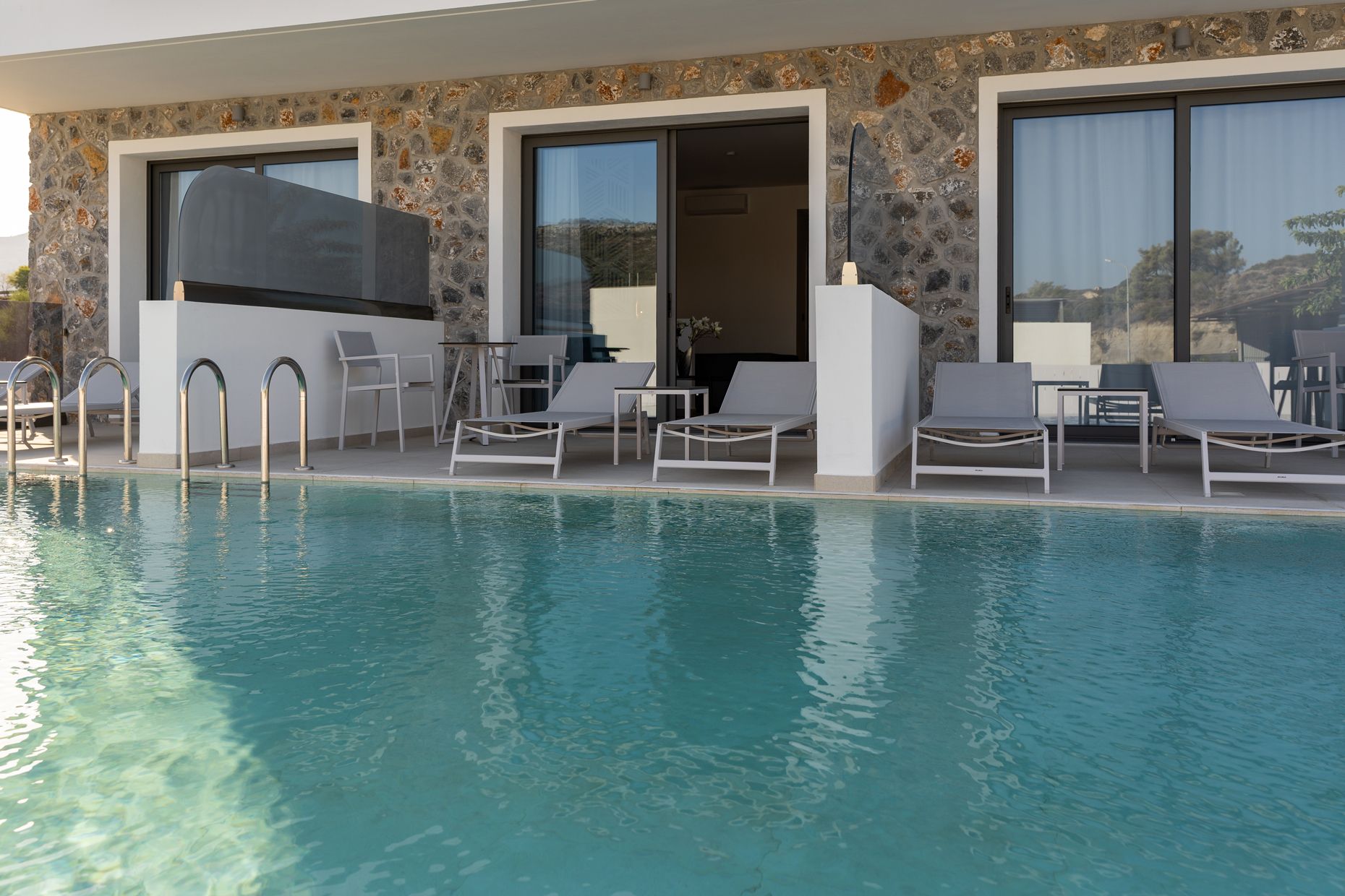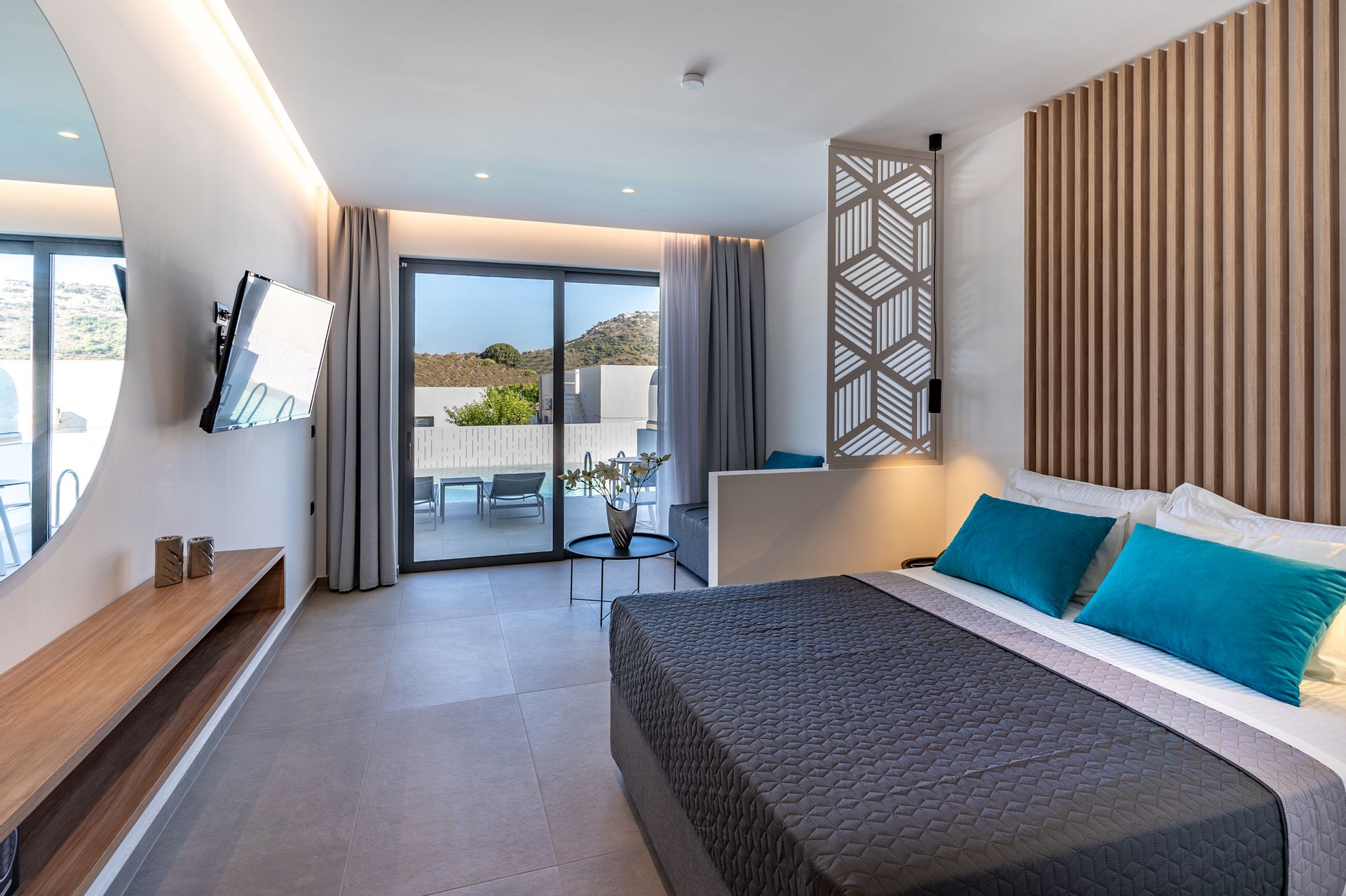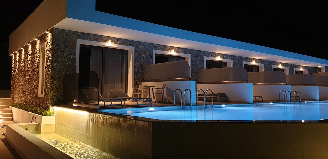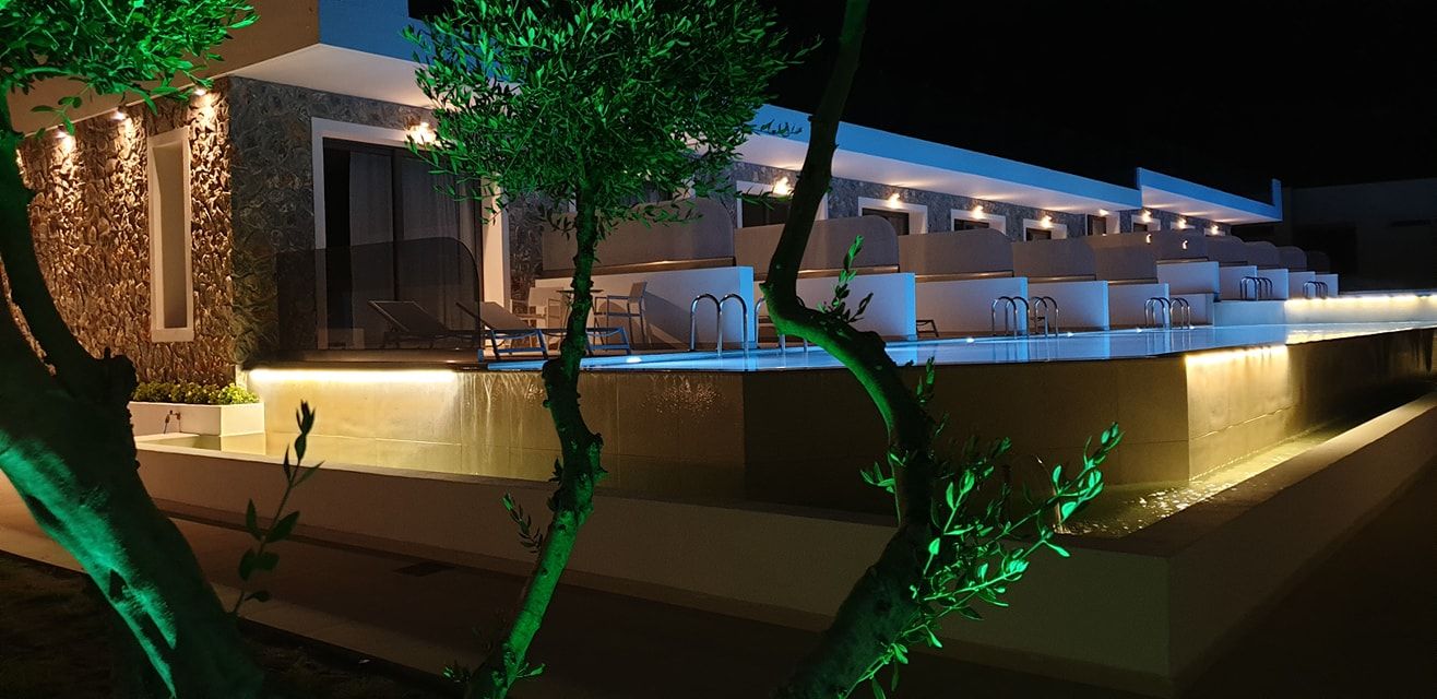 The Suites are all the same size (30 sq. m.) facing the pool & the garden and are equipped with a king size & a sofa single bed, a private bathroom (shower, WC), wardrobe/closet, air condition, safe box, flat 45 inches Smart - Android TV with satellite channels, Wi-Fi & Internet access, fridge, direct telephone line, electric kettle (coffee & tea maker), hair dryer and a 13 sq. m. furnished balcony – veranda with 2 sun loungers – chairs & tables.