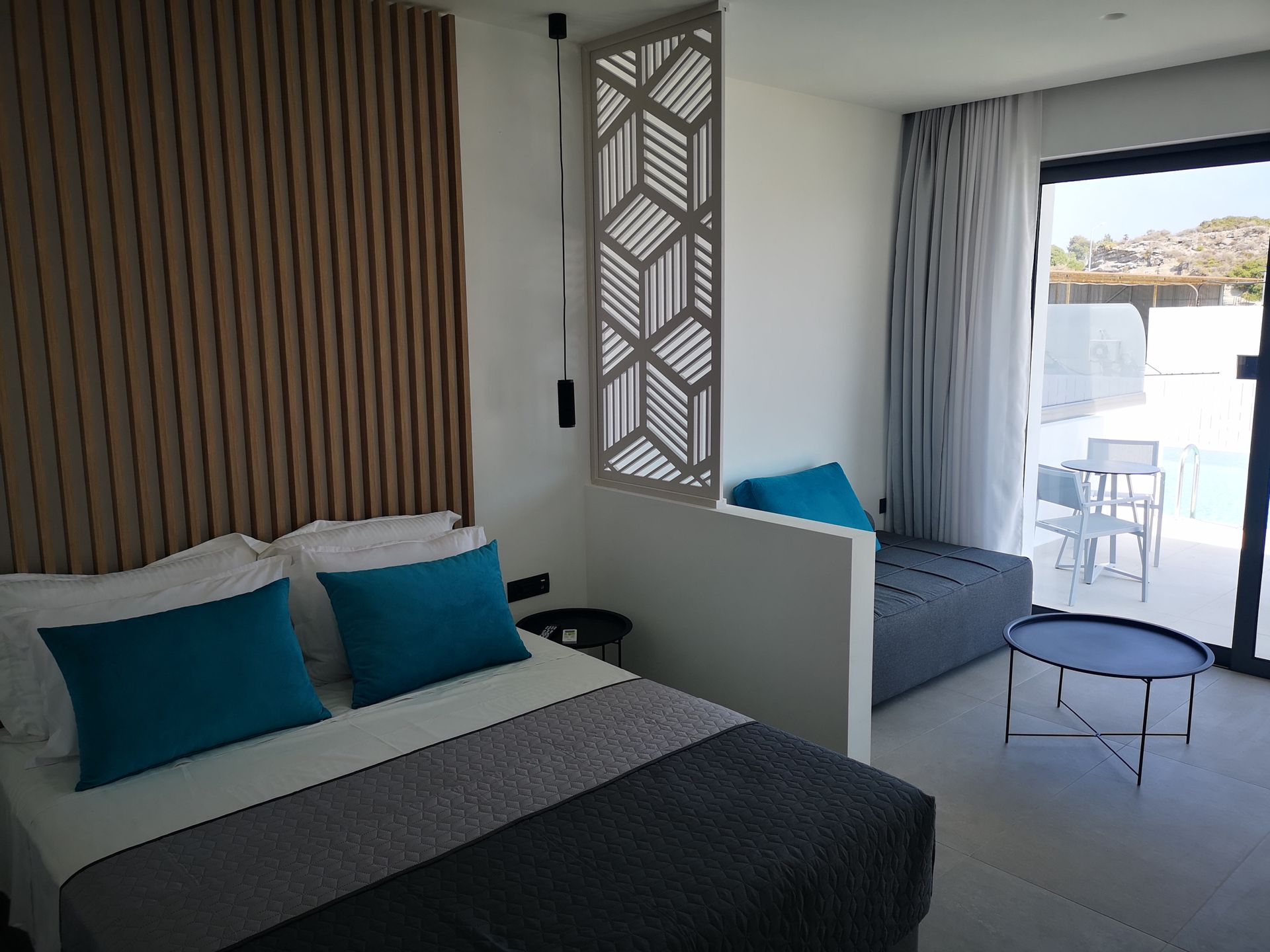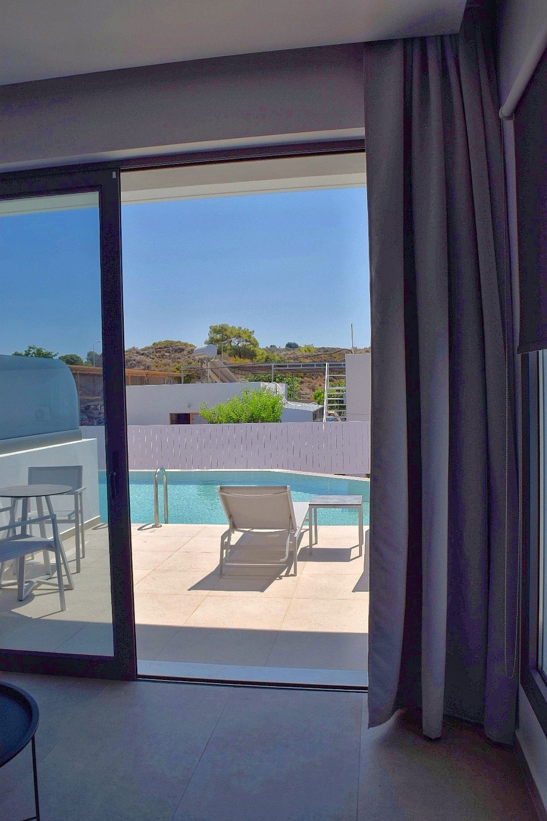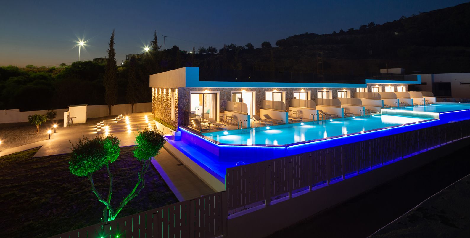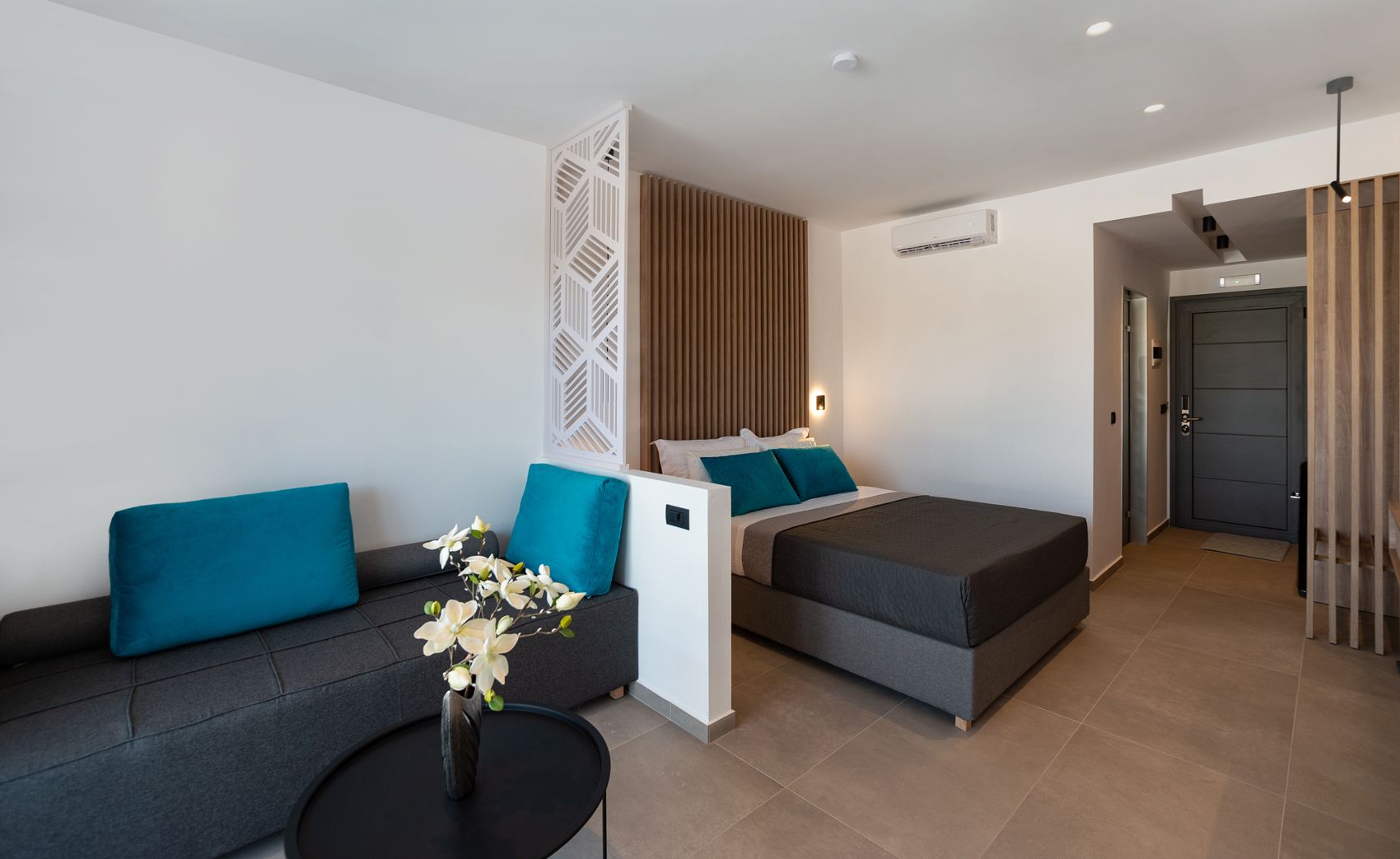 The Suites are all the same size (30 sq. m.) facing the pool & the garden and are equipped with a king size & a sofa single bed, a private bathroom (shower, WC), wardrobe/closet, air condition, safe box, flat 45 inches Smart - Android TV with satellite channels, Wi-Fi & Internet access, fridge, direct telephone line, electric kettle (coffee & tea maker), hair dryer and a 13 sq. m. furnished balcony – veranda with 2 sun loungers – chairs & tables.