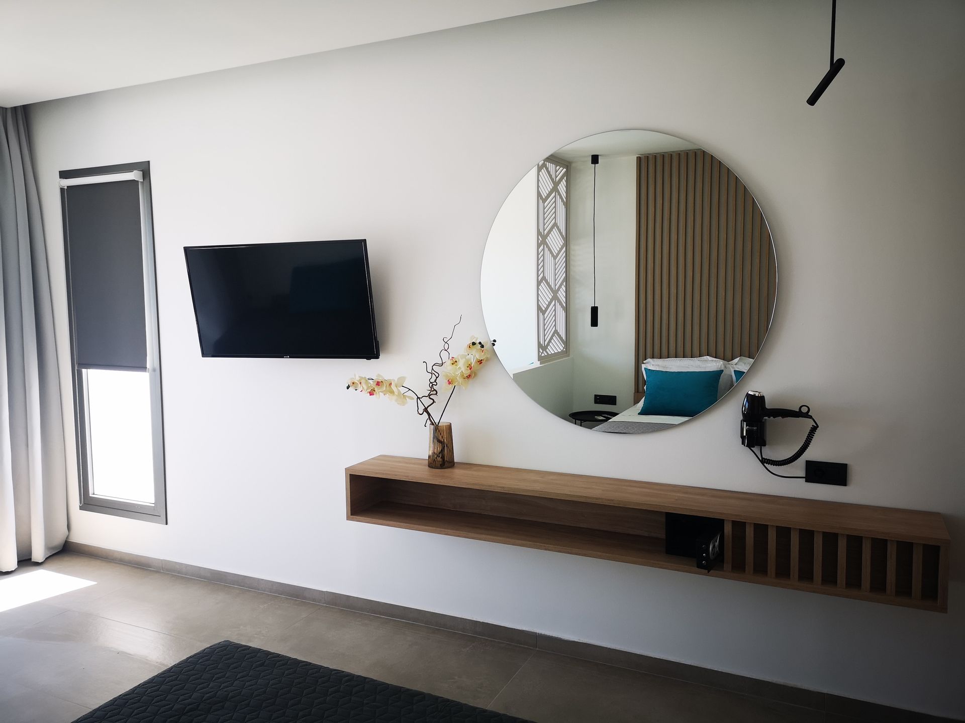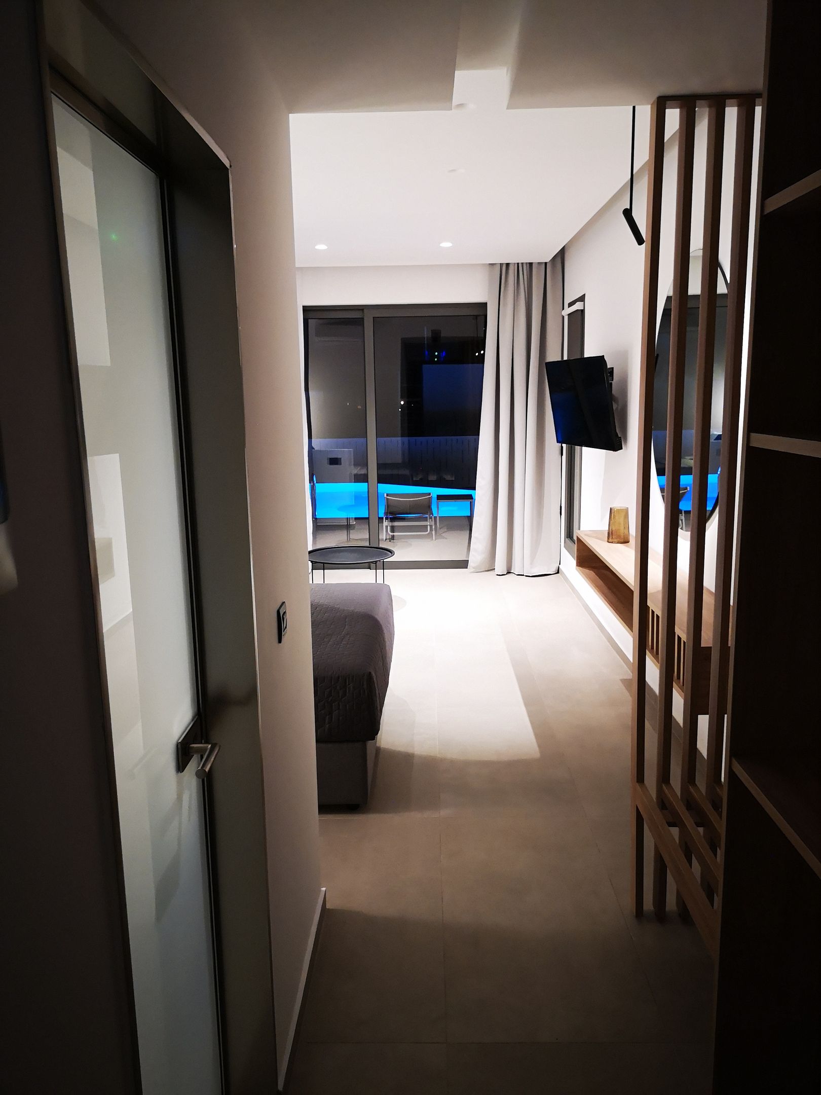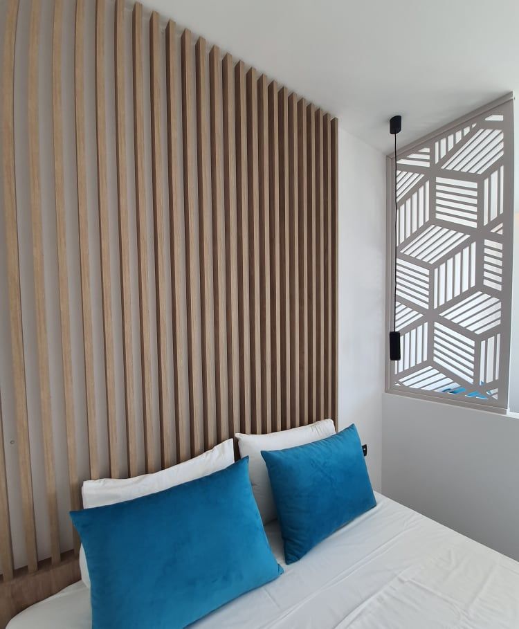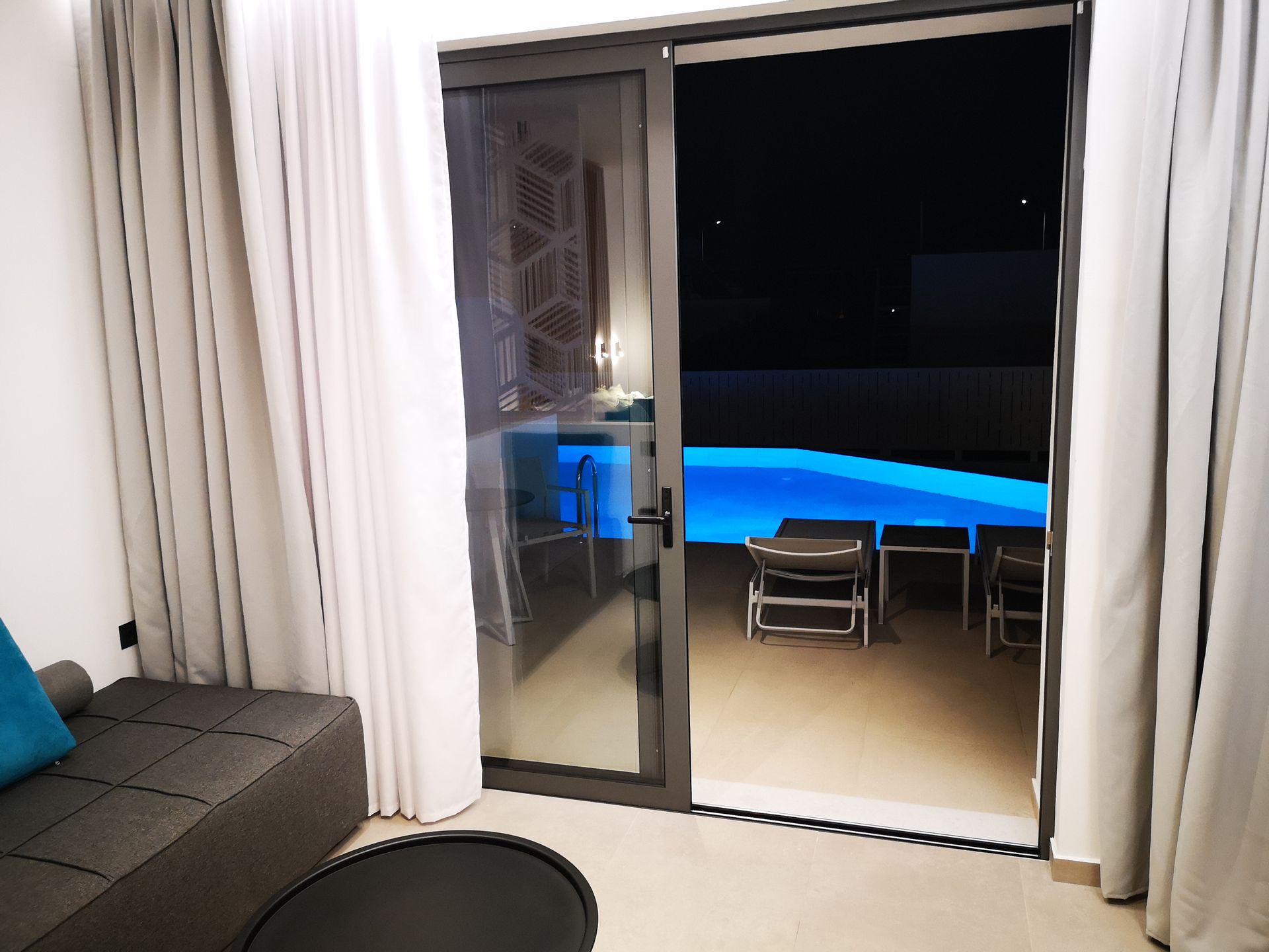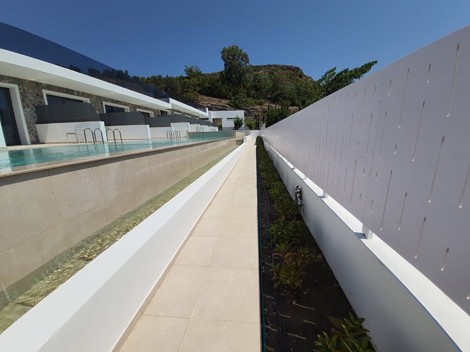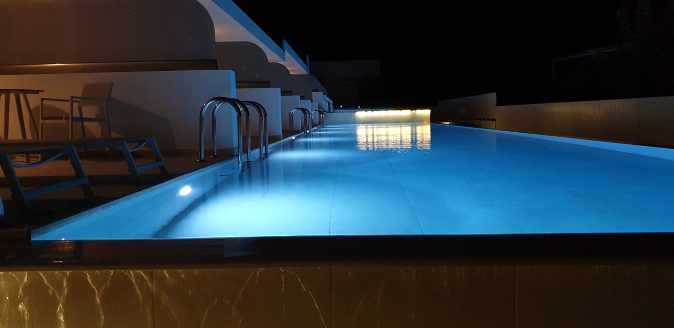 The Suites are all the same size (30 sq. m.) facing the pool & the garden and are equipped with a king size & a sofa single bed, a private bathroom (shower, WC), wardrobe/closet, air condition, safe box, flat 45 inches Smart - Android TV with satellite channels, Wi-Fi & Internet access, fridge, direct telephone line, electric kettle (coffee & tea maker), hair dryer and a 13 sq. m. furnished balcony – veranda with 2 sun loungers – chairs & tables.