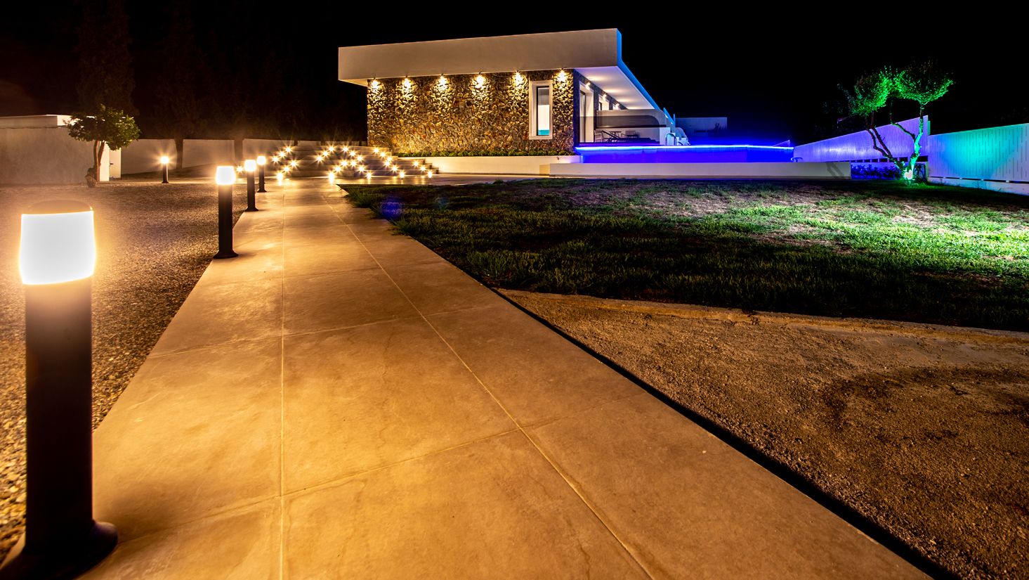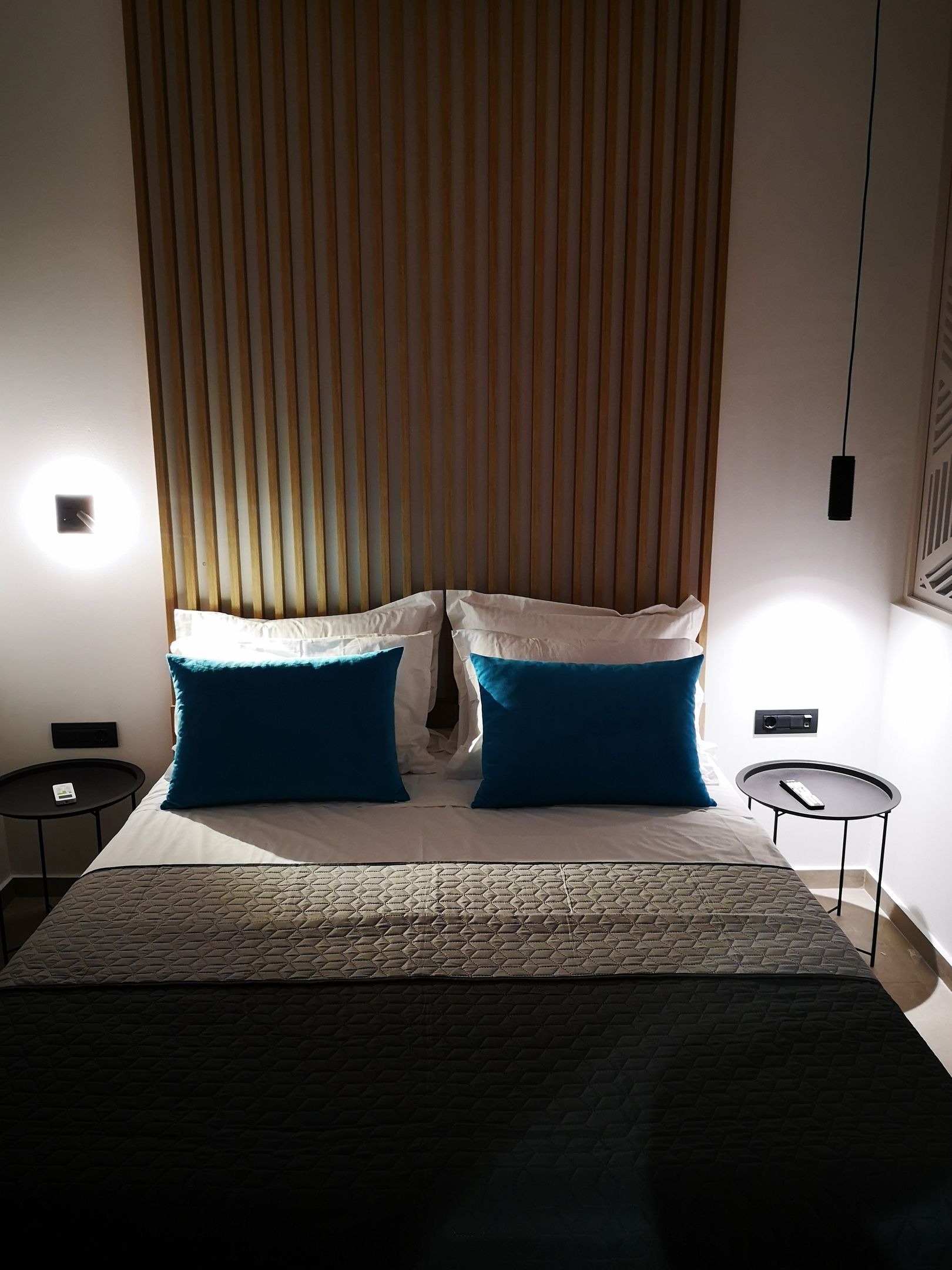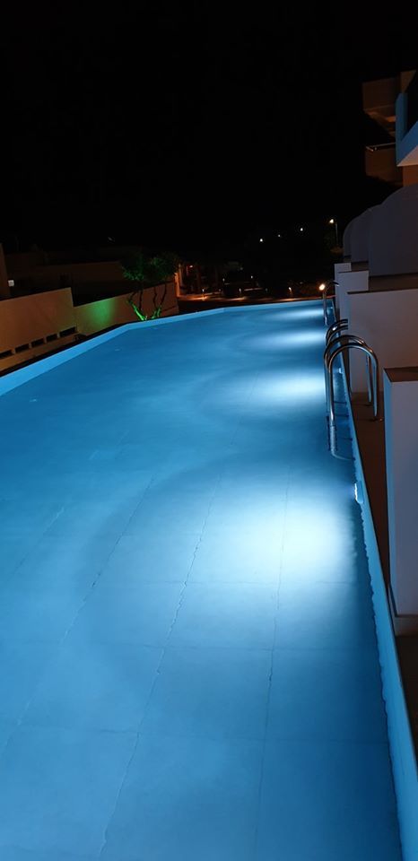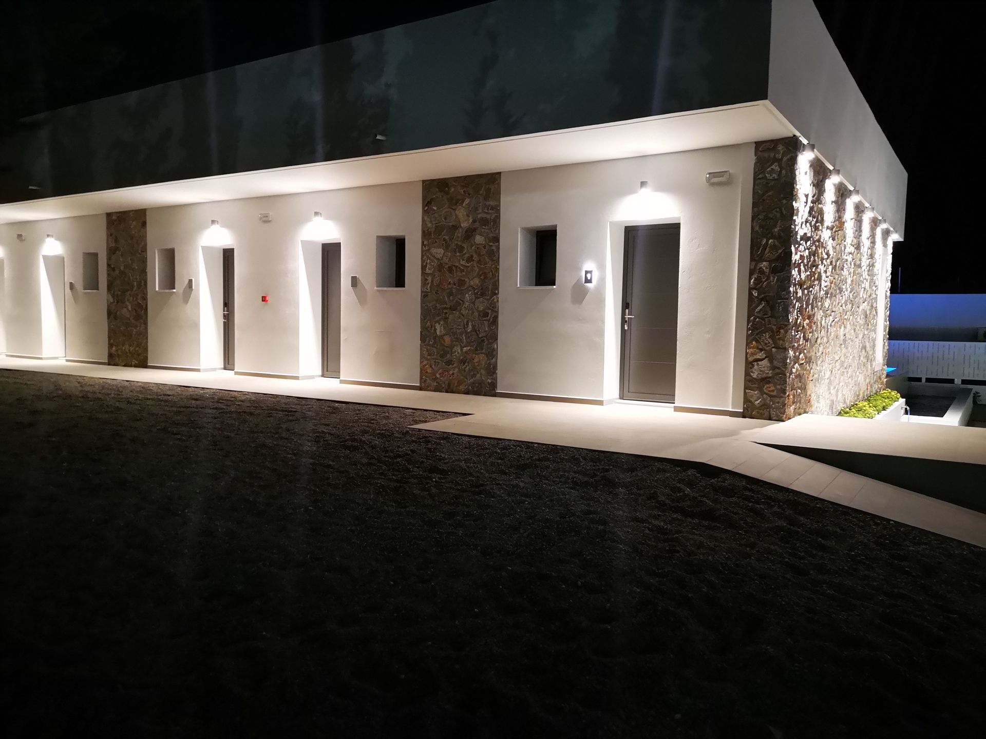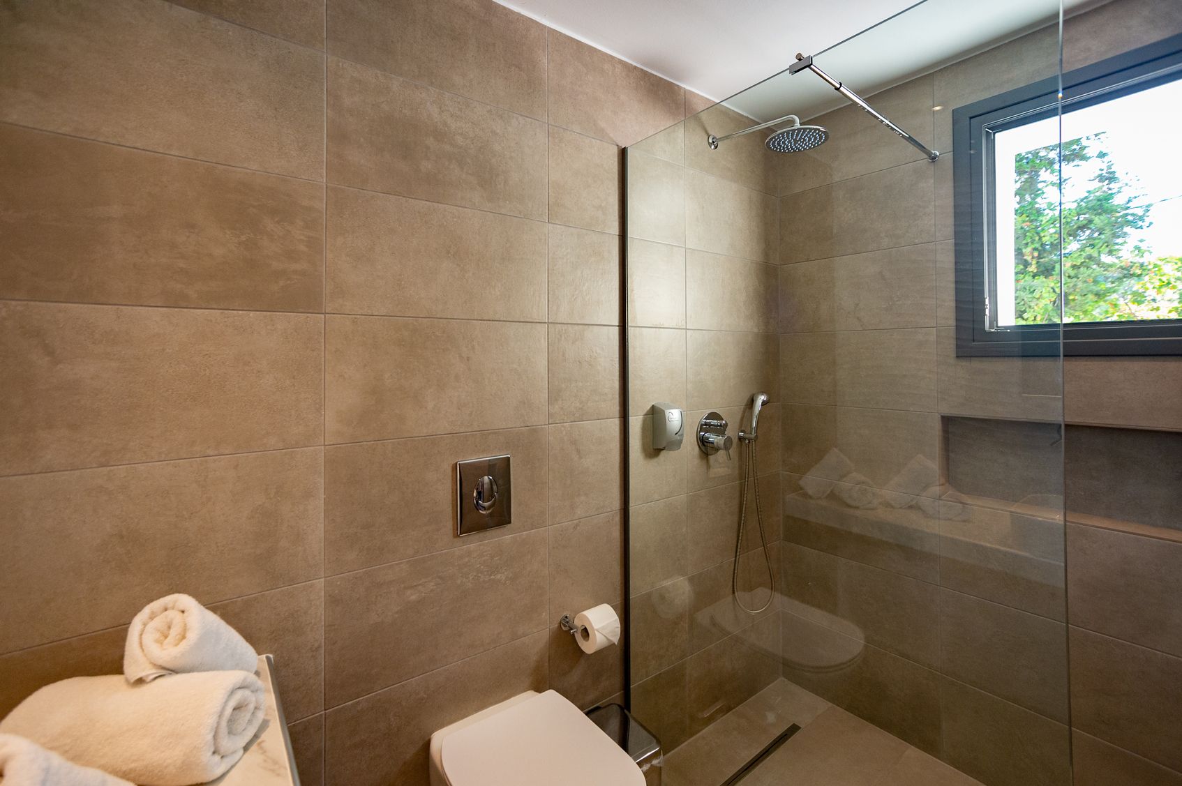 The Suites are all the same size (30 sq. m.) facing the pool & the garden and are equipped with a king size & a sofa single bed, a private bathroom (shower, WC), wardrobe/closet, air condition, safe box, flat 45 inches Smart - Android TV with satellite channels, Wi-Fi & Internet access, fridge, direct telephone line, electric kettle (coffee & tea maker), hair dryer and a 13 sq. m. furnished balcony – veranda with 2 sun loungers – chairs & tables.