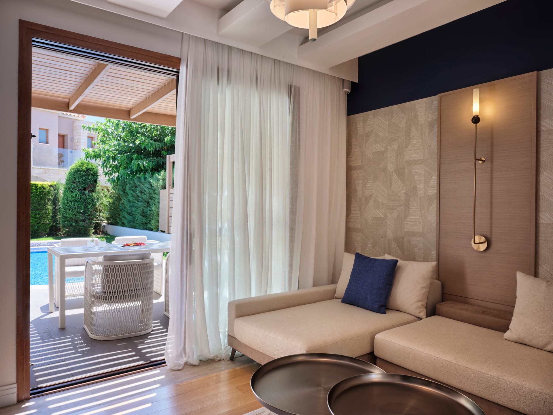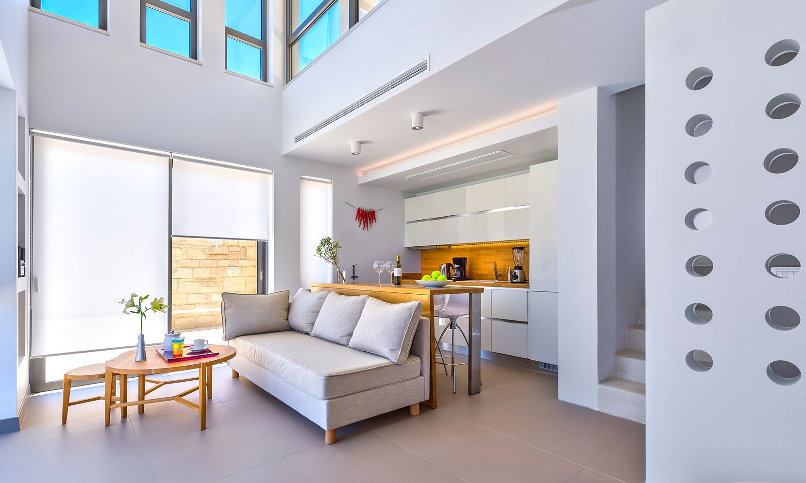 The signature architecture throughout this enchanting property contrasts wood, marble and natural stone blended with surfaces made from the characteristic Cimentogonia.