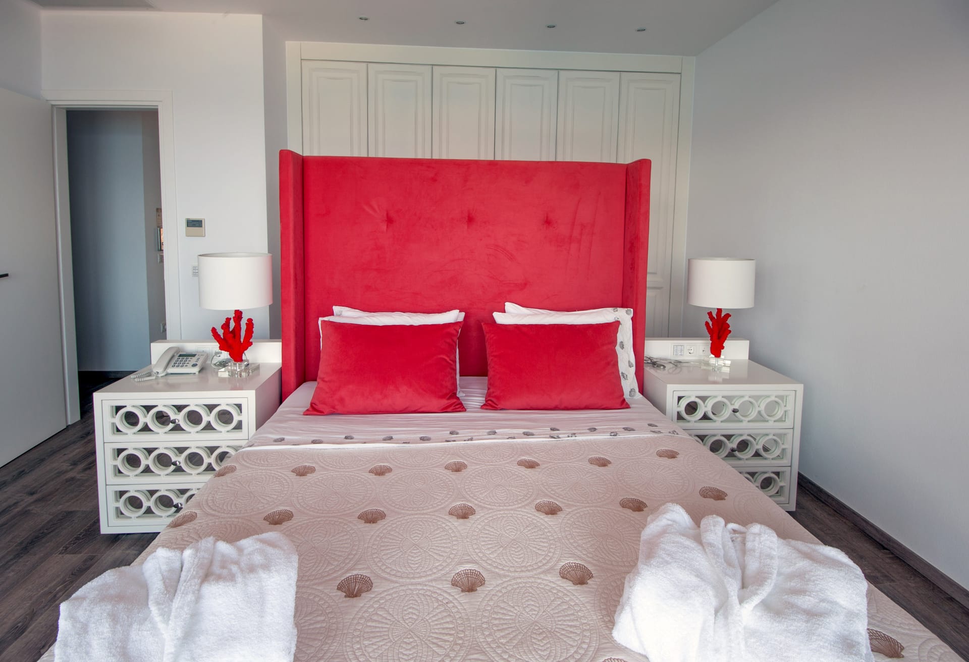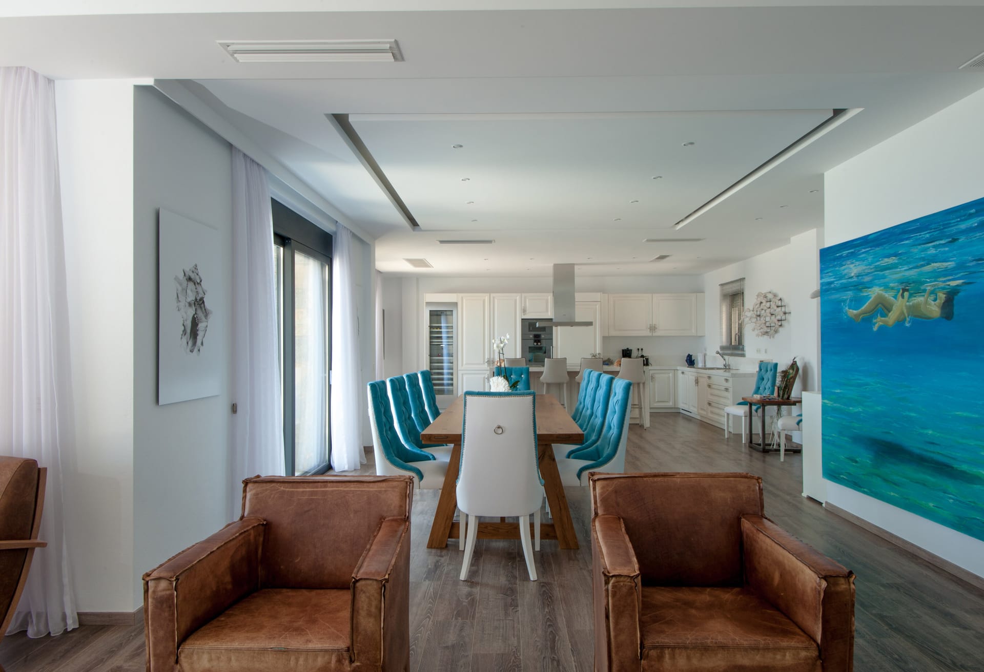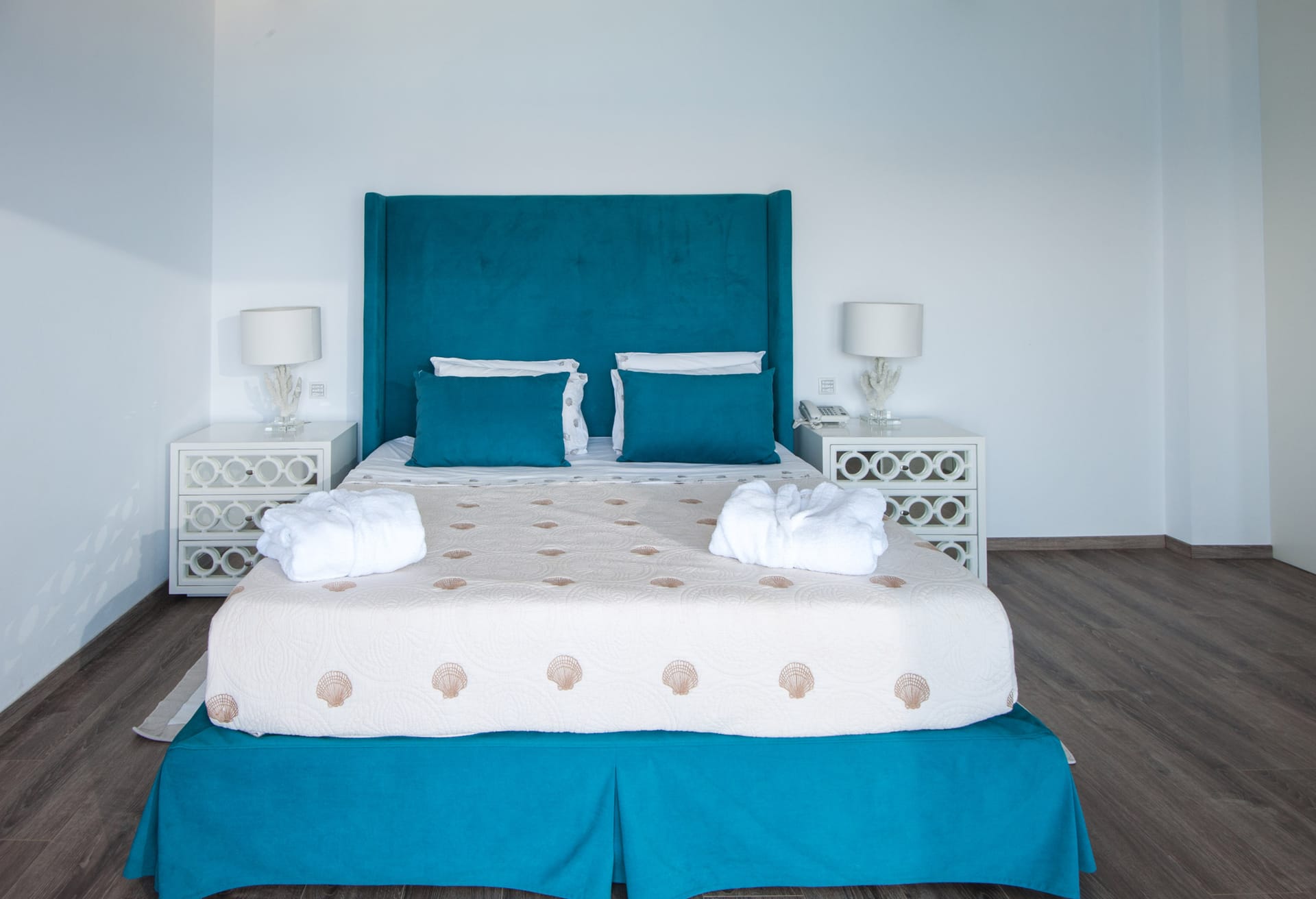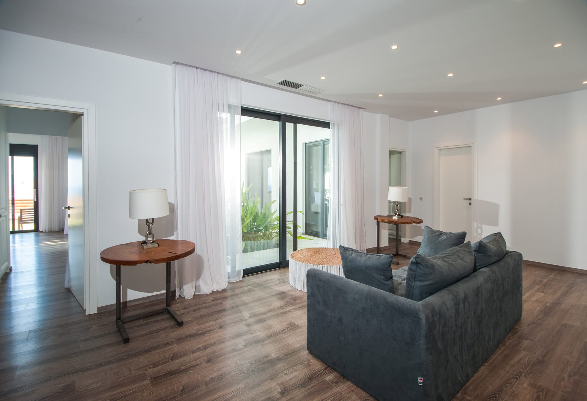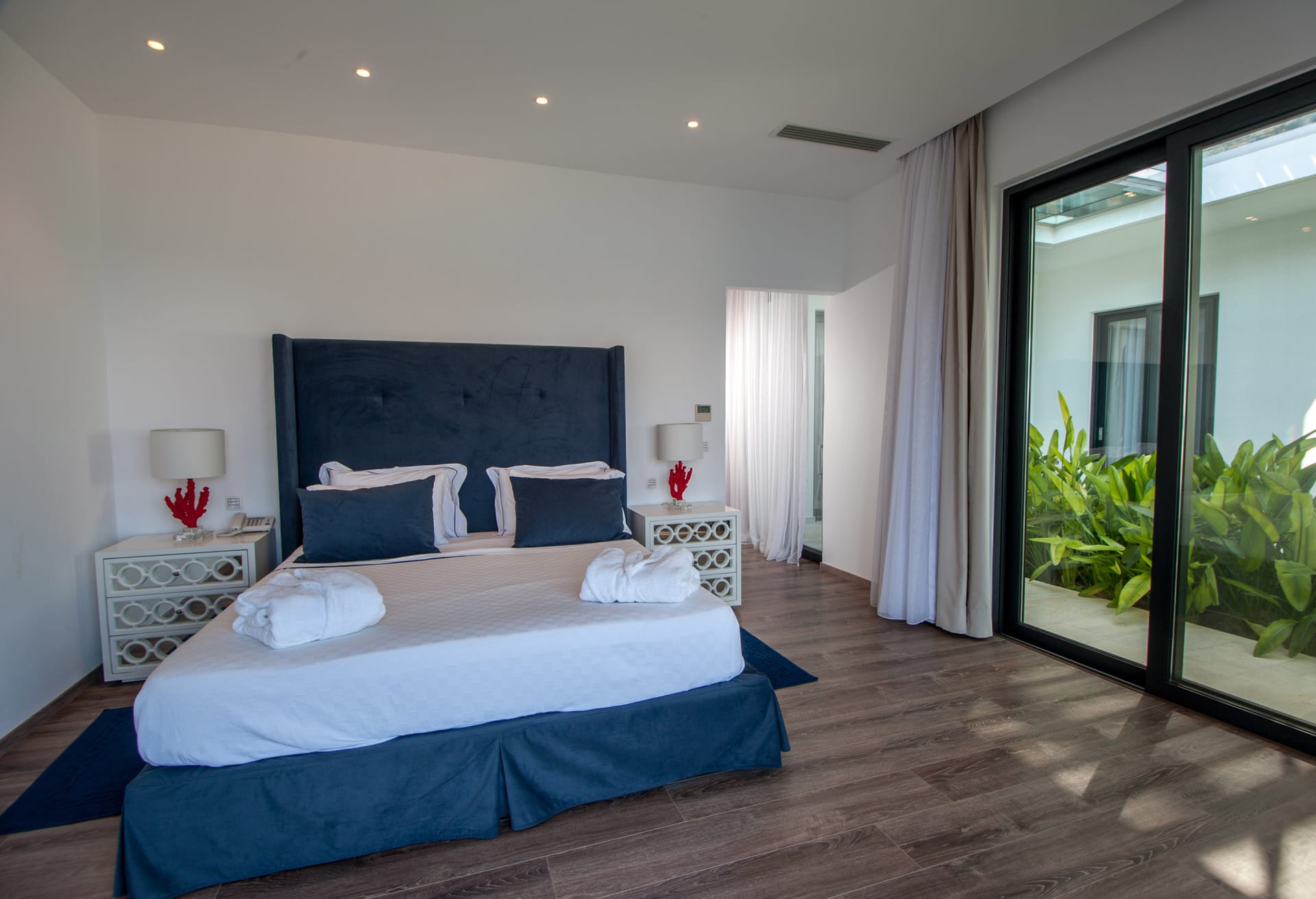 Step into Villa Bellita 2 and be welcomed by a grandeur ground floor featuring a vast open-plan kitchen and living area. Italian hardwood flooring graces the space, complemented by elegant furnishings that exude sophistication. The kitchen, adorned in pristine glassy white, invites culinary adventures, while the living room beckons with plush couches and wide openings leading to the terrace, where lush gardens and panoramic views await.