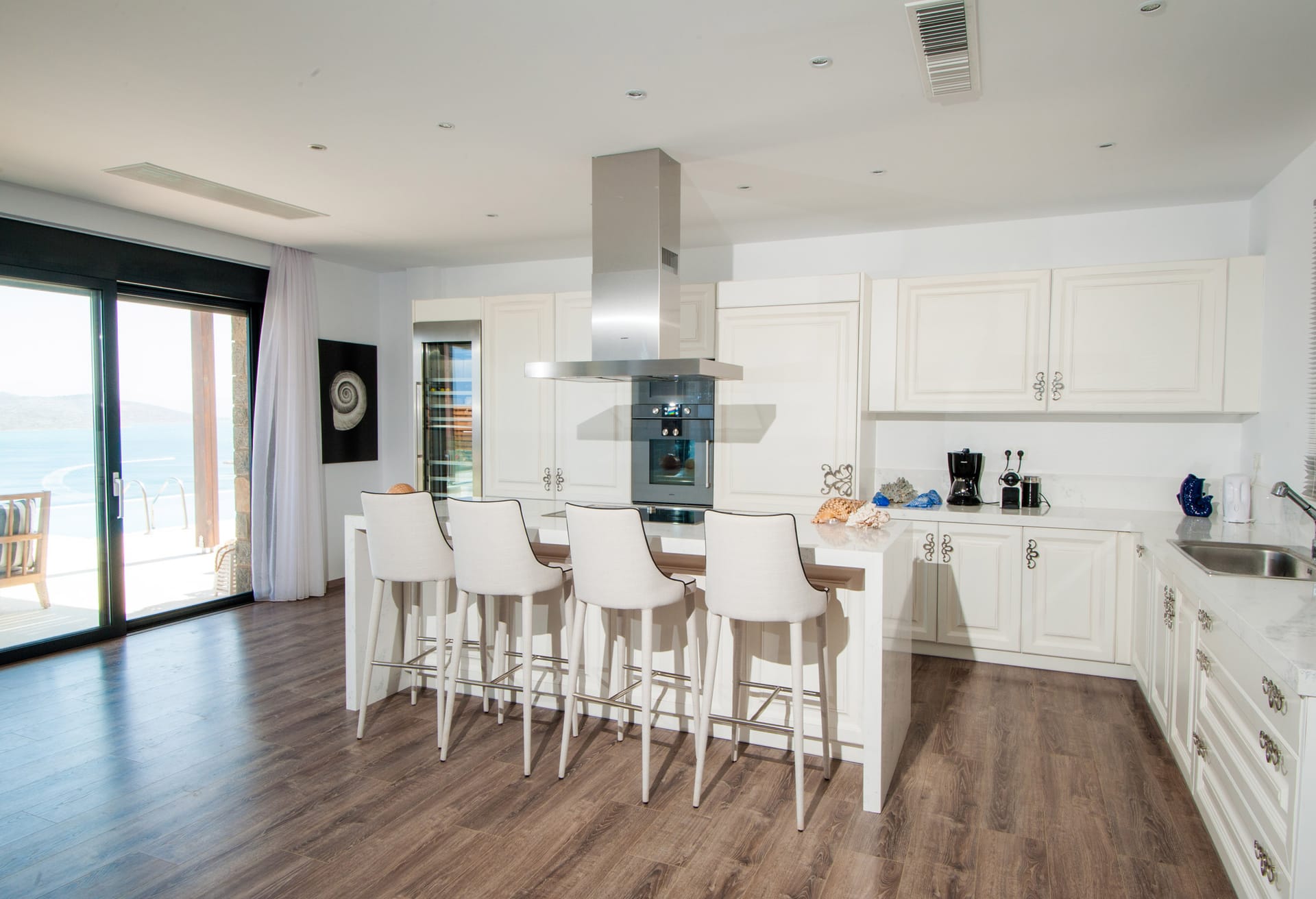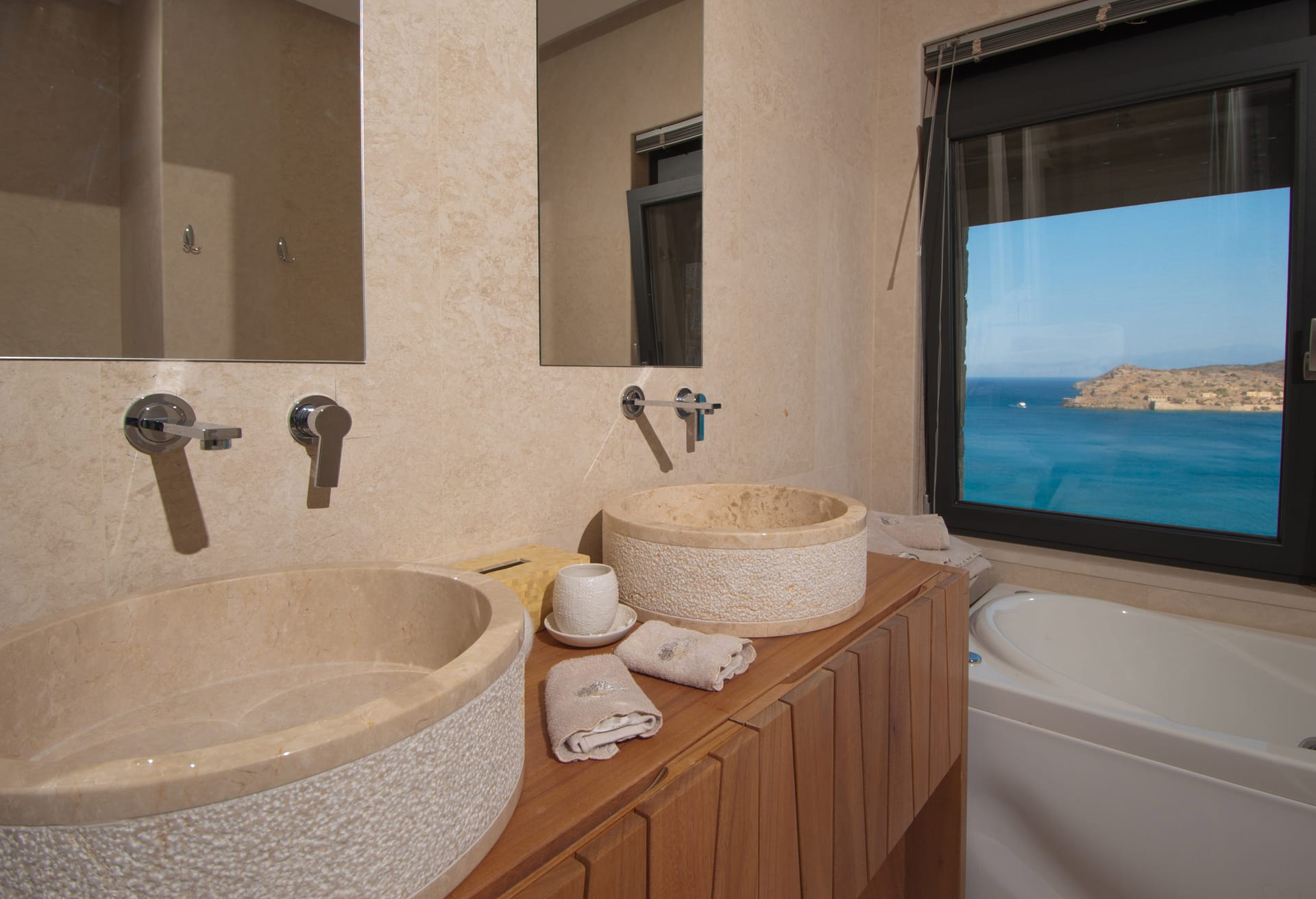 Ascend to the first level to find three more master bedrooms, each boasting queen-sized beds and deluxe ensuite bathrooms. Step onto the patio or balcony from any of these bedrooms and be mesmerized by breathtaking sea views extending to Spinalonga Island. The ensuite bathrooms on this level feature showers and independent bathtubs with Jacuzzi jets, promising moments of serenity amidst unparalleled vistas.