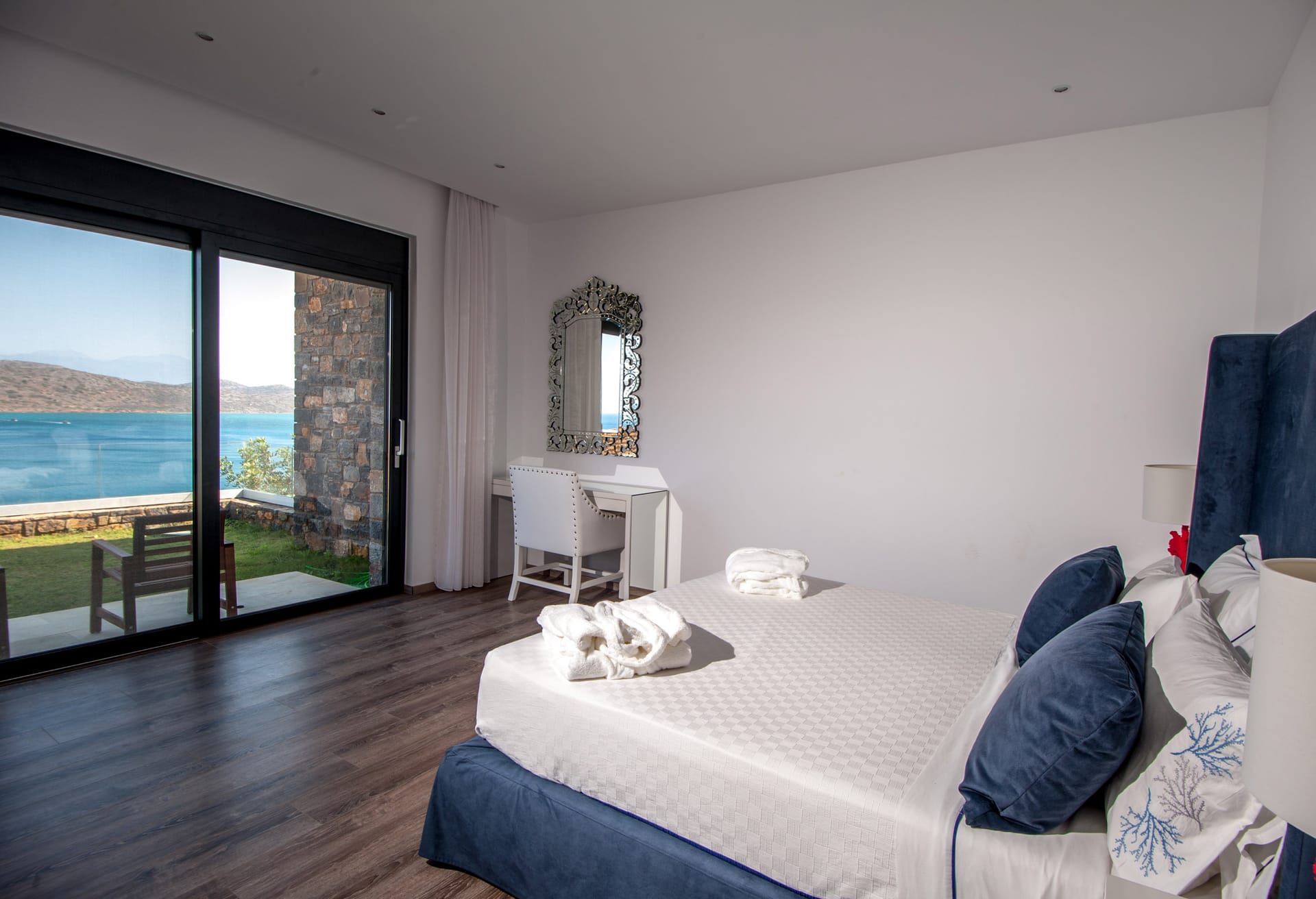 Outside, the private infinity pool seamlessly merges with the mesmerizing waters of the Elounda Gulf, inviting guests to bask in the Mediterranean sunshine. Surrounding terraces, adorned with olive, locust trees, and indigenous plants, evoke the essence of Greece's unique landscape, creating an idyllic setting for relaxation and contemplation.