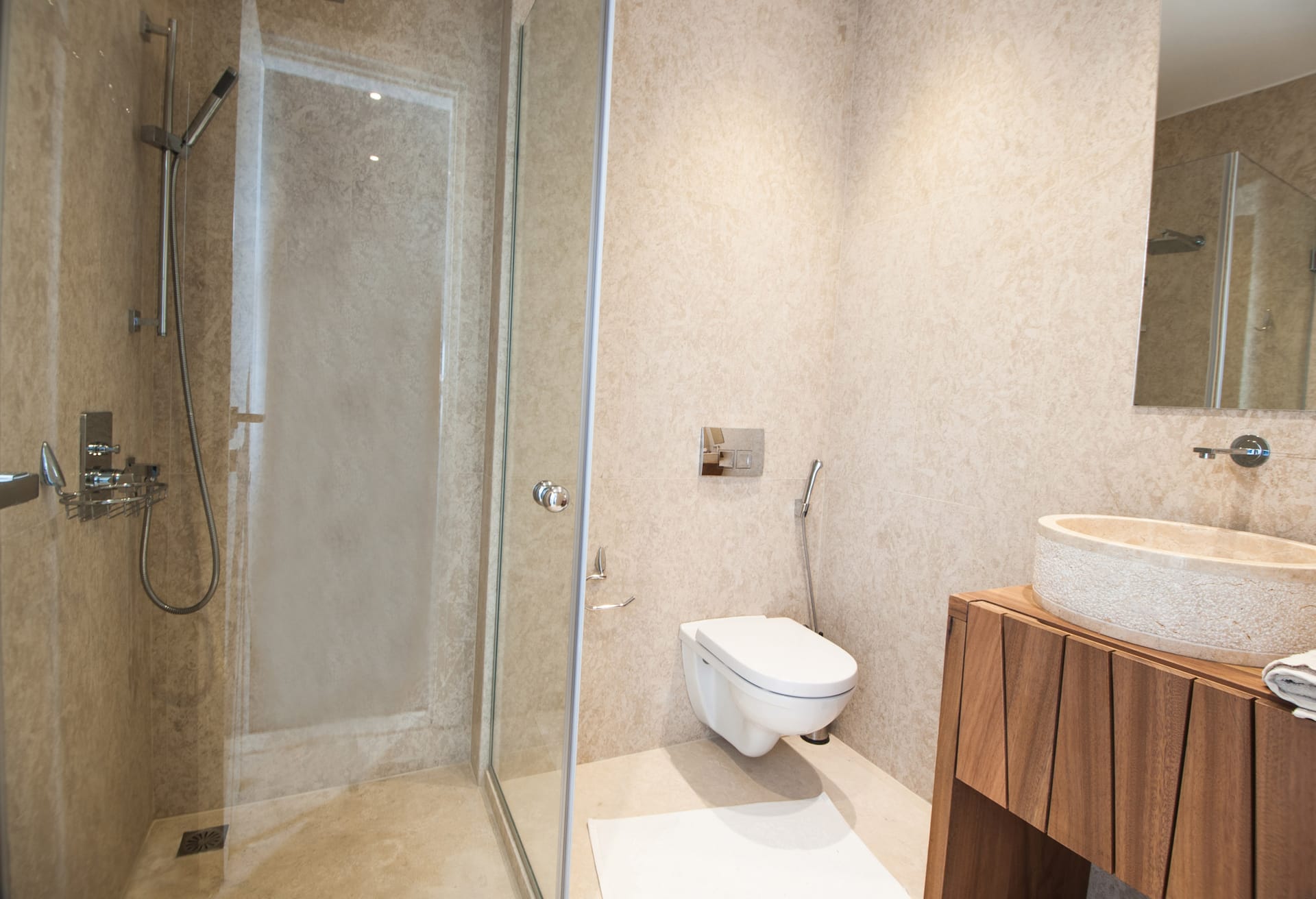 Indulge in moments of relaxation and rejuvenation in the villa's spa-hammam room, complete with a gym and WC, offering a sanctuary for unwinding after a day of exploration. On the garden level, discover two master bedrooms with ensuite bathrooms, featuring standalone showers and luxurious Jacuzzi-equipped bathtubs. An additional bedroom, perfect for a nanny or children, overlooks the verdant garden, ensuring comfort and privacy for all guests.
