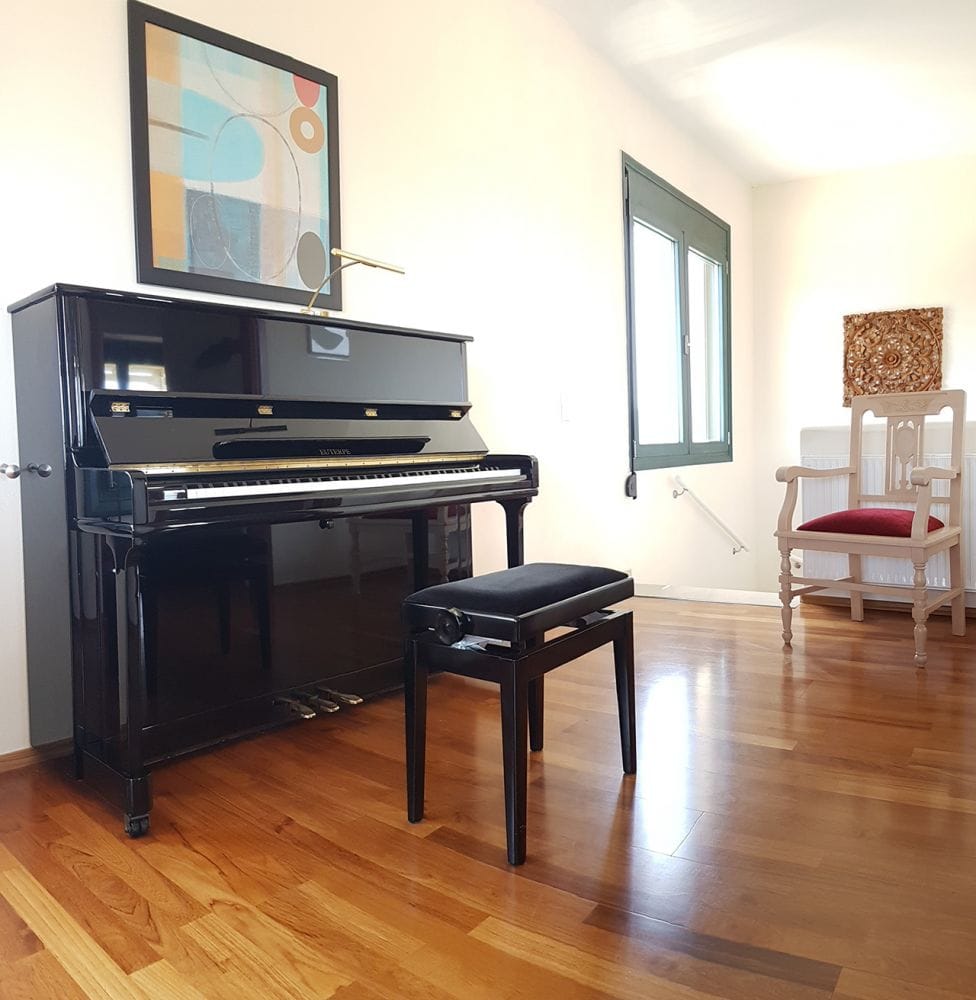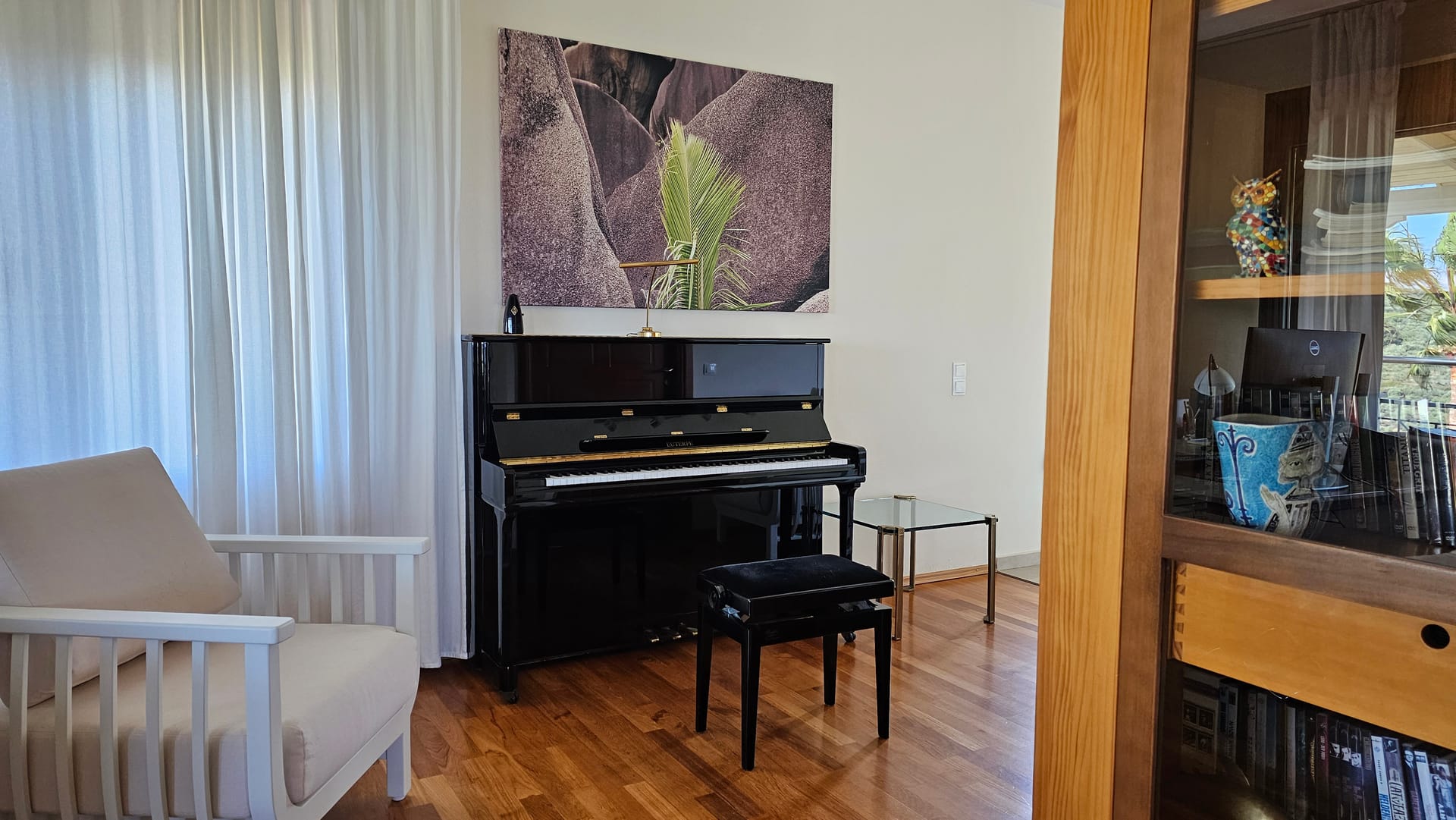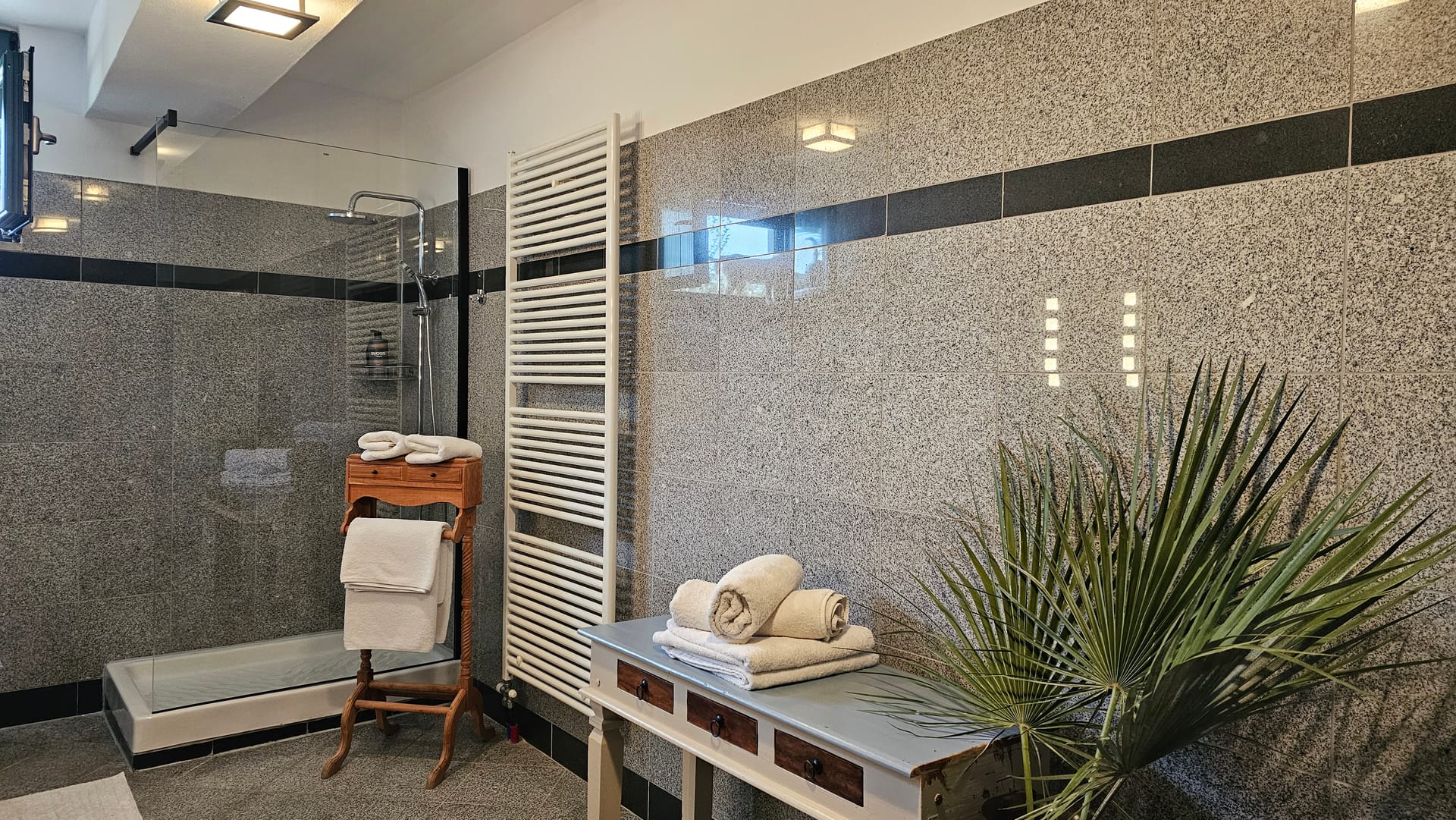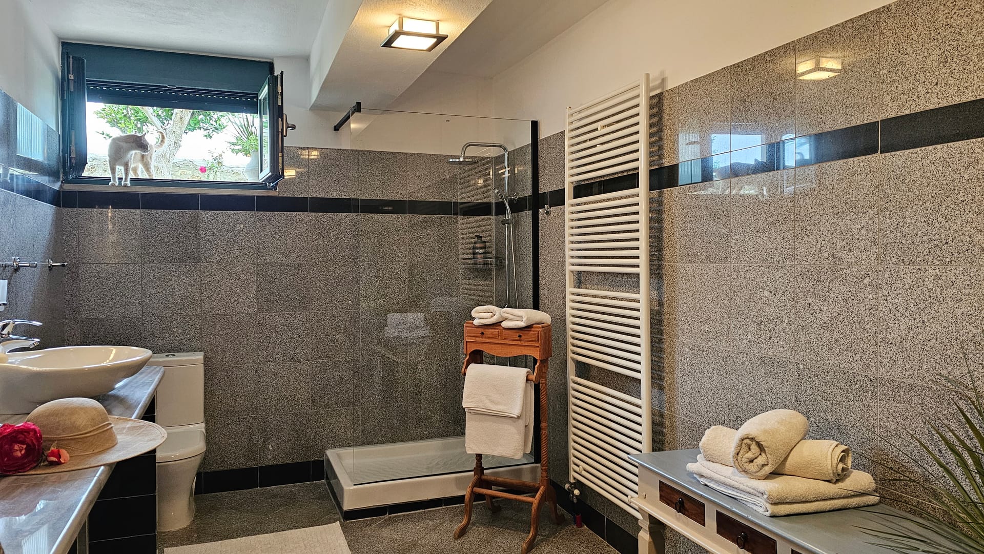 Access via the ground floor opens to a spacious two-storey high living room with a modern and eco-friendly fireplace while the open-plan kitchen area has practical wooden work surfaces, an informal dining area and top-of-the-range appliances.