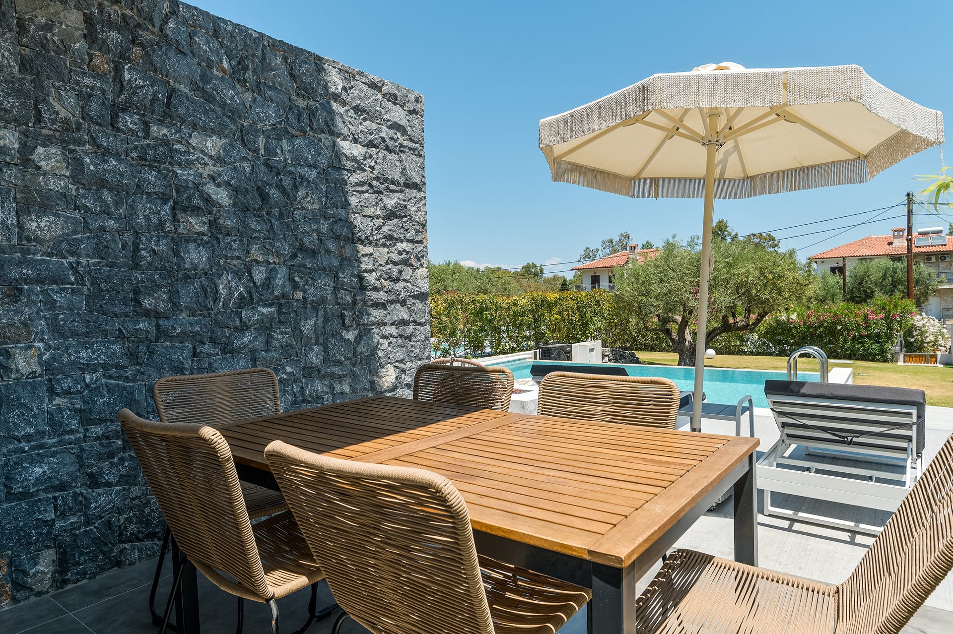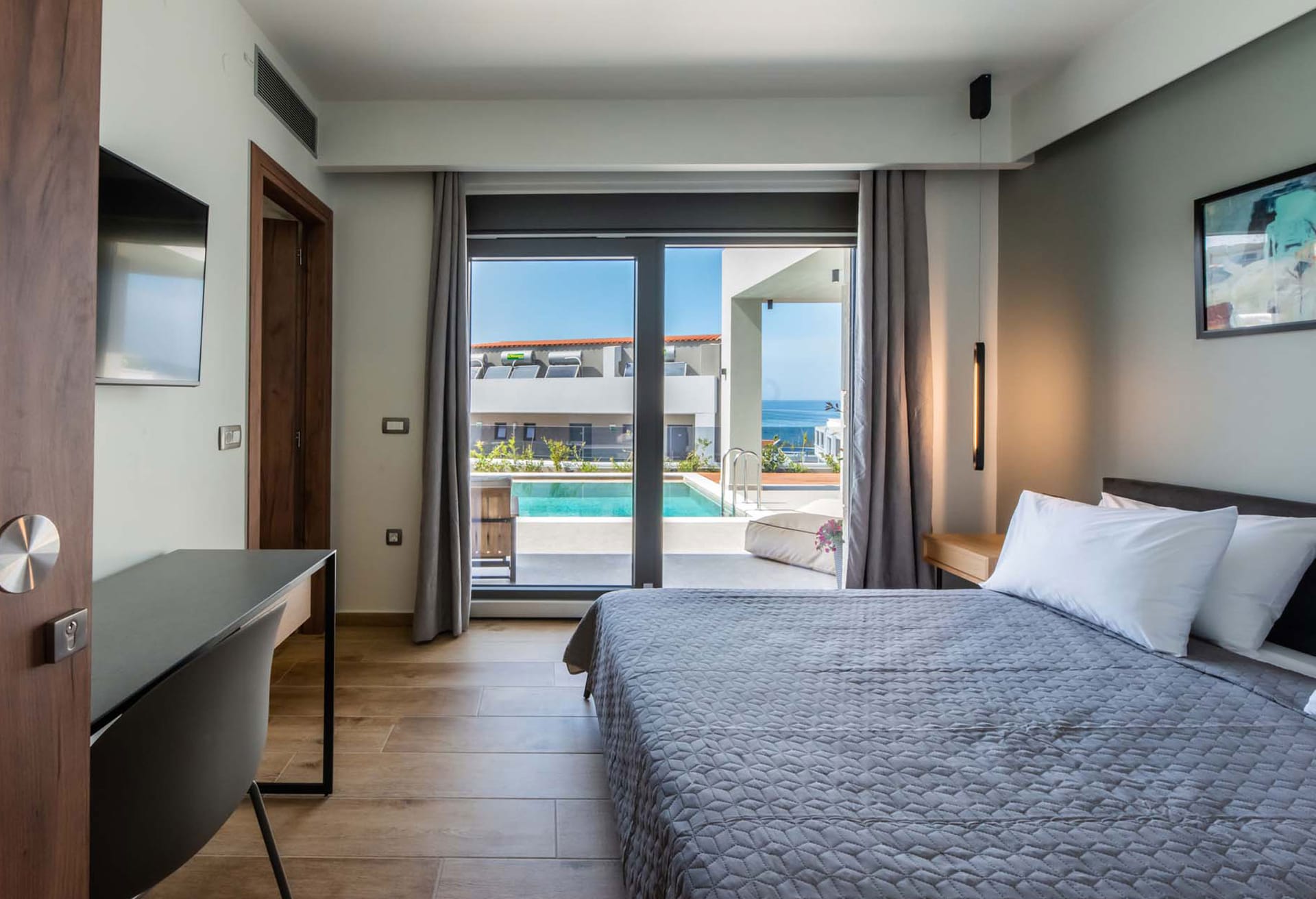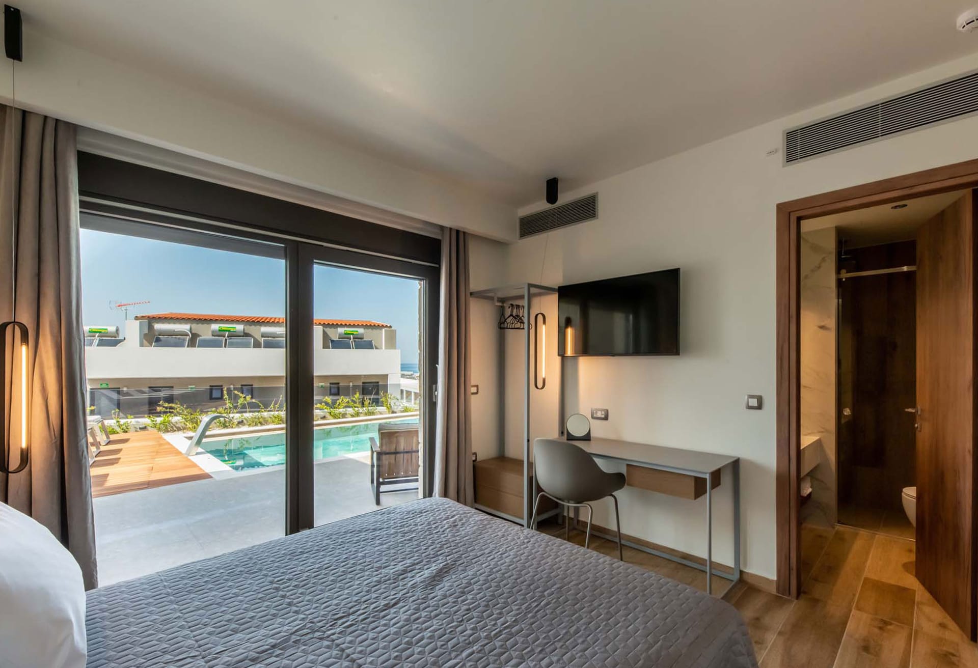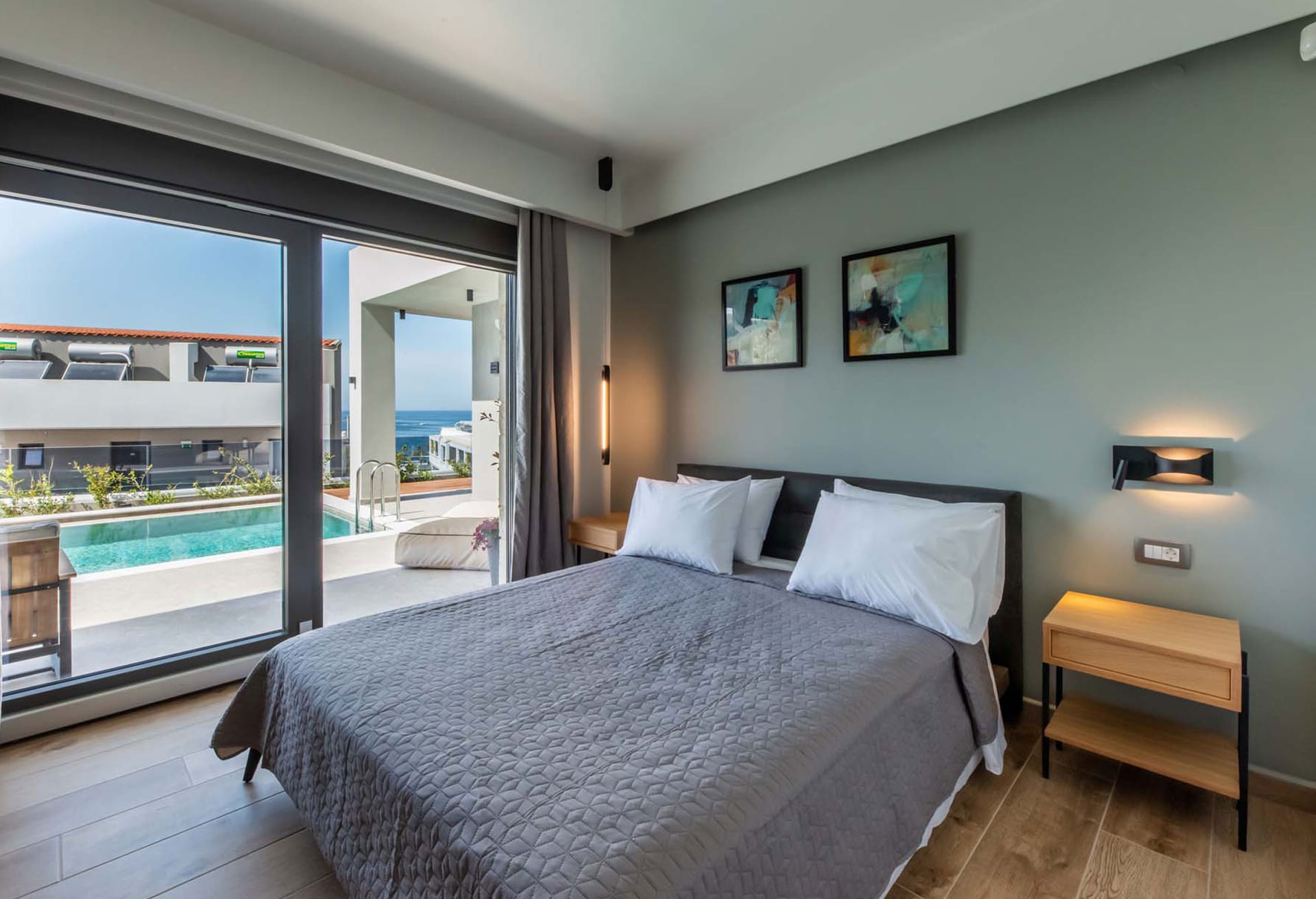-Bedroom 1: Double size bed (1.60x2.00), A/C, 43’’ Smart Satellite TV, ensuite bathroom with shower, direct access to the pool area