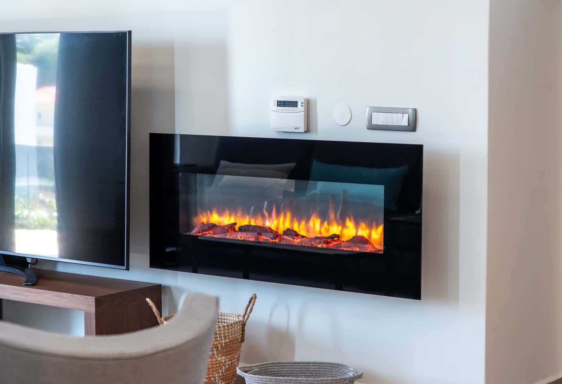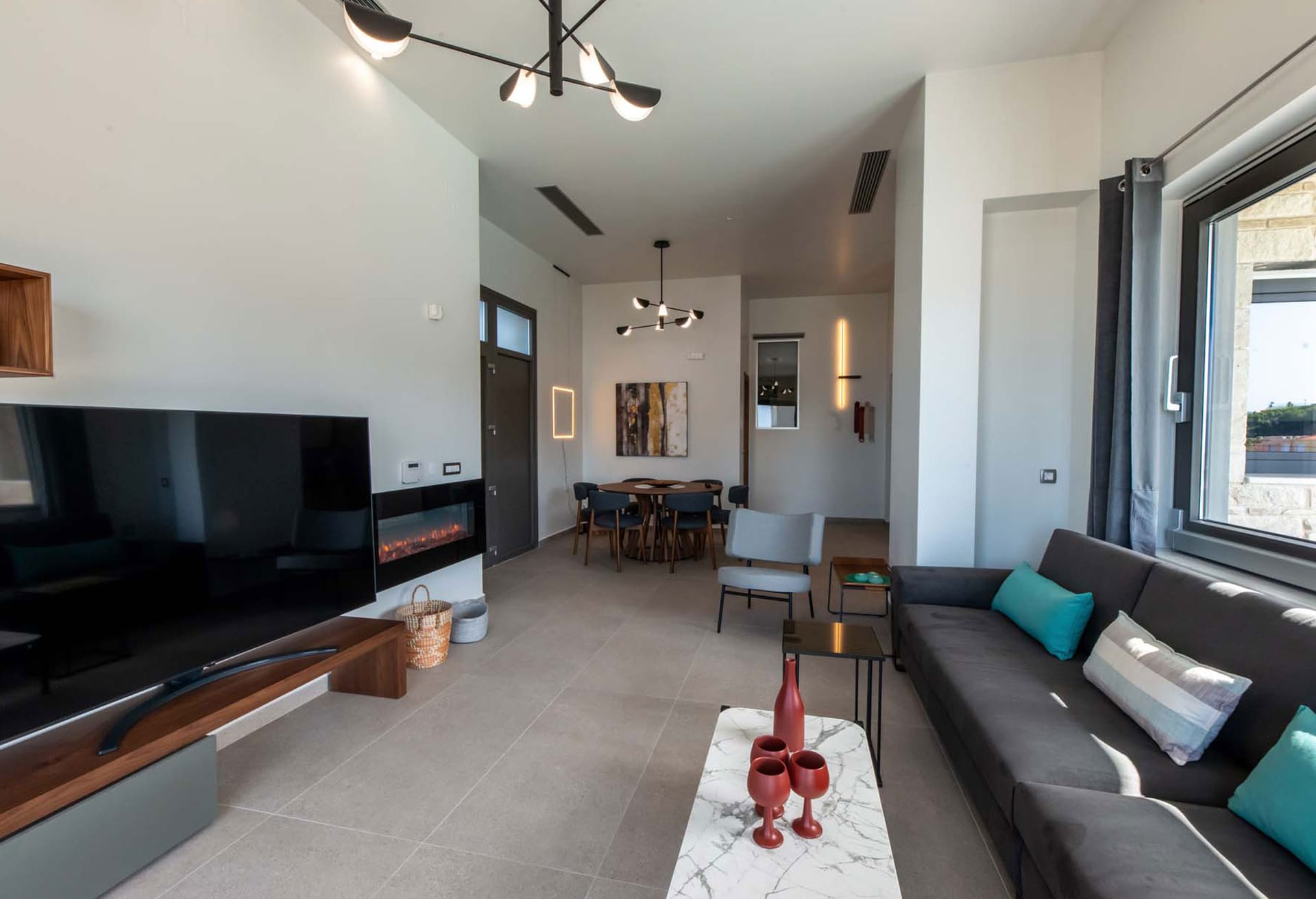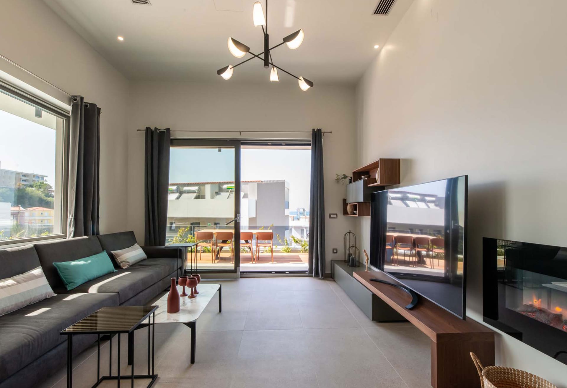 -Living area with sofa, 60’’ satellite Smart TV, electrical fireplace, access to the pool terrace, sea view