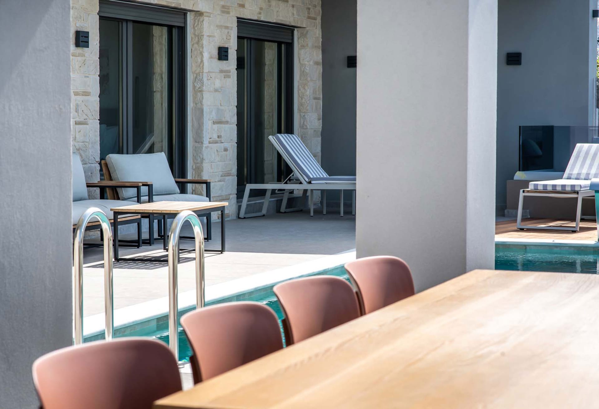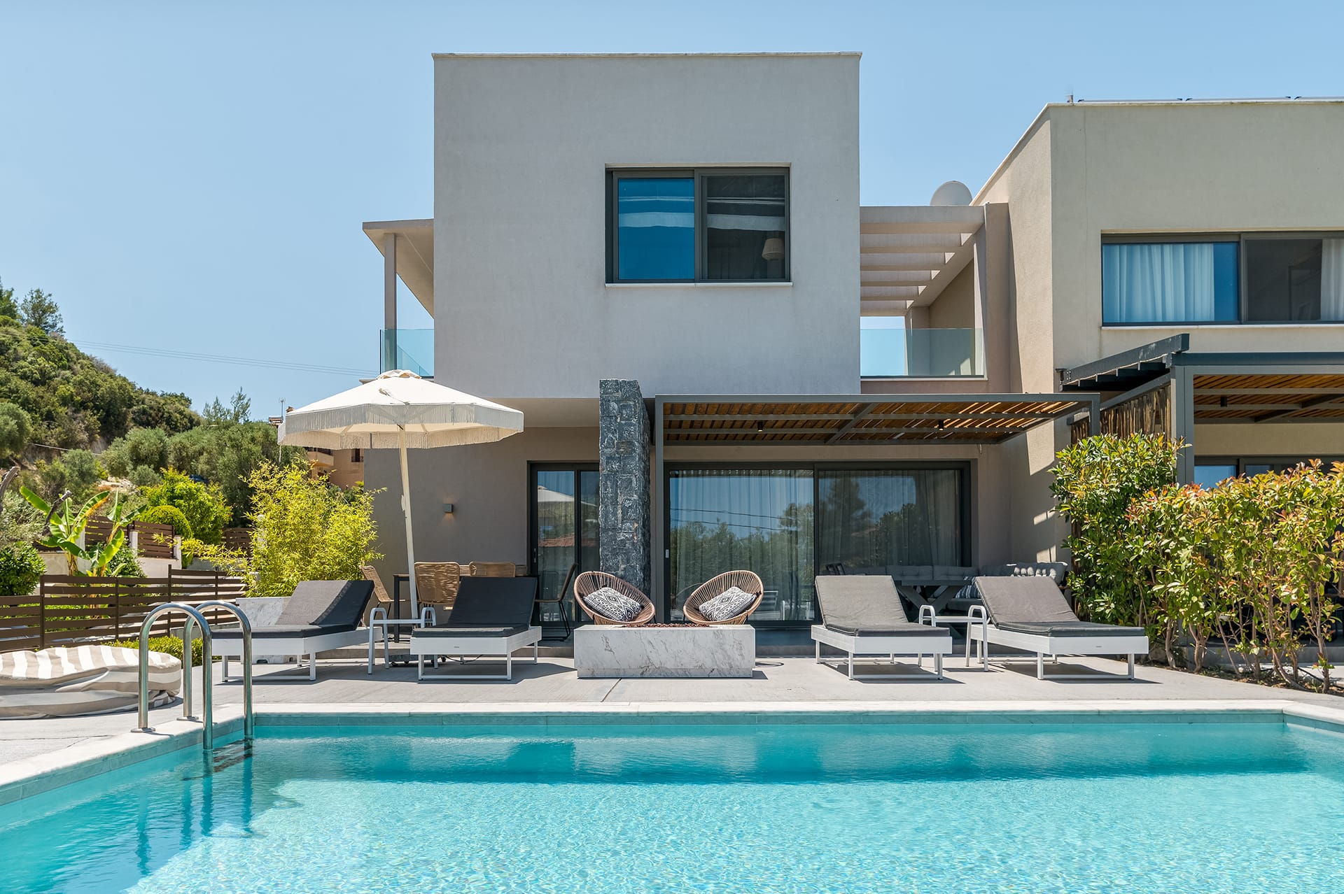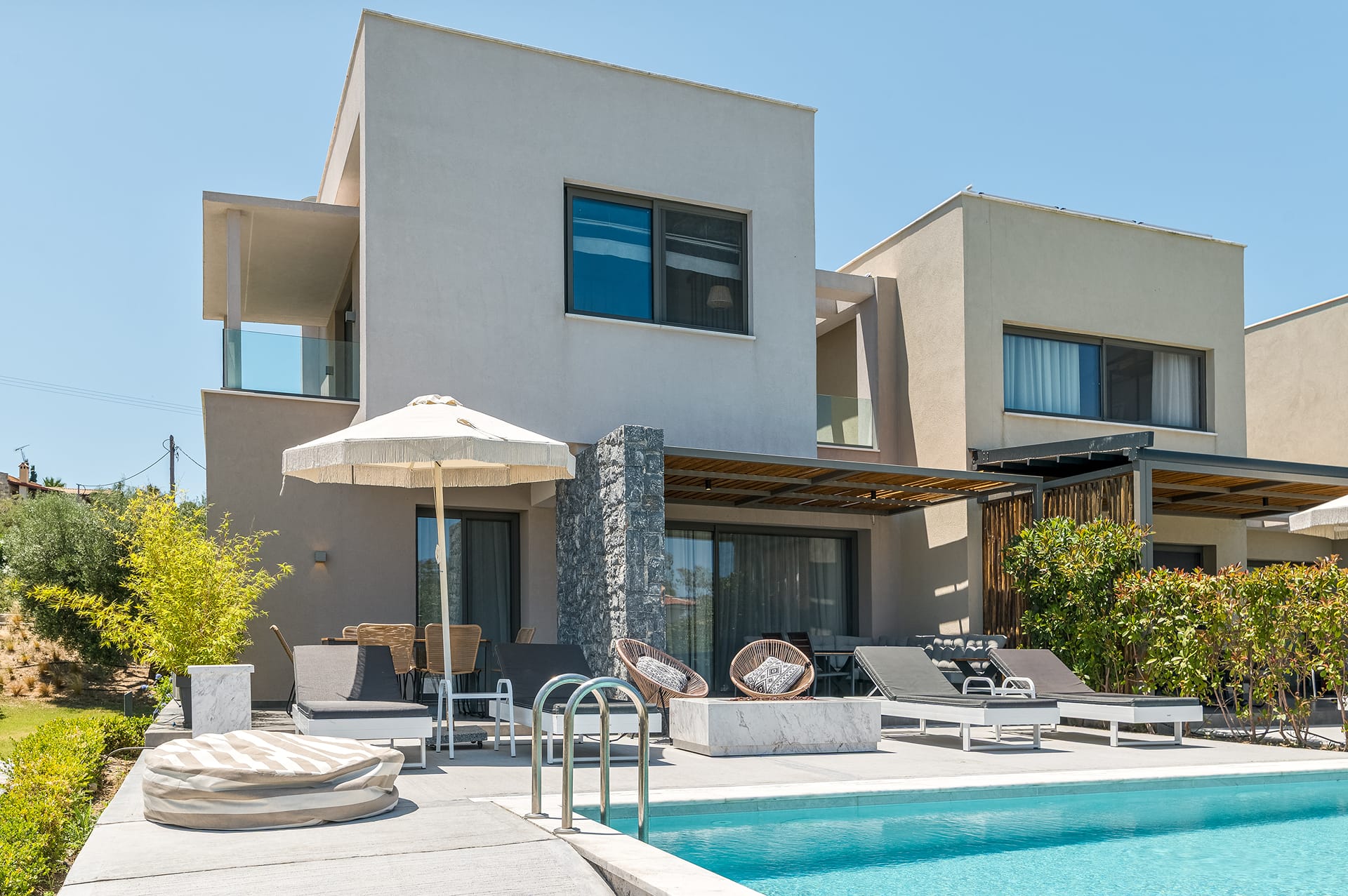 Entering the villa from the main entrance, you will find a well-organized fully equipped kitchen with electrical appliances, a dining table, and a living area with a sofa and a satellite TV. Relax on the comfortable sofas or dine in the outdoor dining area on the balcony overlooking the crystal waters of the Sea. Villa Luna consists of three bedrooms with high-quality sleeping comfort. On the single floor, there is a sofa that can be converted into a double-size bed. Airy and spacious, the two bedrooms feature double-size beds while the third one has twin beds, ensuite bathrooms, satellite Smart TVs, and neutral-earth colors, something that creates the perfect atmosphere for your relaxed and carefree holidays. On the same floor, you will find a fully equipped gym where you can keep your fitness routine even when you are on vacation, a sofa for 2, and a WC.