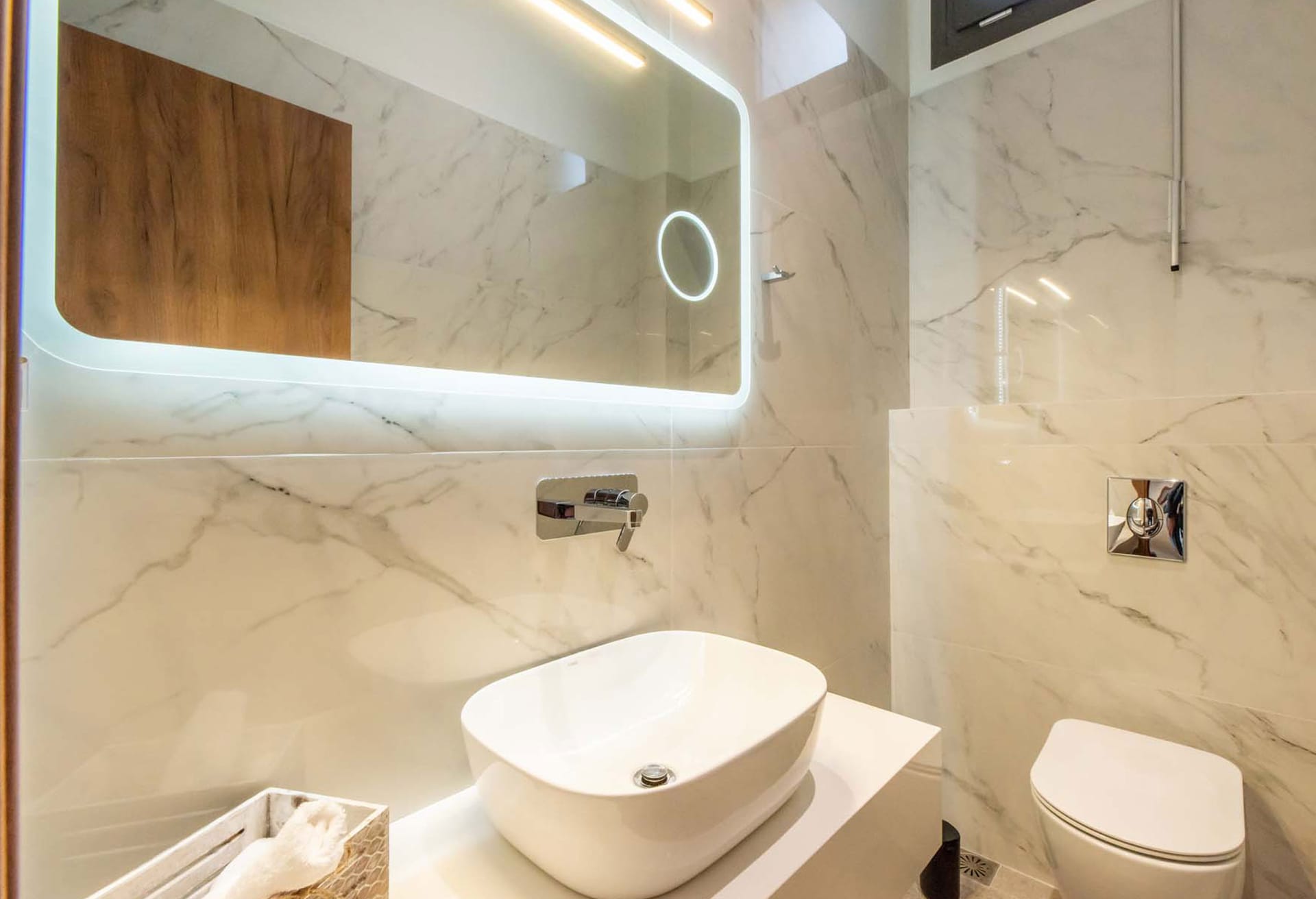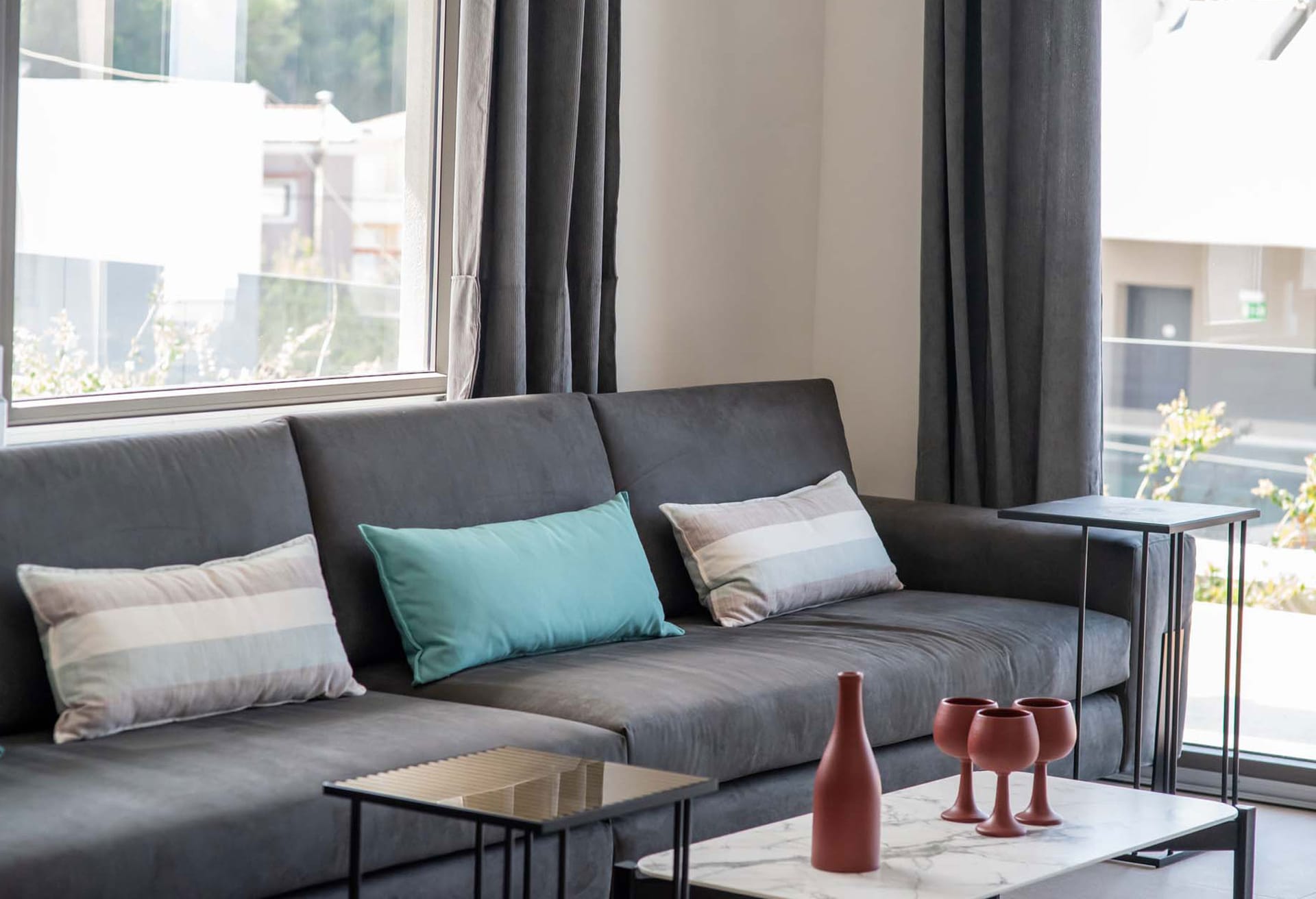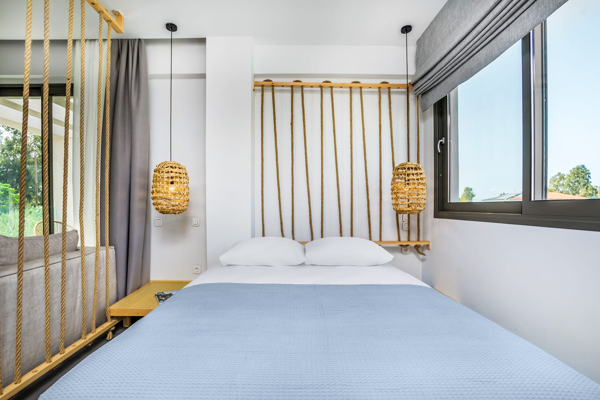 Entering the villa from the main entrance, you will find a well-organized fully equipped kitchen with electrical appliances, a dining table, and a living area with a sofa and a satellite TV. Relax on the comfortable sofas or dine in the outdoor dining area on the balcony overlooking the crystal waters of the Sea. Villa Luna consists of three bedrooms with high-quality sleeping comfort. On the single floor, there is a sofa that can be converted into a double-size bed. Airy and spacious, the two bedrooms feature double-size beds while the third one has twin beds, ensuite bathrooms, satellite Smart TVs, and neutral-earth colors, something that creates the perfect atmosphere for your relaxed and carefree holidays. On the same floor, you will find a fully equipped gym where you can keep your fitness routine even when you are on vacation, a sofa for 2, and a WC.