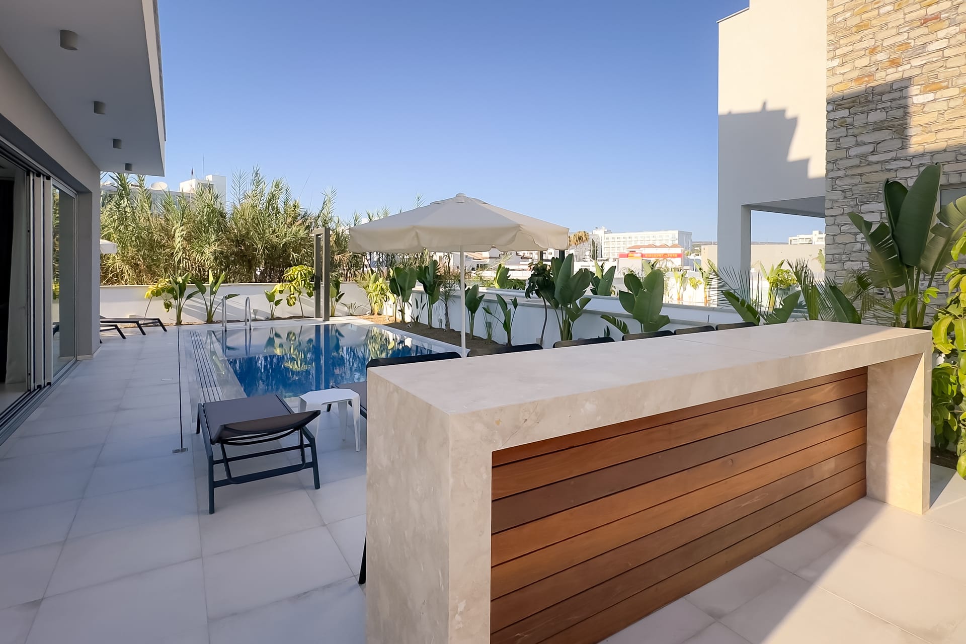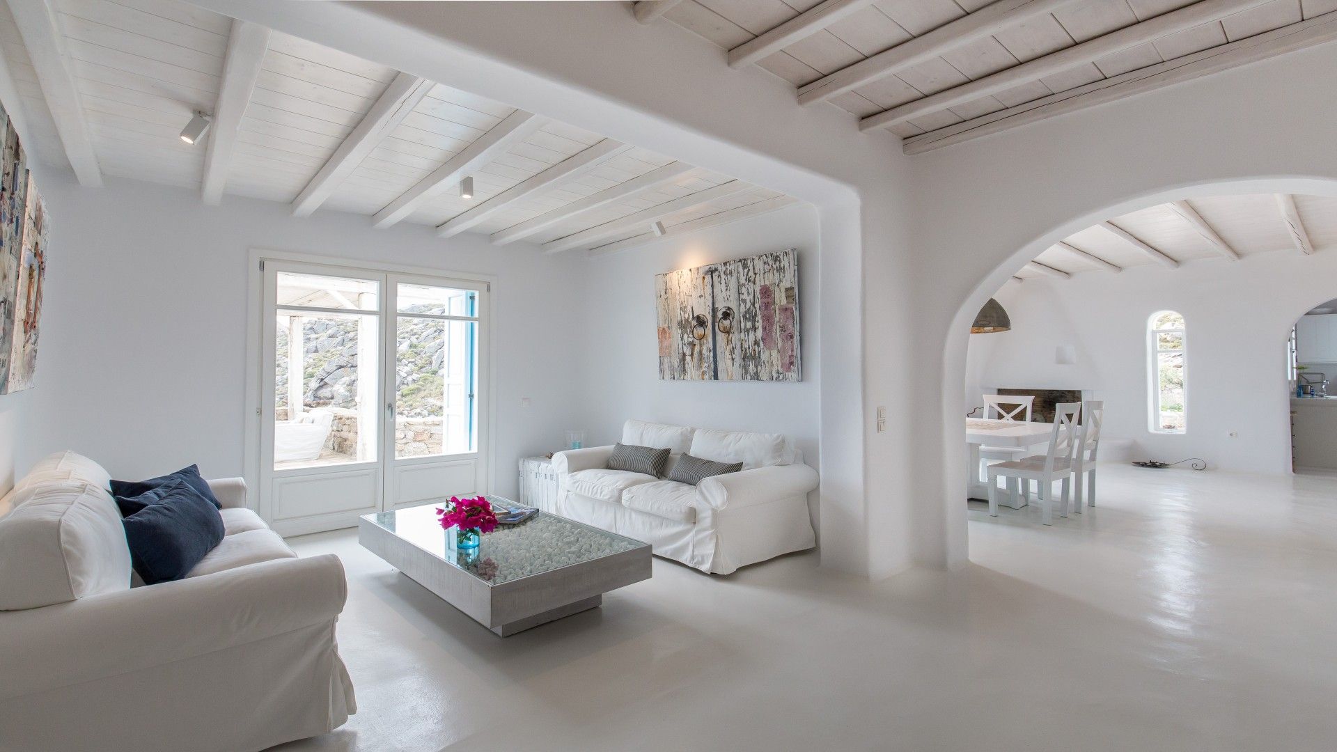 spacious open space living area with comfortable couches, dining area and a fully equipped kitchen. Glass doors lead to an open-air dinning area in a large covered balcony with stunning sea views. On the other side the living room is connected to a large open terrace next to the private infinity swimming pool.