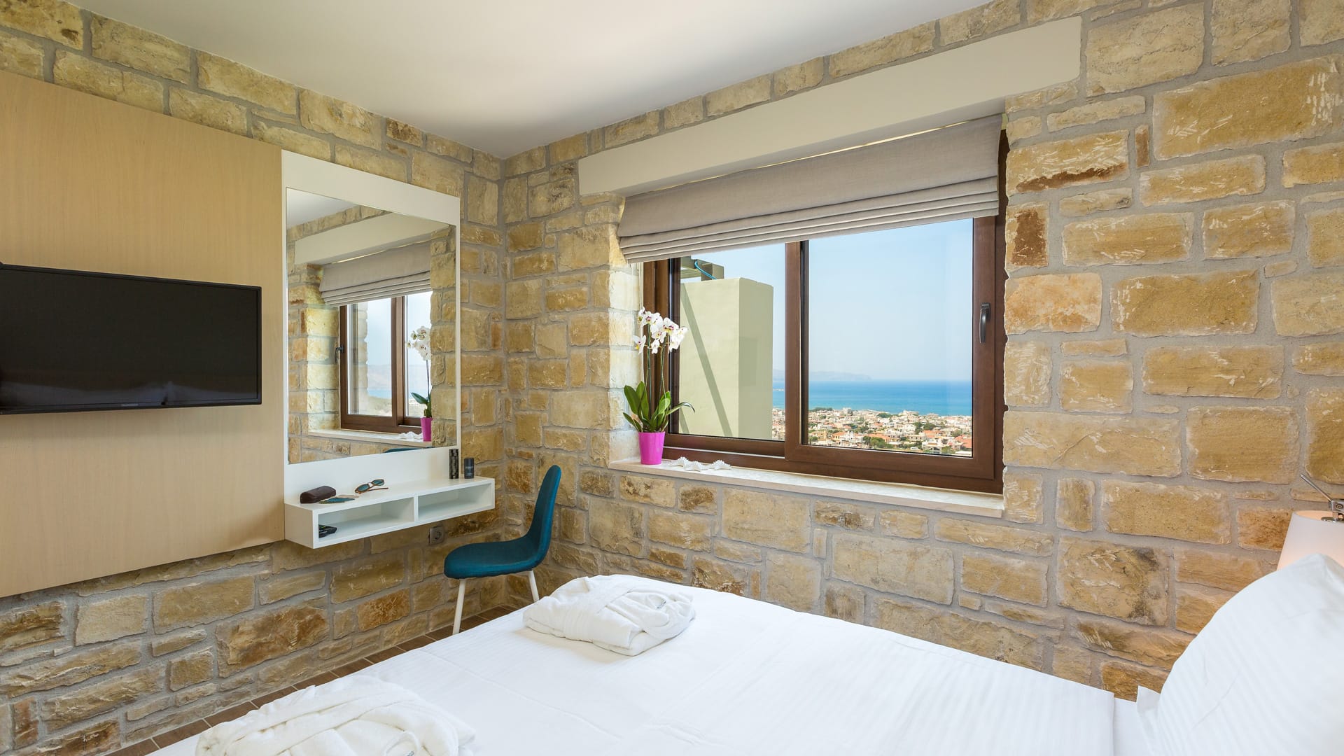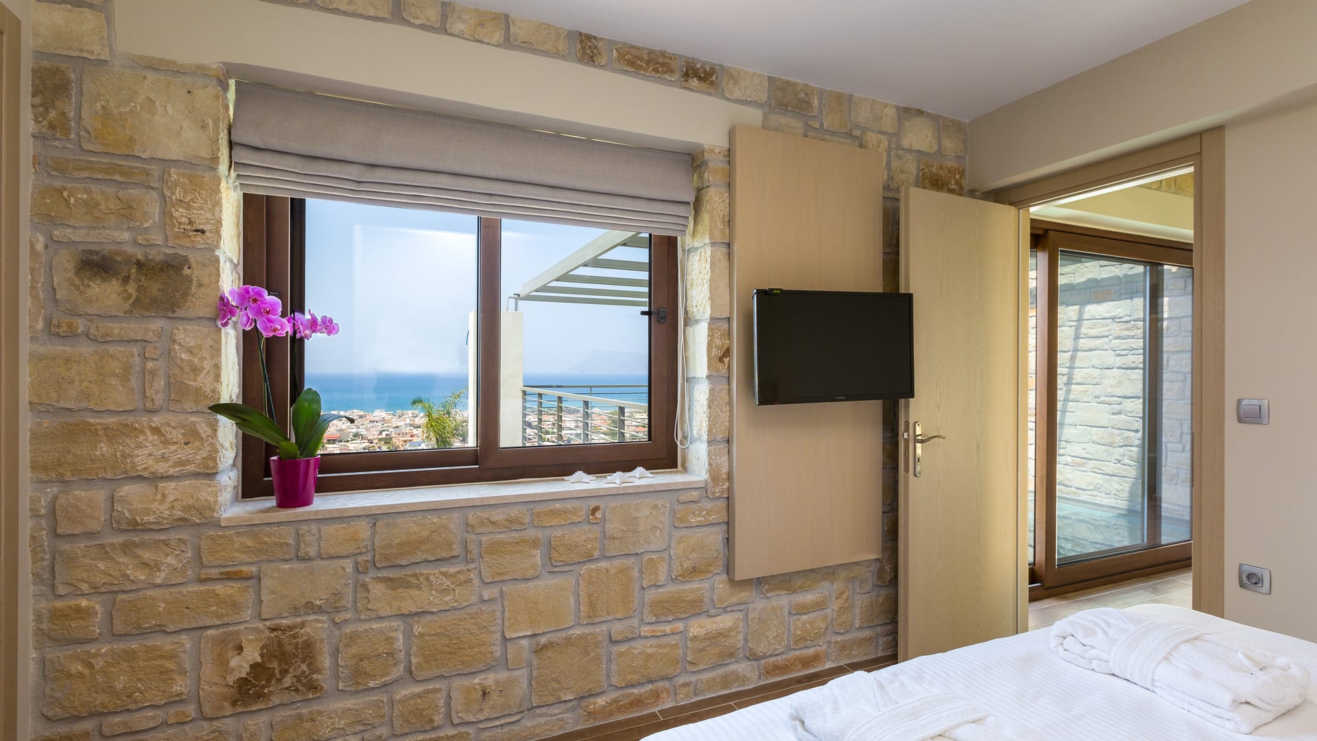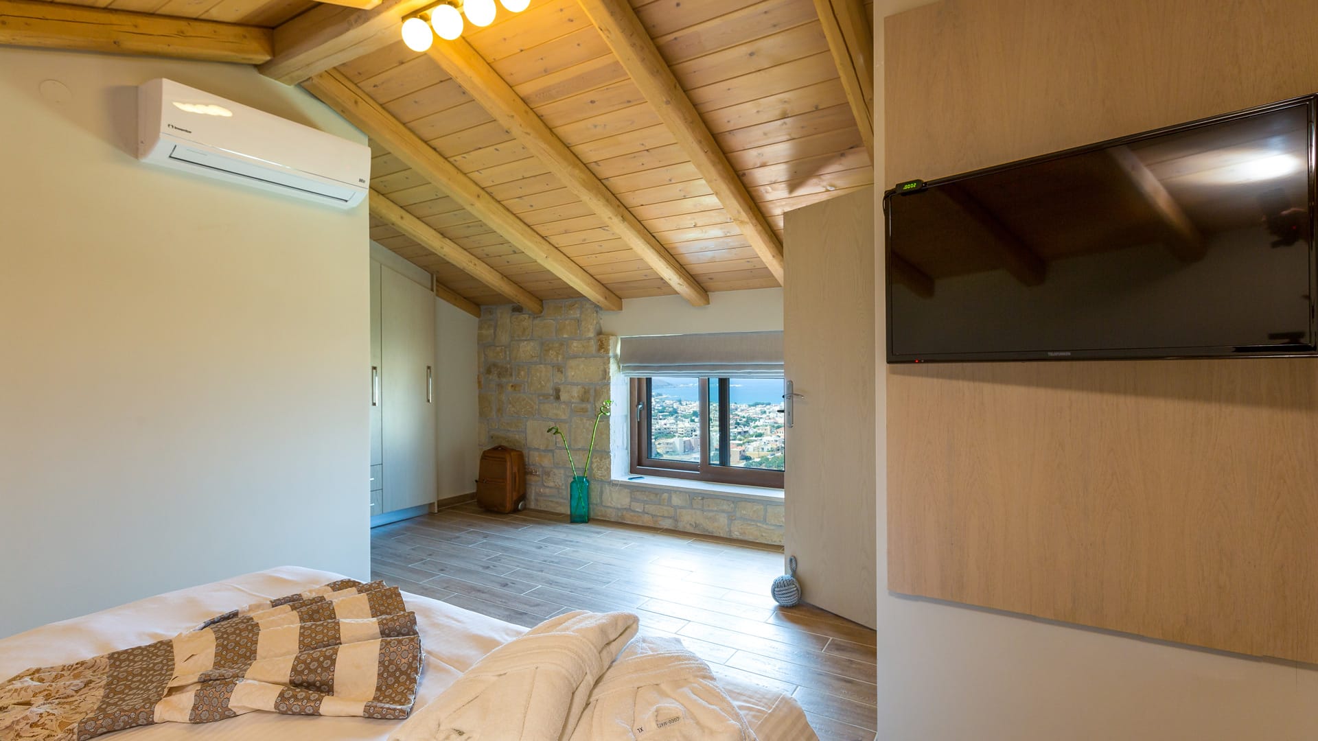 Villa Bretta is located on a hill and it offers you an amazing view not only during the day but during the night as well when the city lights add some extra spark of romance to the already magnificent atmosphere. On the ground floor, you can find the pool area with a heated pool of 40. a fully equipped kitchen, an internal living room with a salon, a satellite LG curved 65’’ TV and a dining table area for 10 guests. On the same floor, there is a bedroom that features a private entrance with a double-size bed and a communal bathroom. On the upper floor, there are two bedrooms with double-size beds, satellite TV, and an ensuite bathroom. Another bedroom with twin single beds exists on the first floor, with a satellite smart screen TV with an ensuite bathroom. On the attic floor, there is a bedroom with a king-size bed with a satellite smart screen TV, that offers unobstructed views of the sea of Crete from each corner, welcoming esteemed guests to relax and sleep in complete privacy. There is a continuity between indoor and outdoor spaces which provides a space full living area that accommodates all the activities throughout the day. All areas inside have to be air-conditioned. the very best room in the Villa.
