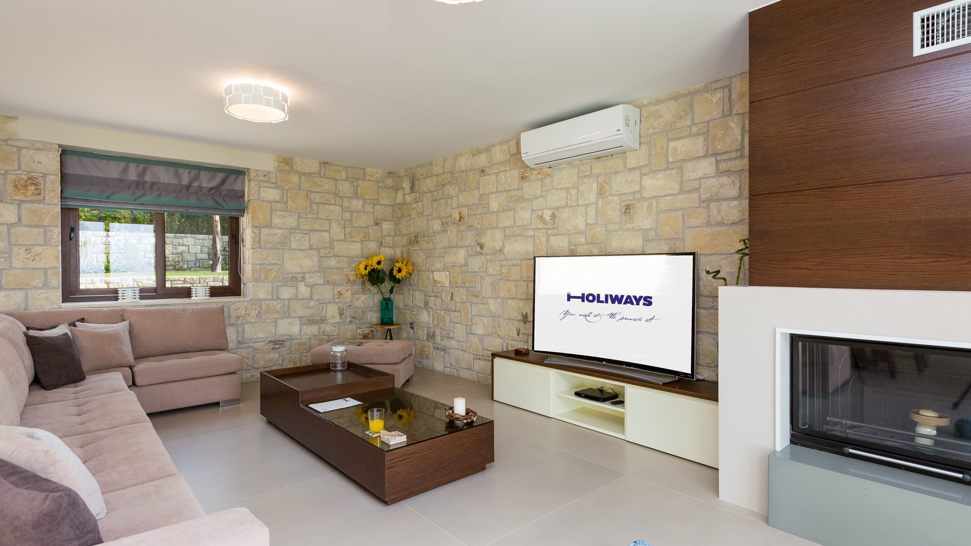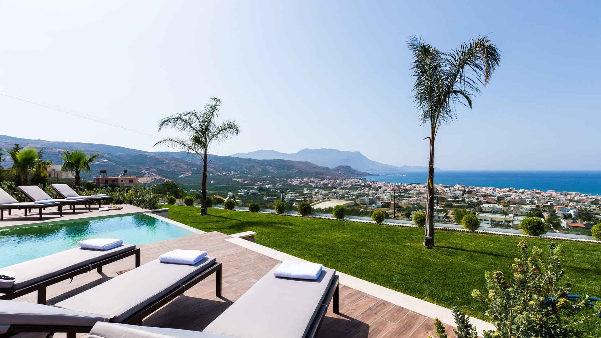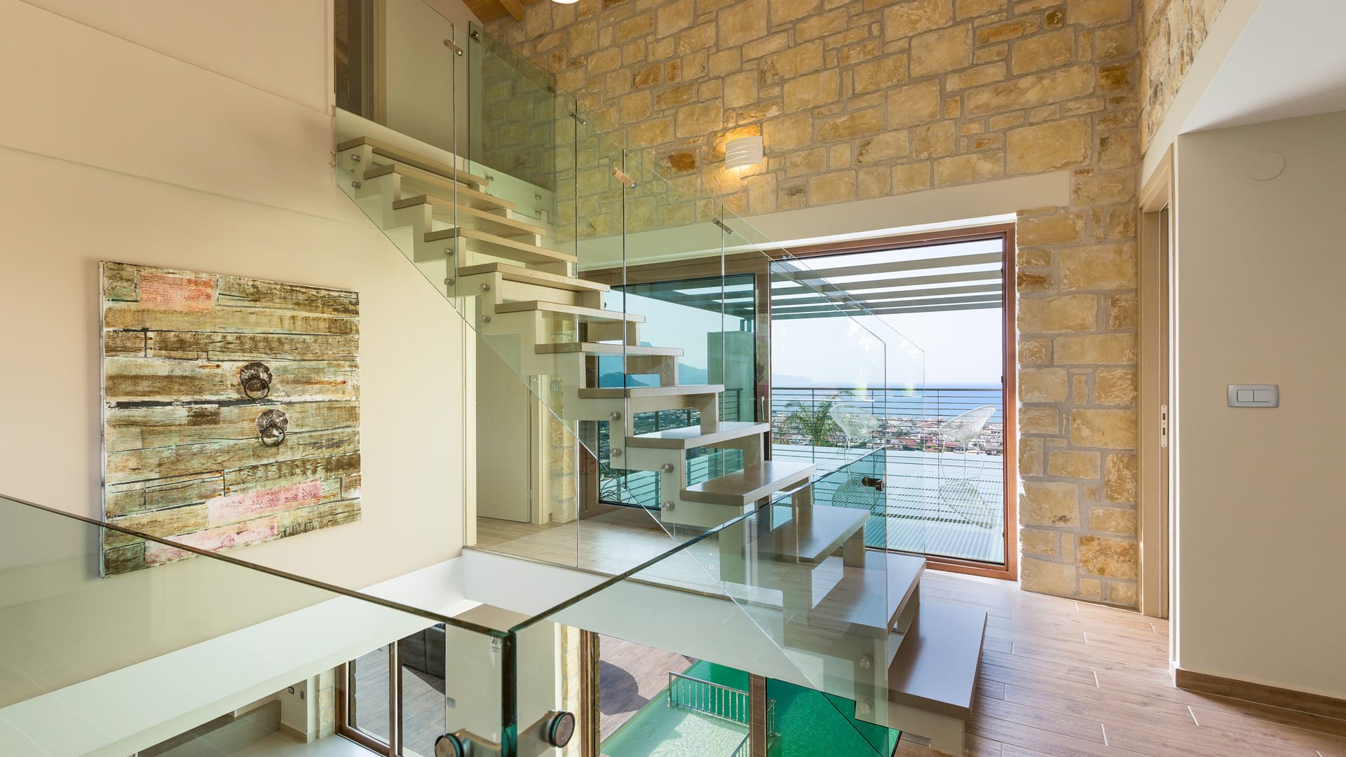 Villa Bretta is located on a hill and it offers you an amazing view not only during the day but during the night as well when the city lights add some extra spark of romance to the already magnificent atmosphere. On the ground floor, you can find the pool area with a heated pool of 40. a fully equipped kitchen, an internal living room with a salon, a satellite LG curved 65’’ TV and a dining table area for 10 guests. On the same floor, there is a bedroom that features a private entrance with a double-size bed and a communal bathroom. On the upper floor, there are two bedrooms with double-size beds, satellite TV, and an ensuite bathroom. Another bedroom with twin single beds exists on the first floor, with a satellite smart screen TV with an ensuite bathroom. On the attic floor, there is a bedroom with a king-size bed with a satellite smart screen TV, that offers unobstructed views of the sea of Crete from each corner, welcoming esteemed guests to relax and sleep in complete privacy. There is a continuity between indoor and outdoor spaces which provides a space full living area that accommodates all the activities throughout the day. All areas inside have to be air-conditioned. the very best room in the Villa.