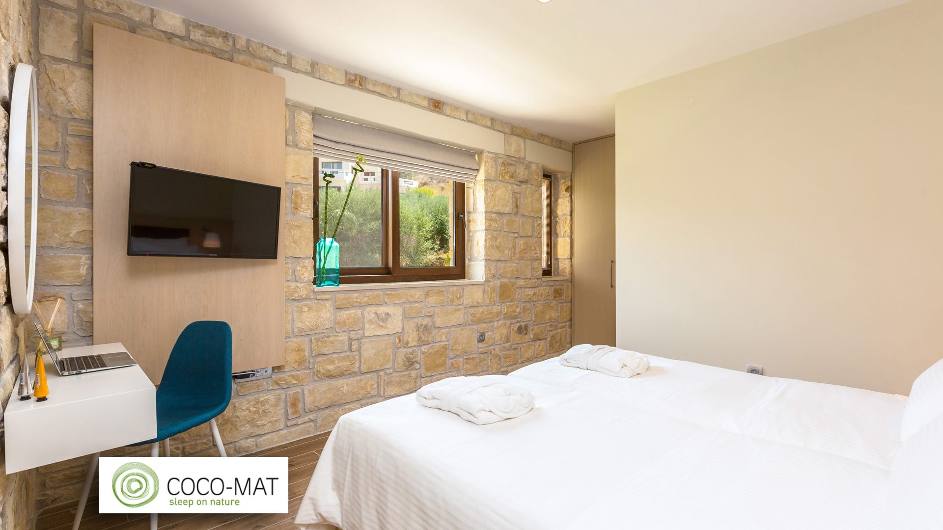 Bedroom 2: Twin size beds (0.80x2.00) by Coco-Mat, A/C, 32’’ Satellite TV, ensuite bathroom with shower