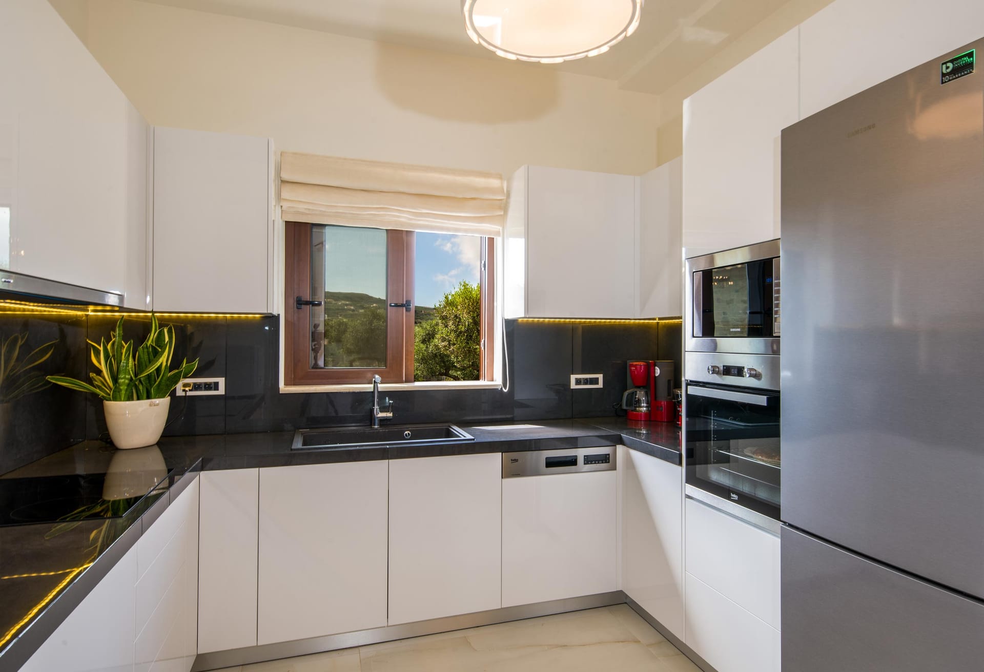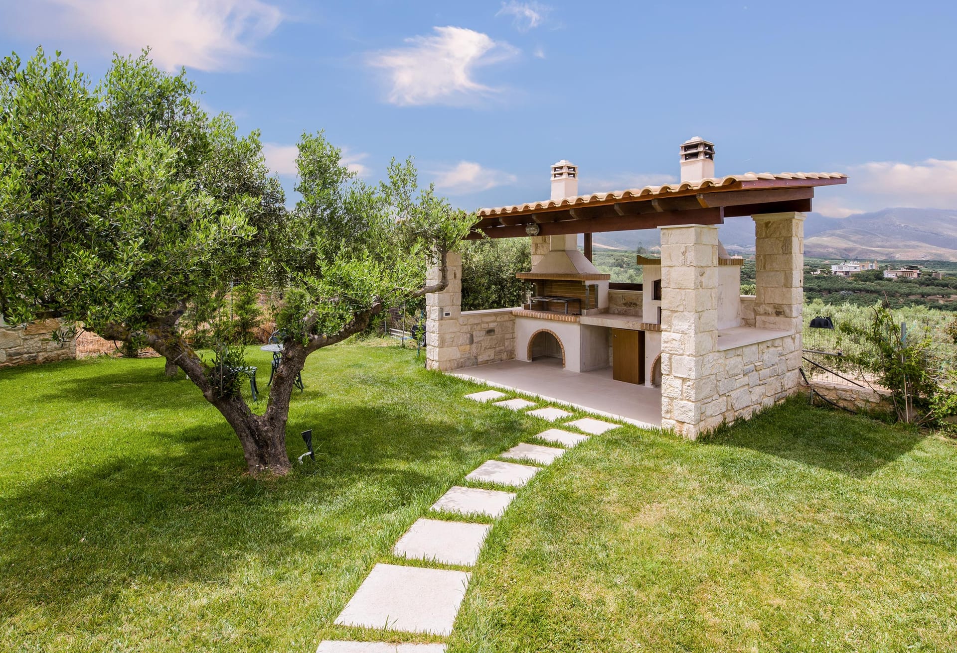 Outside, a sprawling grassy courtyard beckons with mesmerizing sea vistas. Immerse yourself in the refreshing embrace of the 60 sqm private pool, surrounded by sun loungers, umbrellas, and a fragrant garden boasting fruit trees and aromatic herbs. Indulge your culinary desires at the barbecue corner.