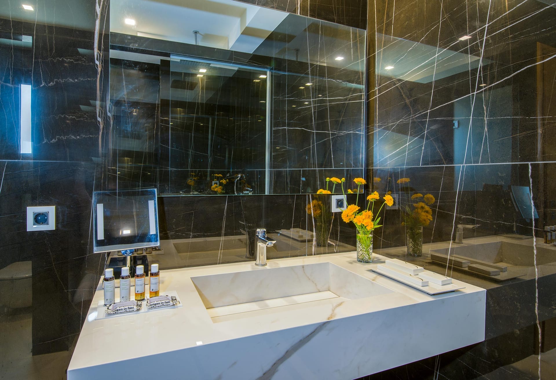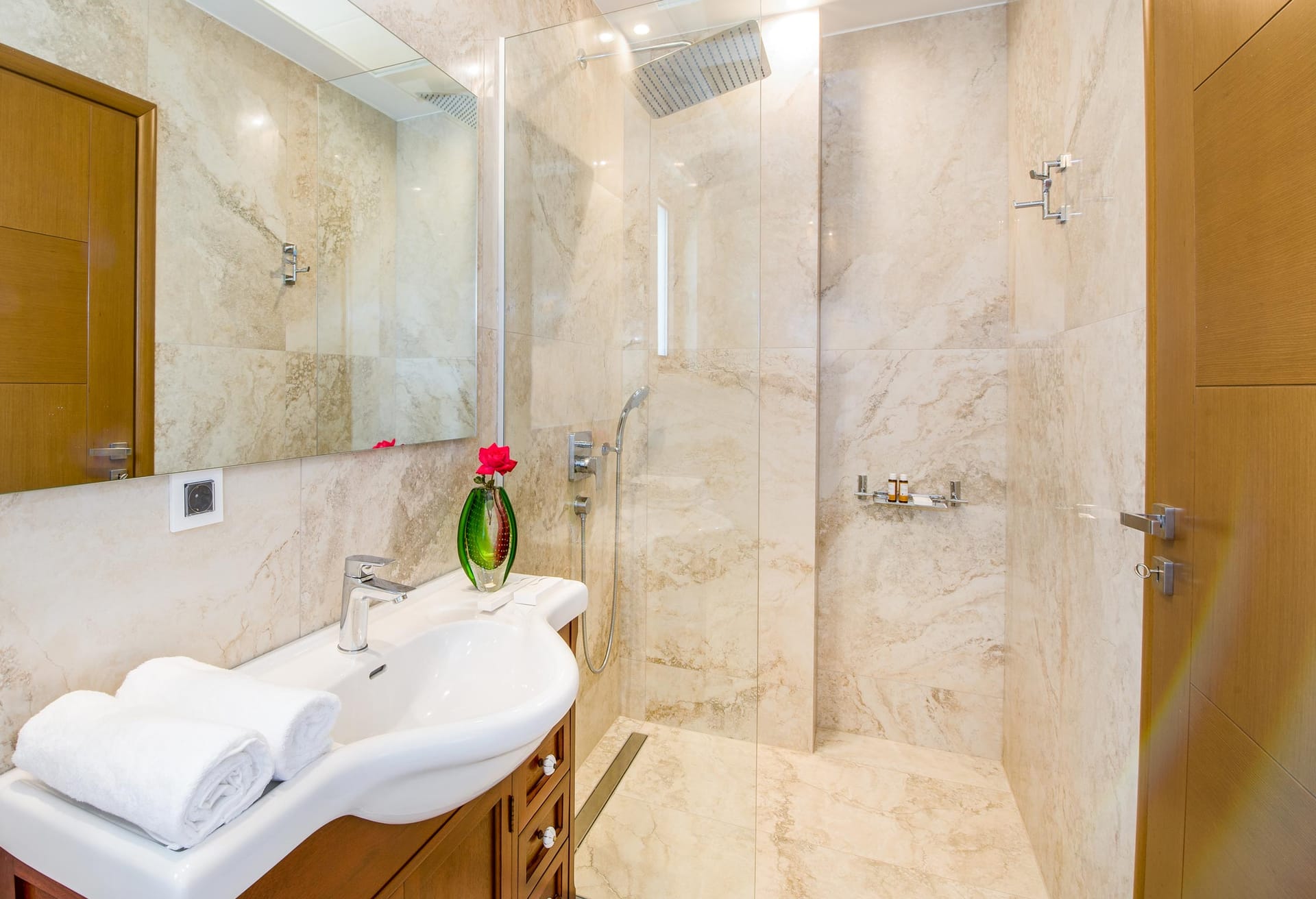 Ascending to the upper floor, revel in the luxury of two bedrooms, each accompanied by its own en-suite bathroom. The master bedroom exudes elegance with its double bed, office space, indulgent bathtub, and private WC, while a twin bedroom offers versatile sleeping arrangements and an en-suite shower.
