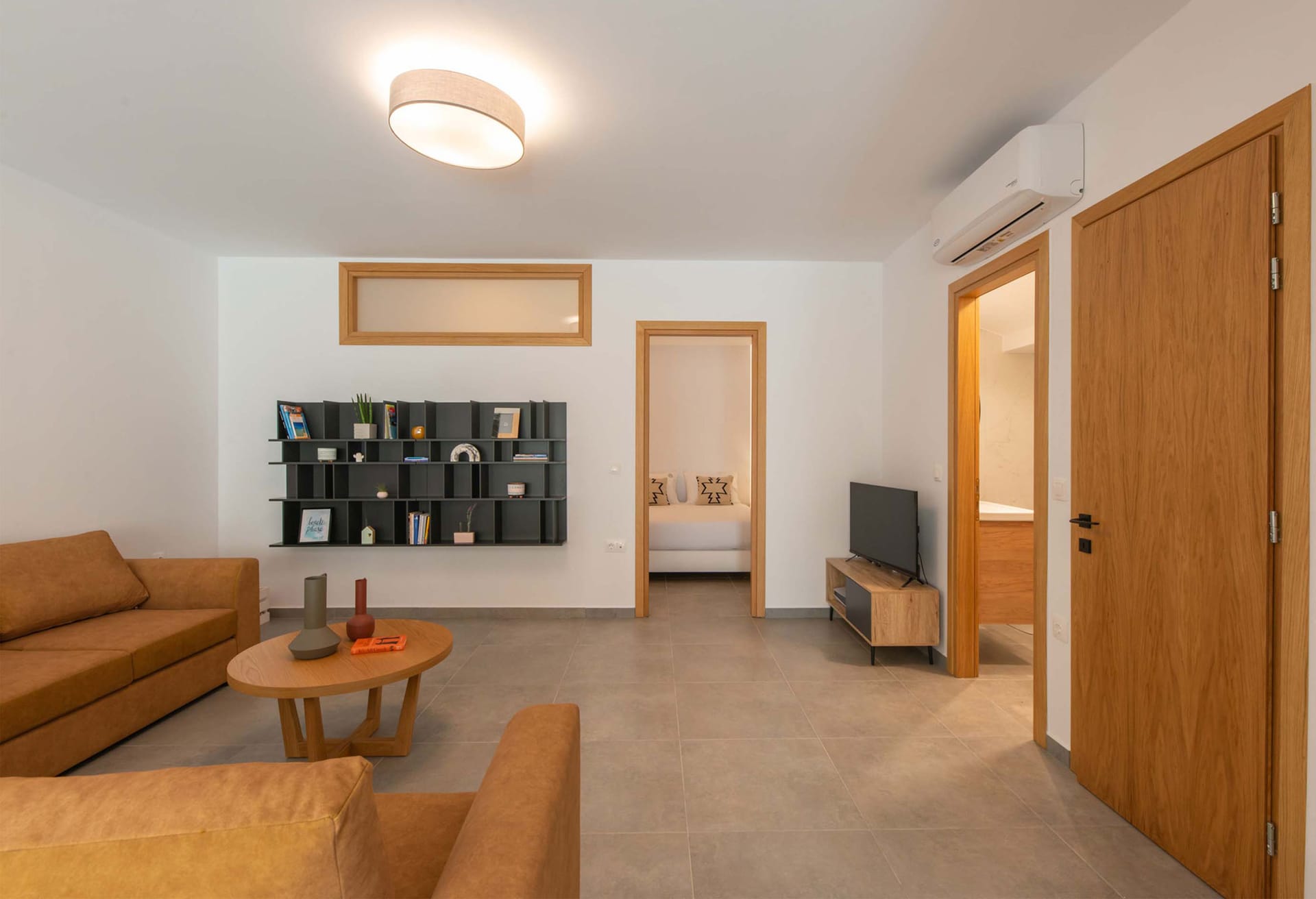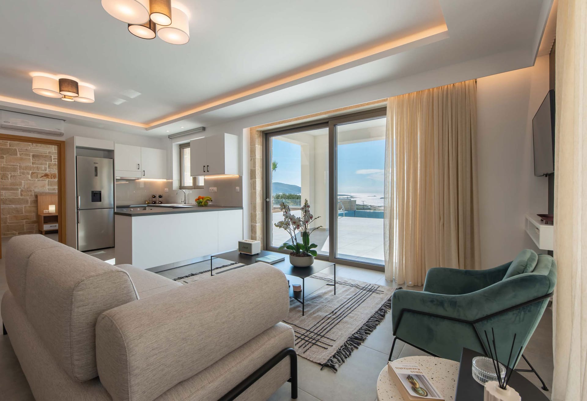 - Living area with sofa, 43’’ Smart Satellite TV, access to the pool terrace, sea view