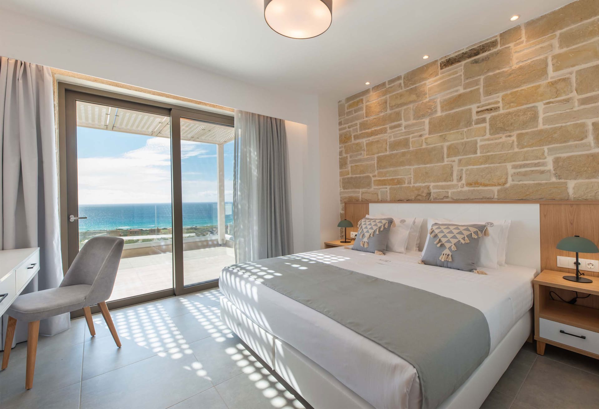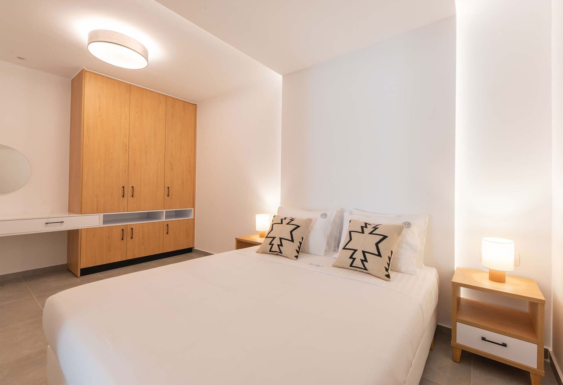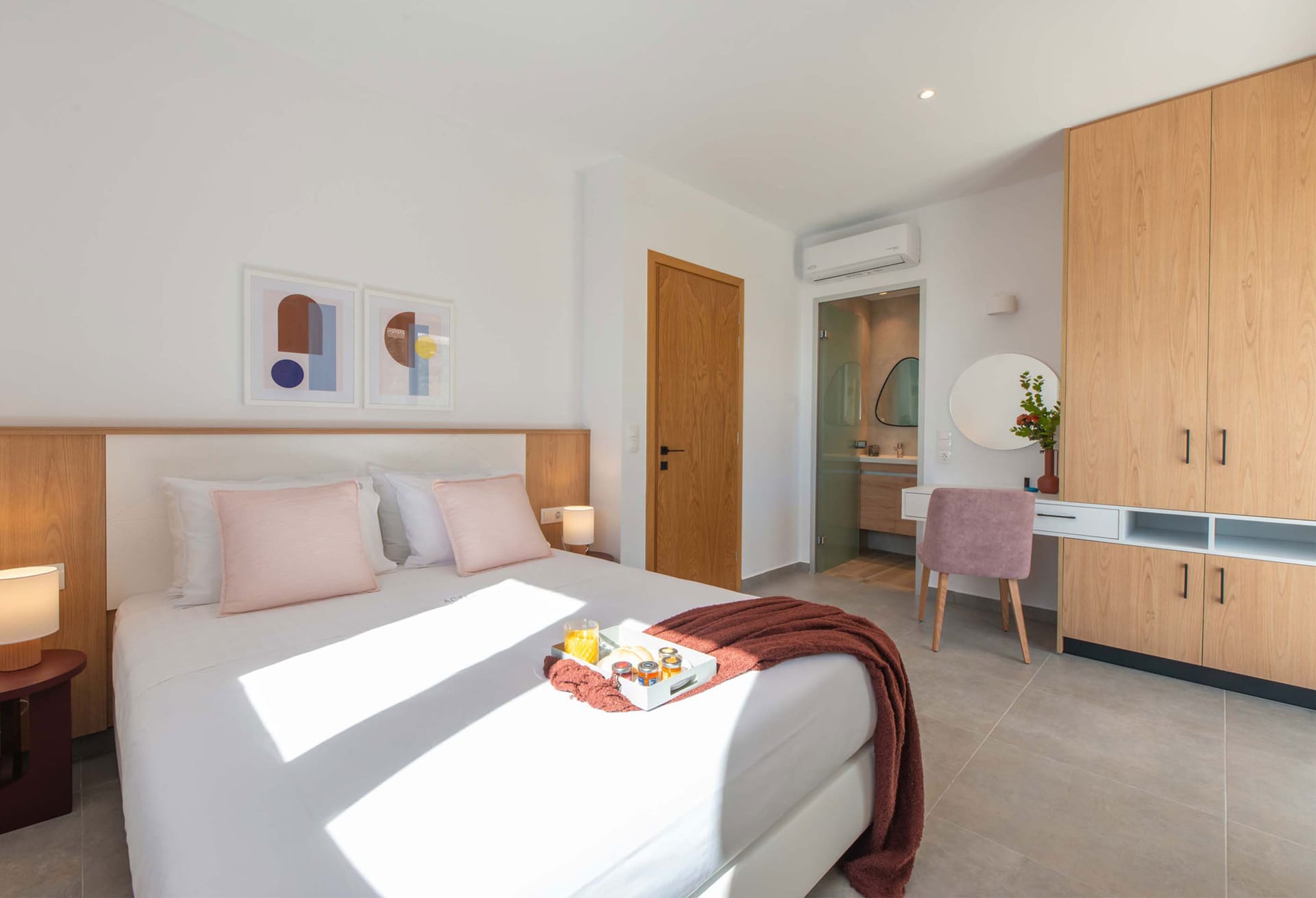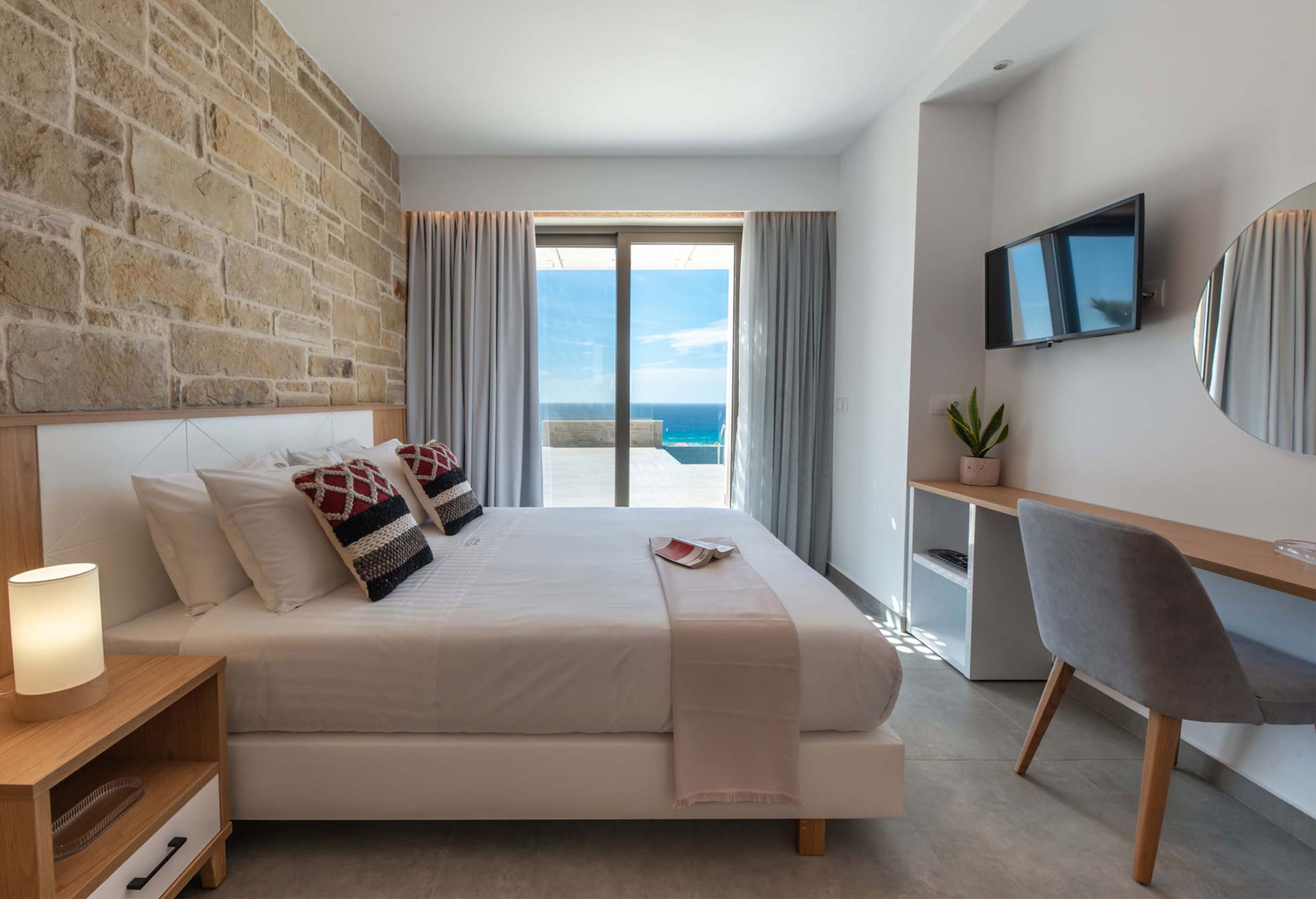 - Bedroom 1: Queen-size bed (1.60x2.00), A/C, 32’’ Smart Satellite TV, ensuite bathroom with shower, hairdryer, pool access, Seaview