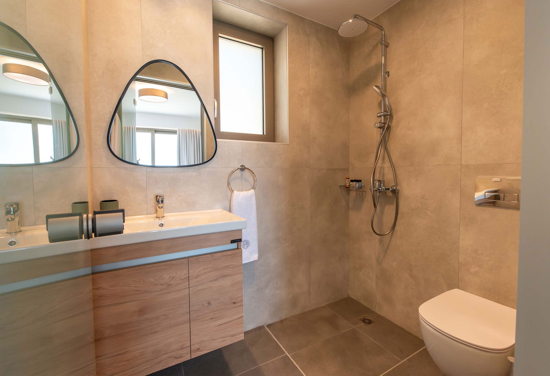 - Bedroom 2: King-size bed (1.80x2.00) that can be converted into twin-size beds, A/C, ensuite bathroom with shower, hairdryer, private balcony, Seaview