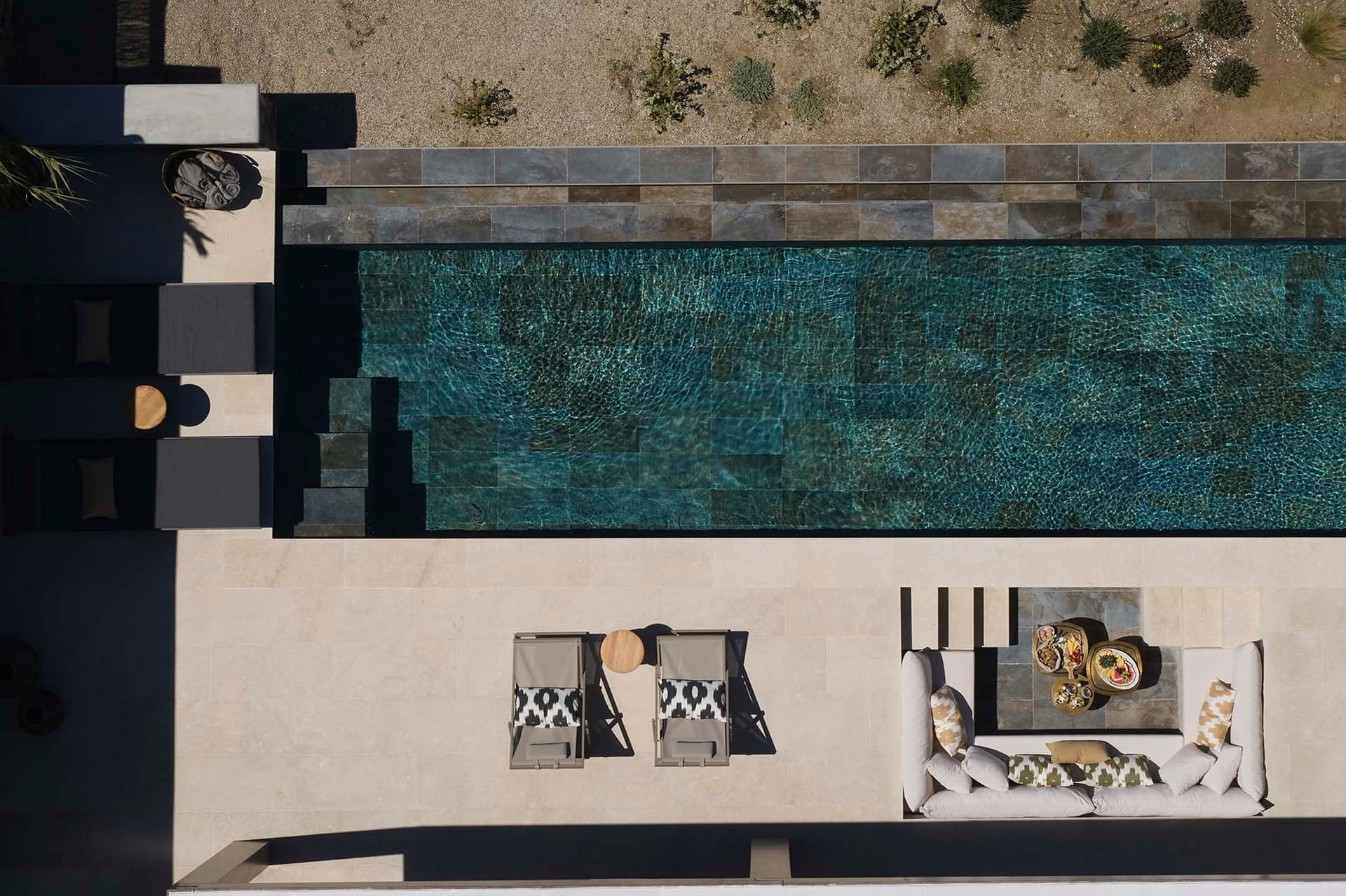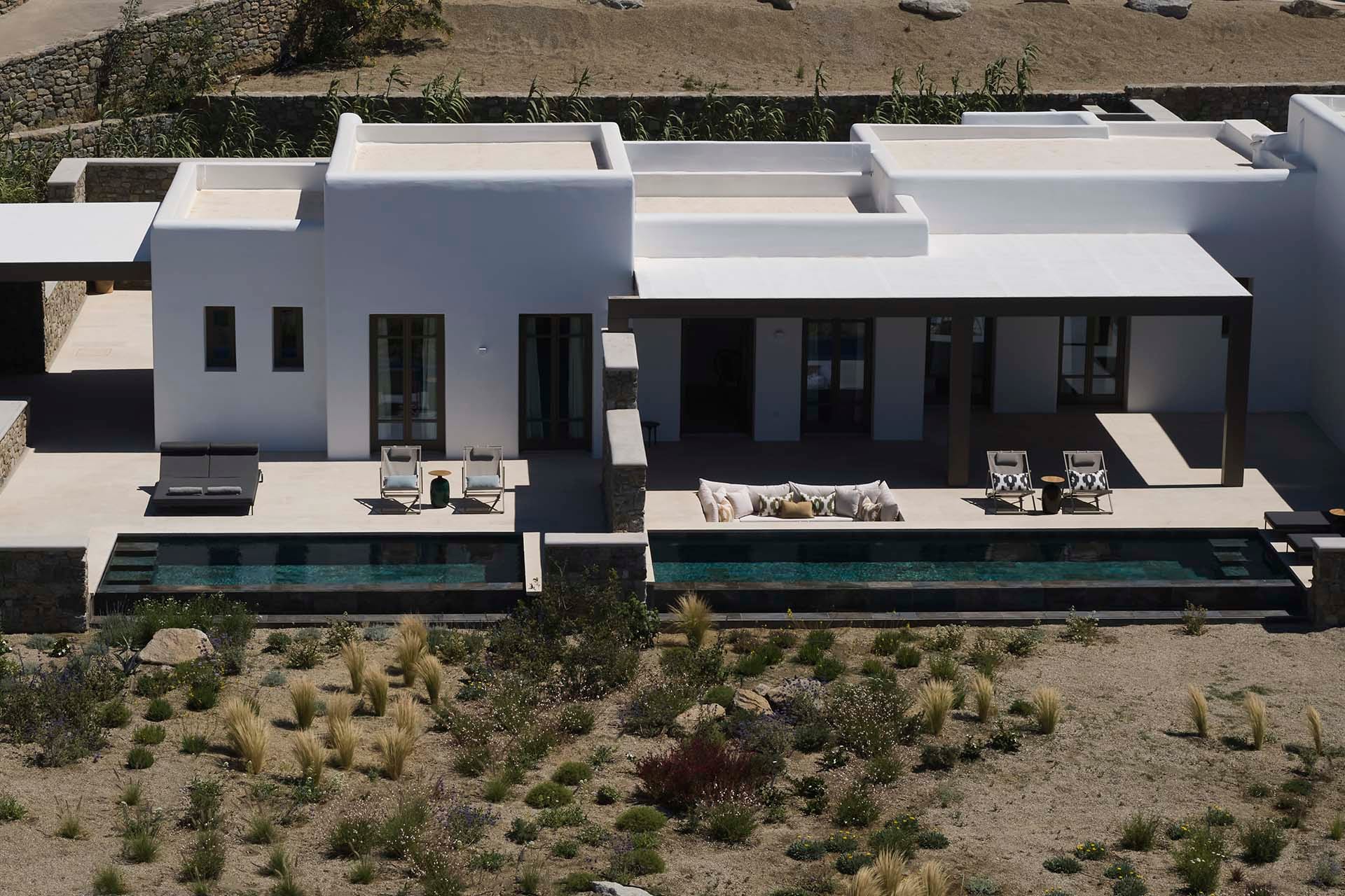 The Villa is built following the typical Aegean architectural style. It harmoniously combines neo-classical forms with arches and rounded edges at the walls, together with modern elements all together resulting in a dreamlike setting.