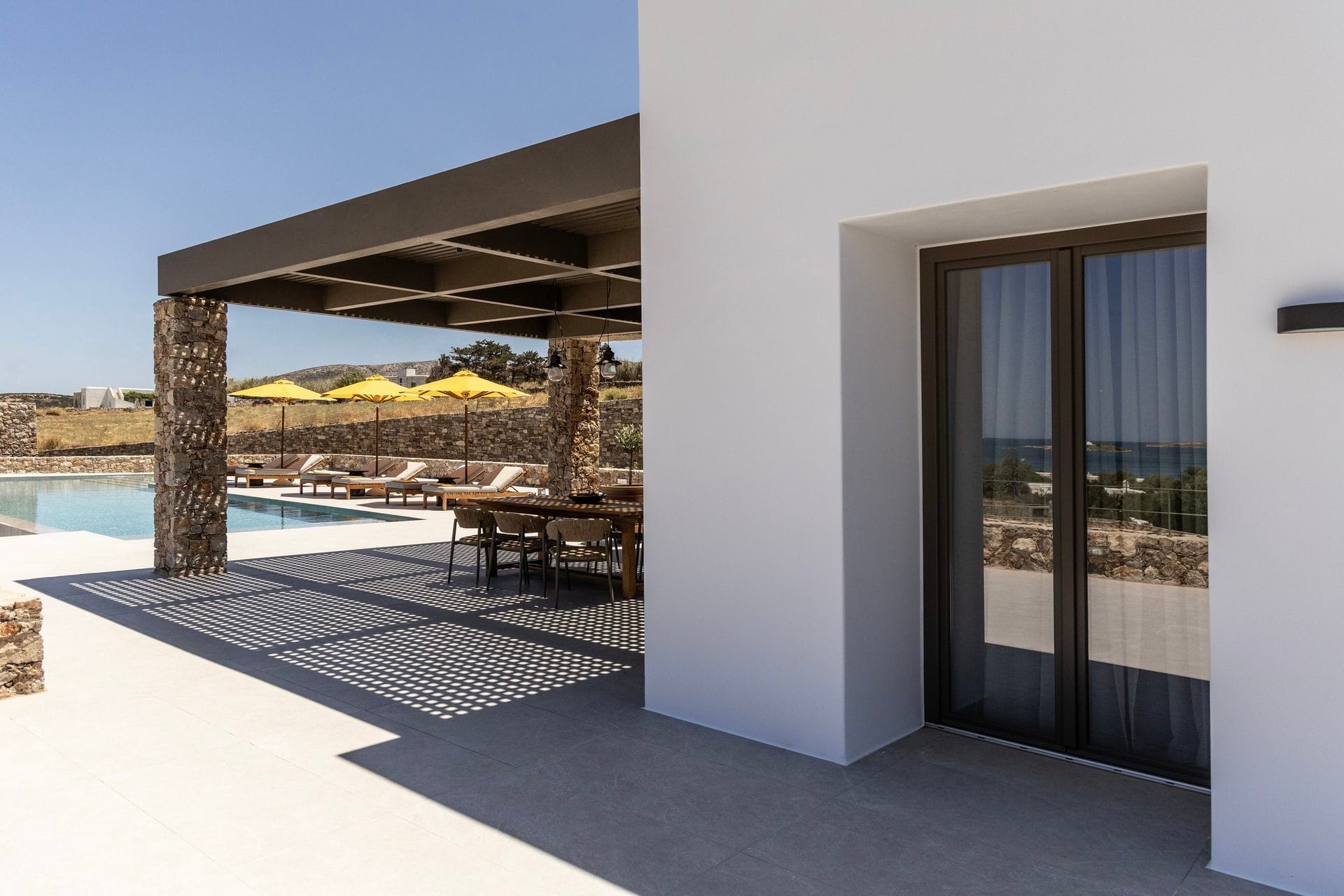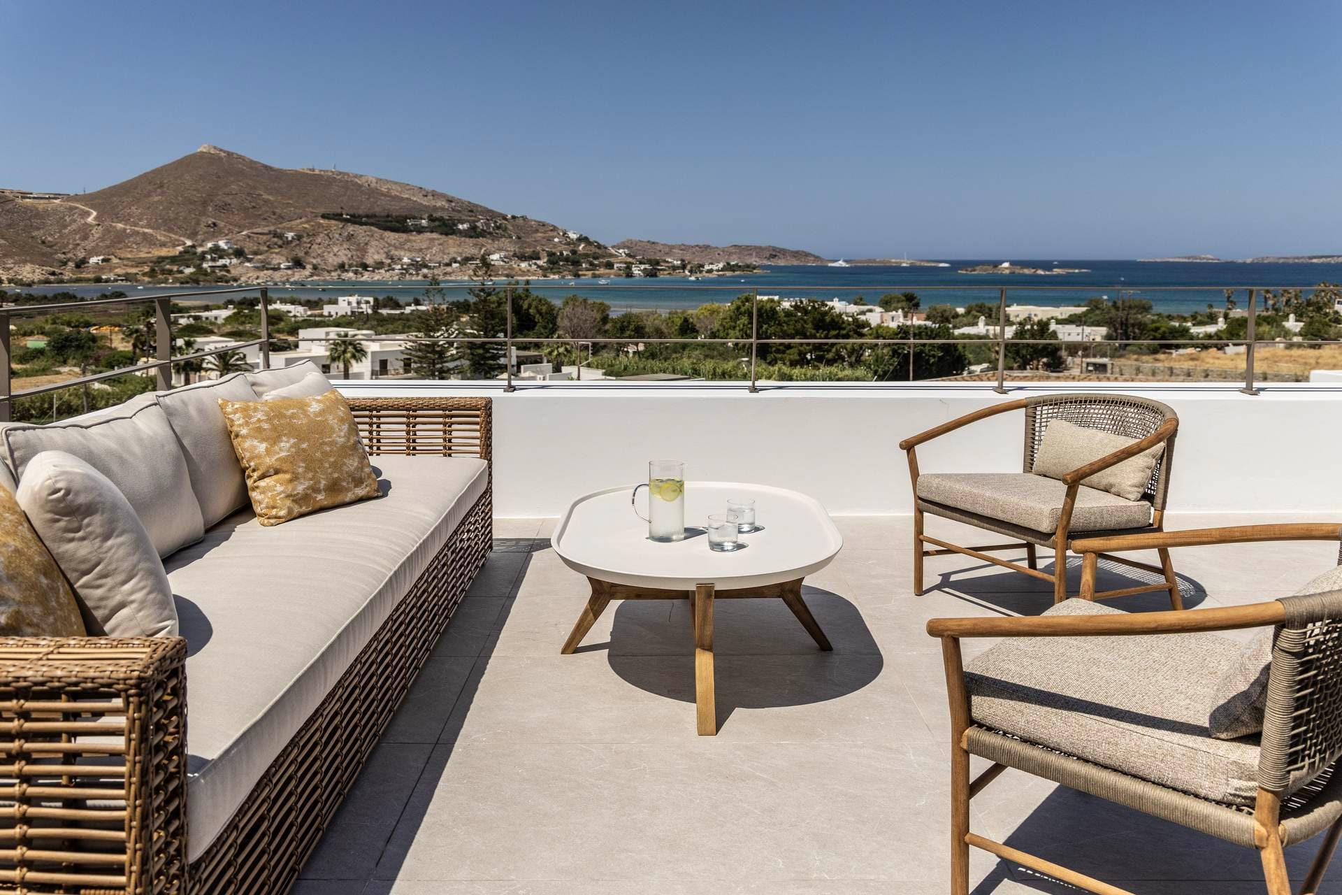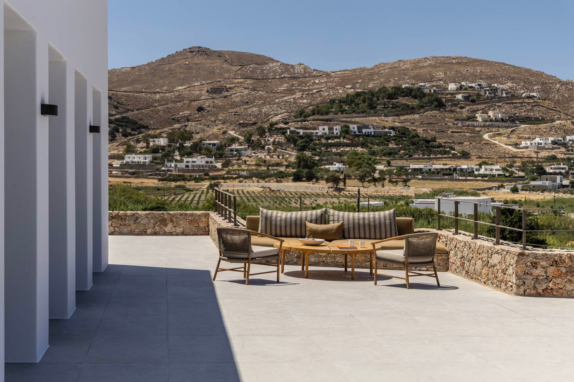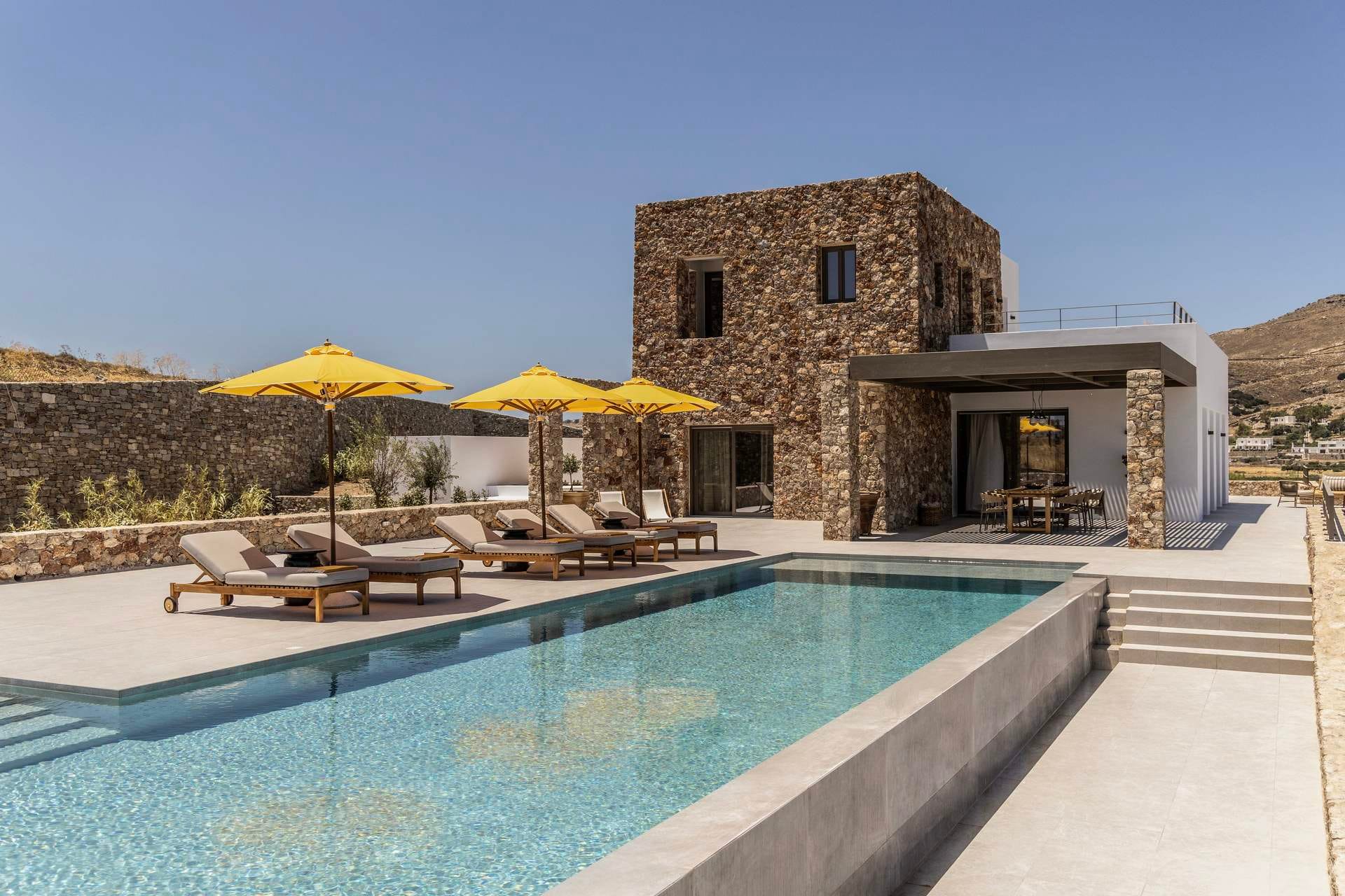 Villa Ouranos Ostria is a mixture of modern art and the traditional architecture of Cyclades. Characteristic of Villa Ouranos Ostria are the curves and the circular ends that add an elegant touch. This stylish and tastefully designed volla complex appeals to all tastes and preferences, making your stay here memorable.